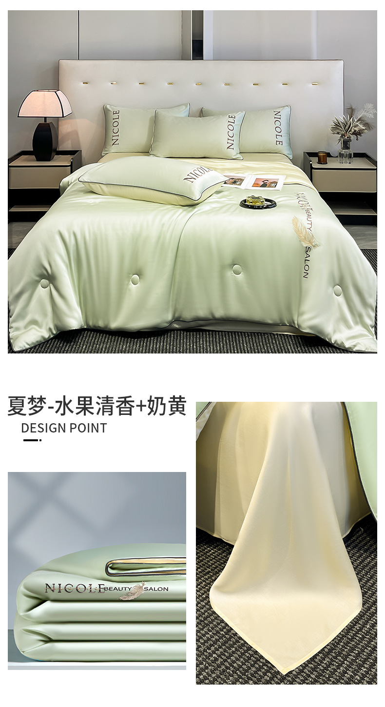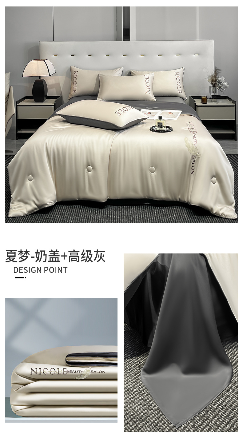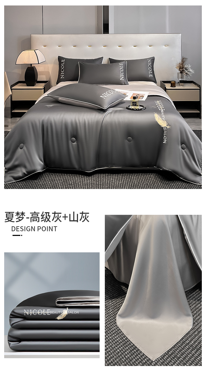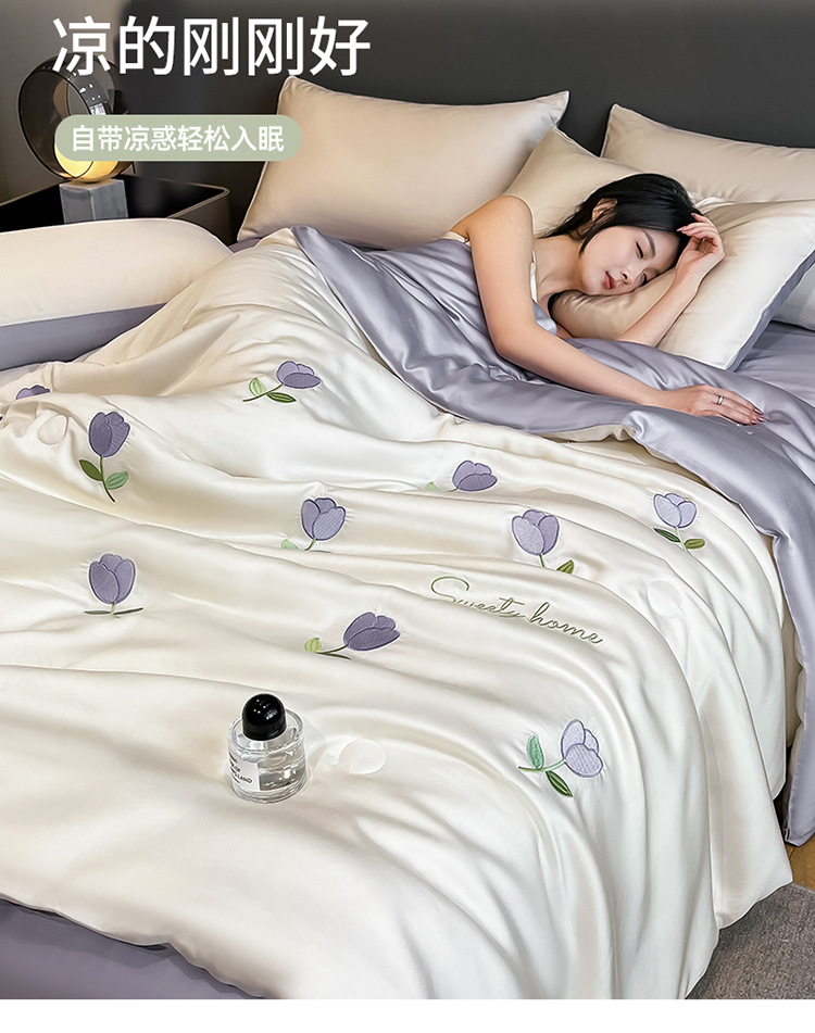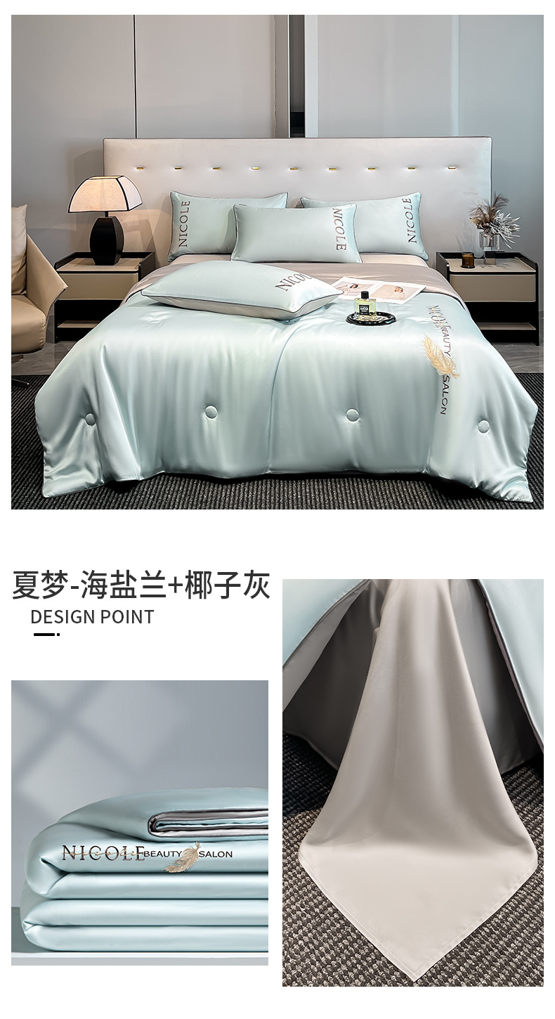 A급 여름 이불 아이스 실크 여름 이불 4종 세트 누드 수면용 실크처럼 부드러운 텐셀 자수 워시블 더블 에어컨 이불 얇은 이불
