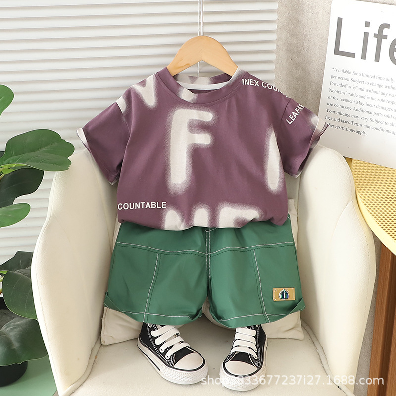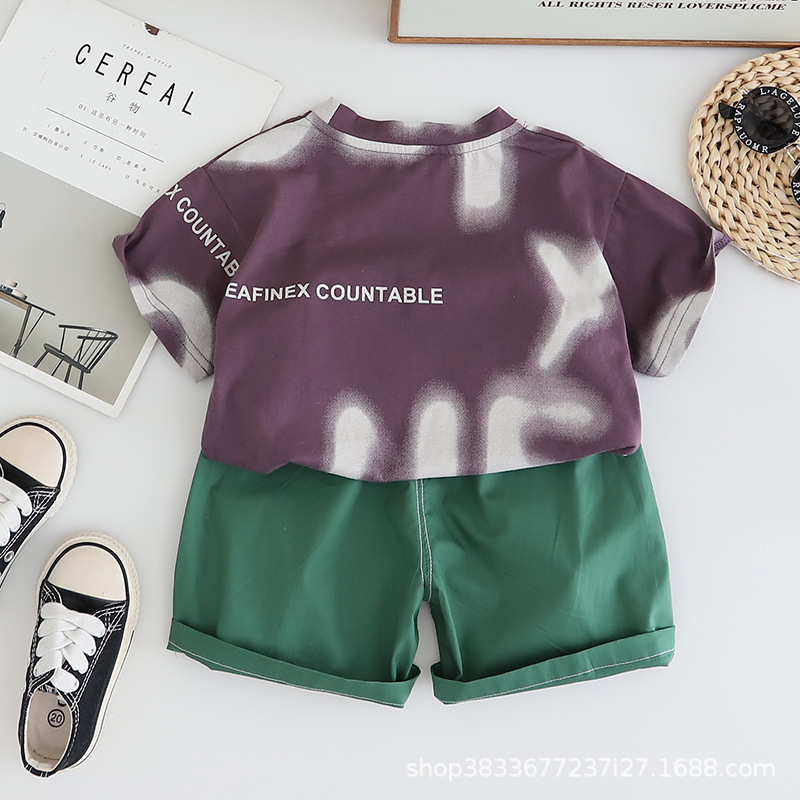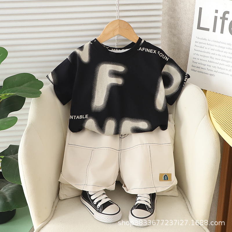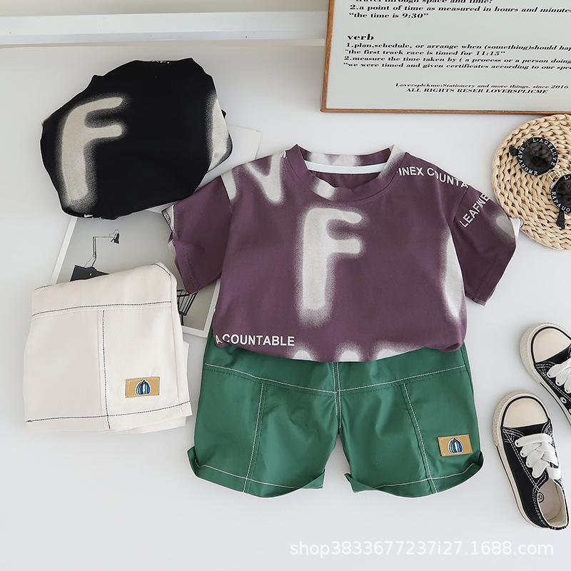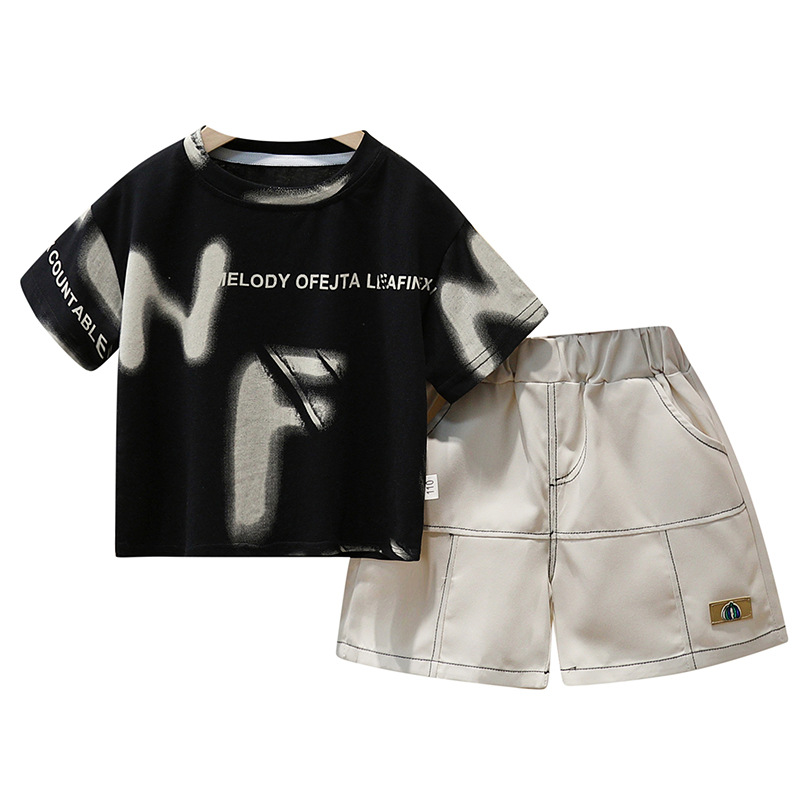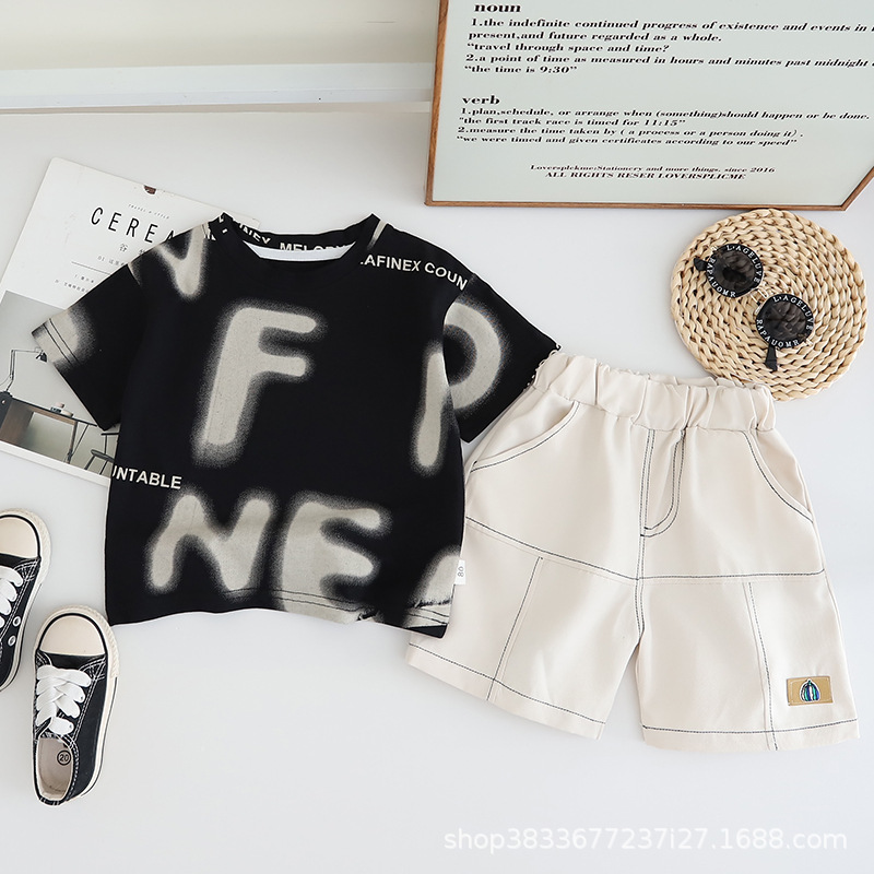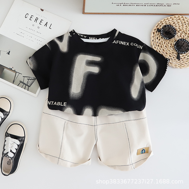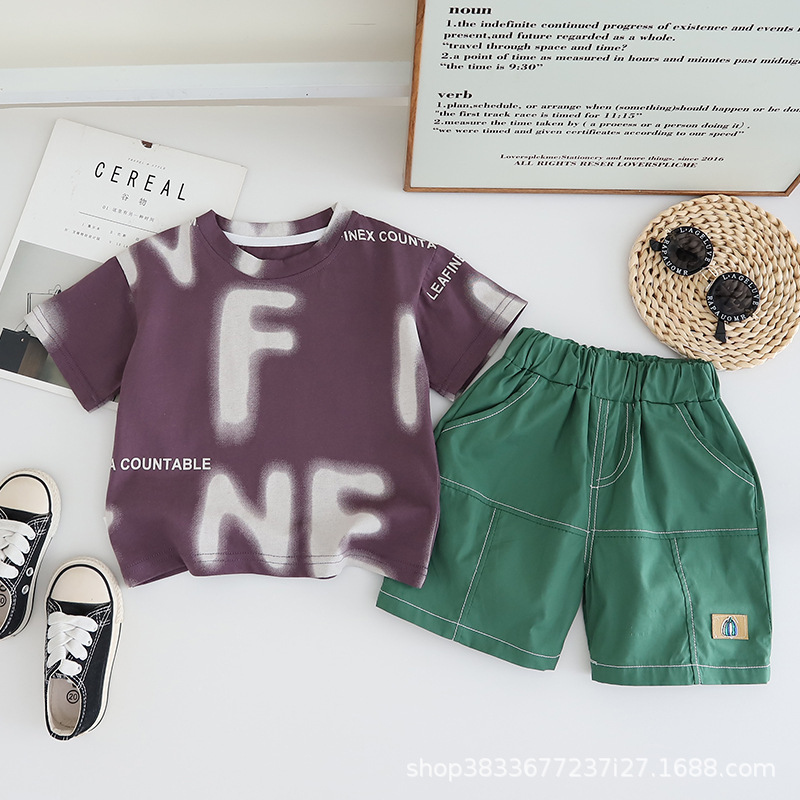 공장 직접 아동복 소년 여름 세트 어린이 영어 인쇄 짧은 소매 반바지 투피스 얇은 아동복스토어 가기
