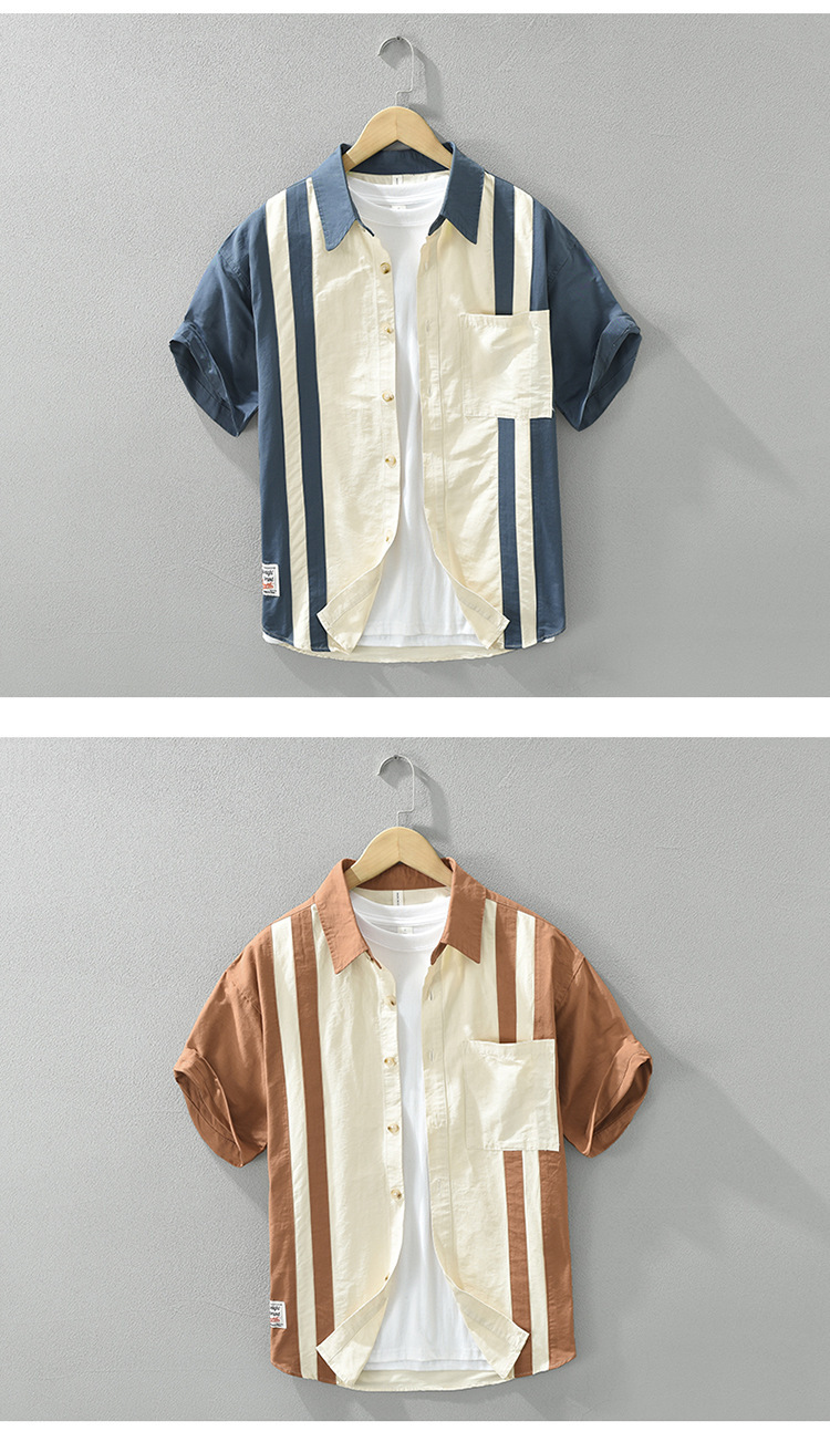 명암 컬러 바느질 단색 짧은 소매 셔츠 남자의 여름 일본 스타일 레트로 트렌디 브랜드 캐주얼 셔츠 유행 루즈 탑 잘 생긴