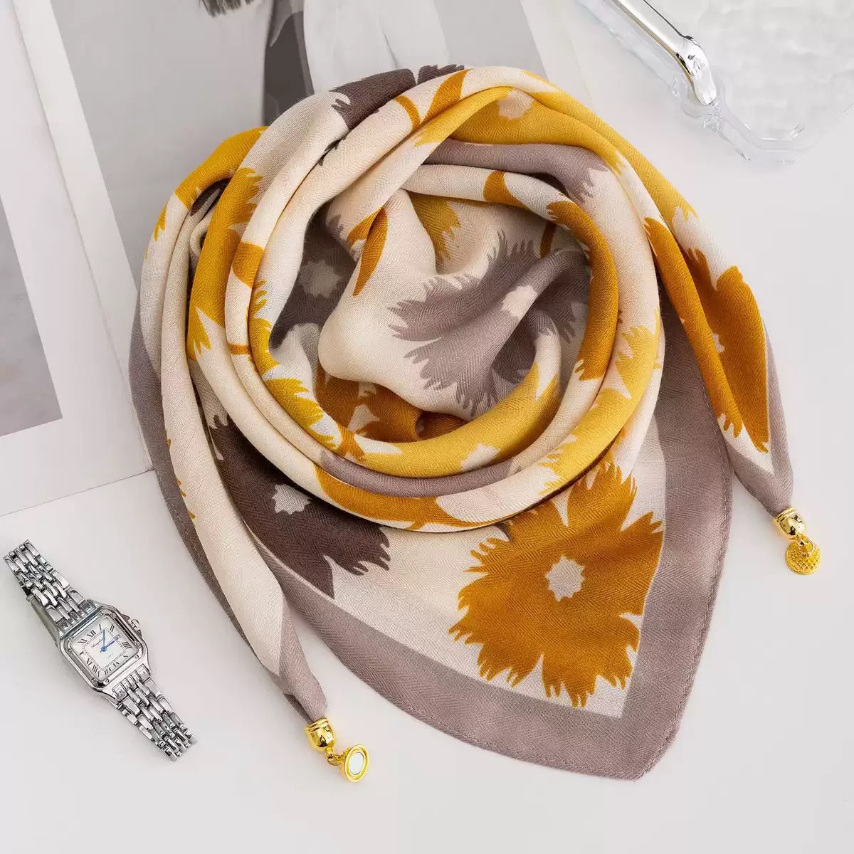 자석 버클 스카프, 봄철 여성용 실크 스카프, 고급스러운 자석 버클 넥 스카프, 코트와 함께 입는 넥 워머, 봄 가을용
