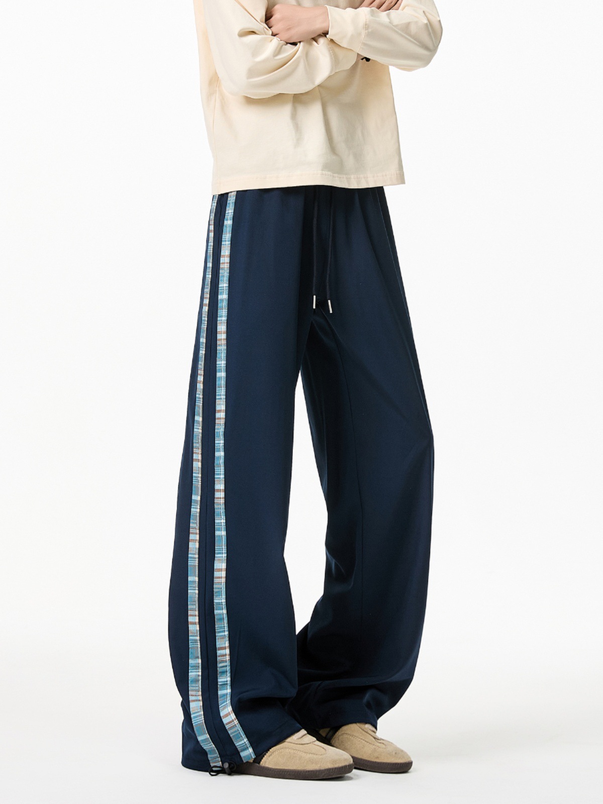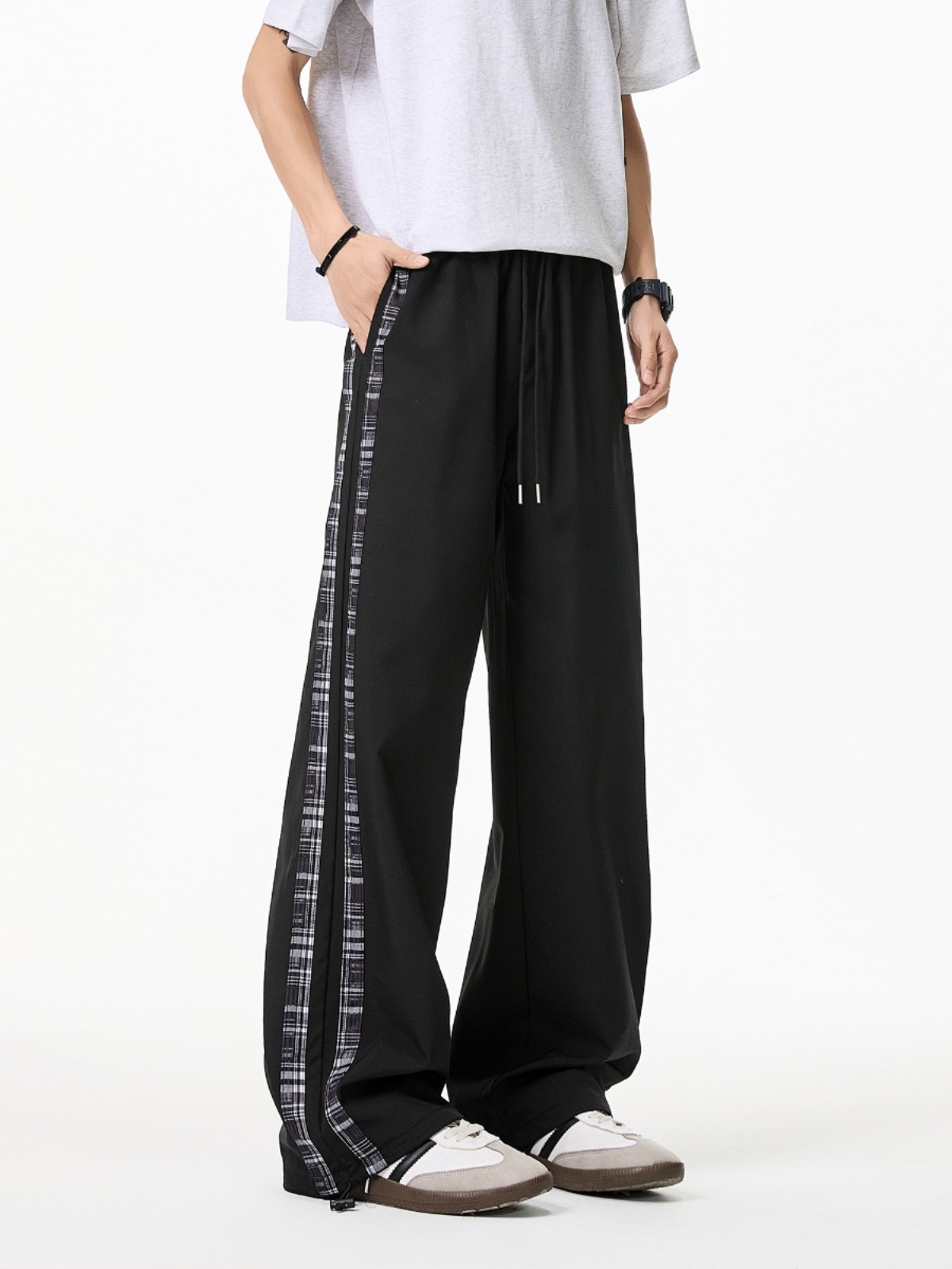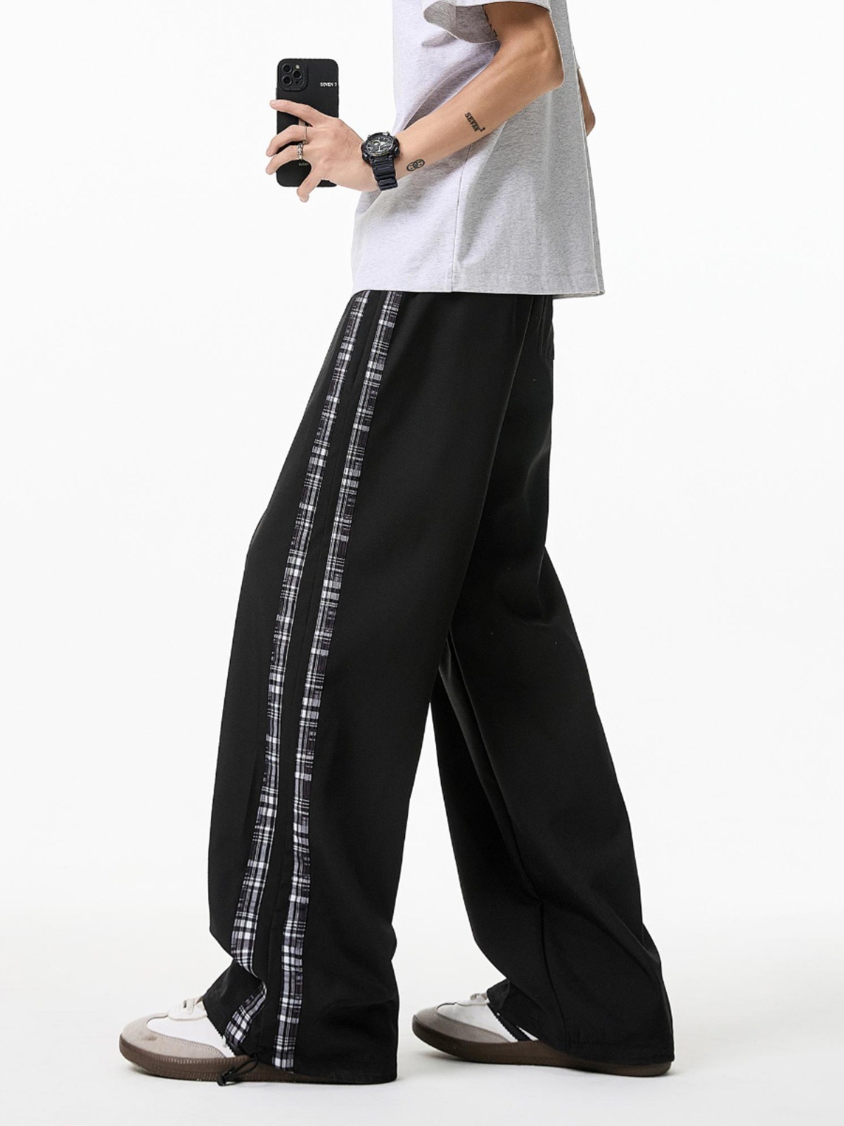 리본 격자 무늬 바느질 바지 남자 2025 봄 새로운 미국 무거운 유행 브랜드 느슨한 직선 캐주얼 스포츠 바지