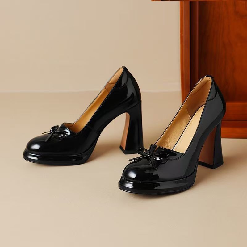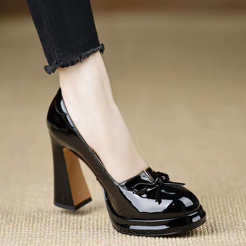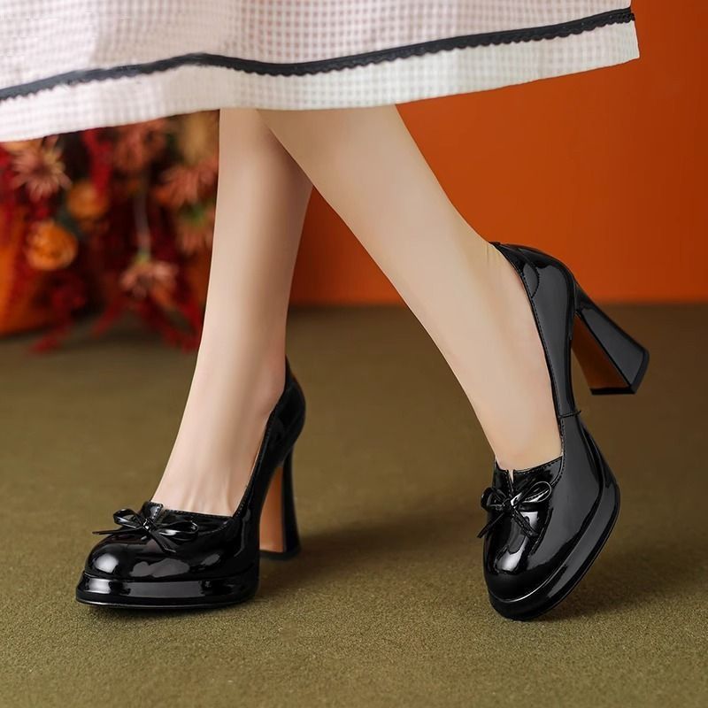 둥근 발가락 특허 가죽 붉은 두꺼운 뒤꿈치 하이힐 낮은 입 폭발 나비 메리 제인 신발 새로운 가을 2024스토어 가기