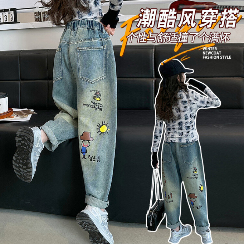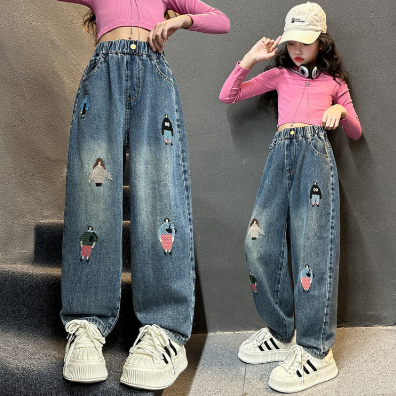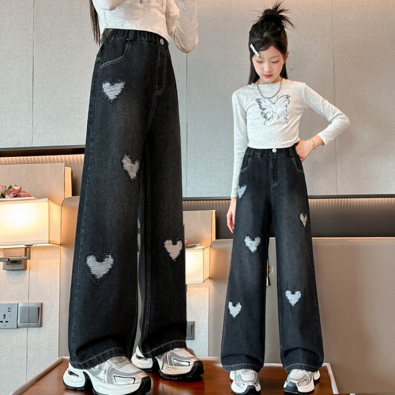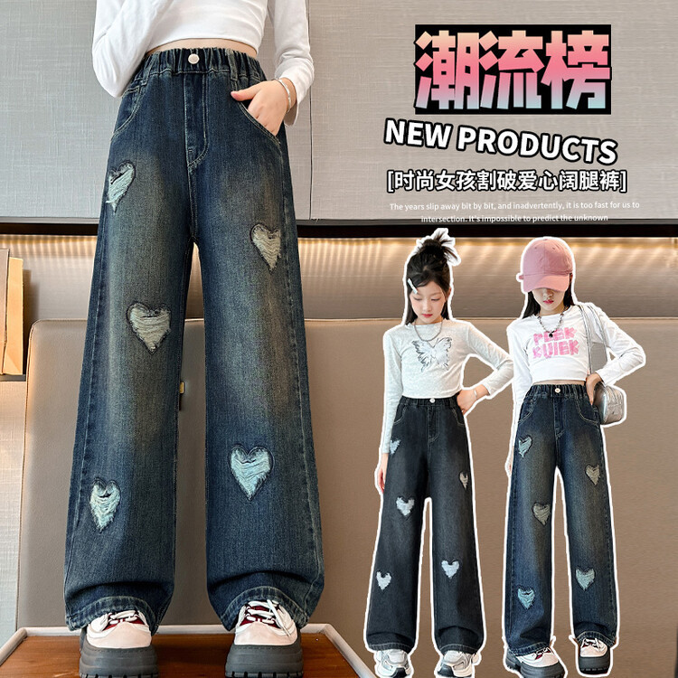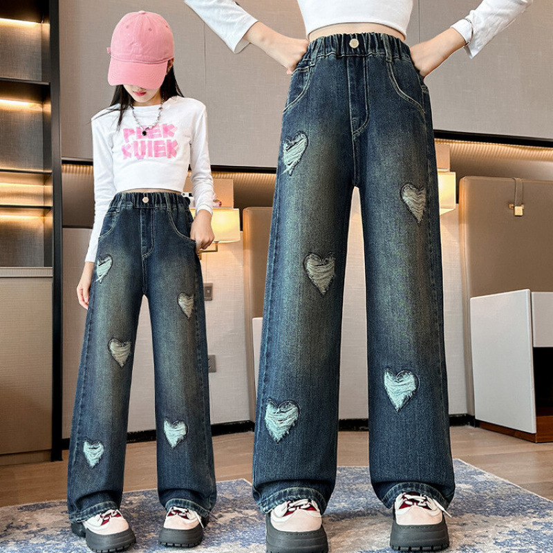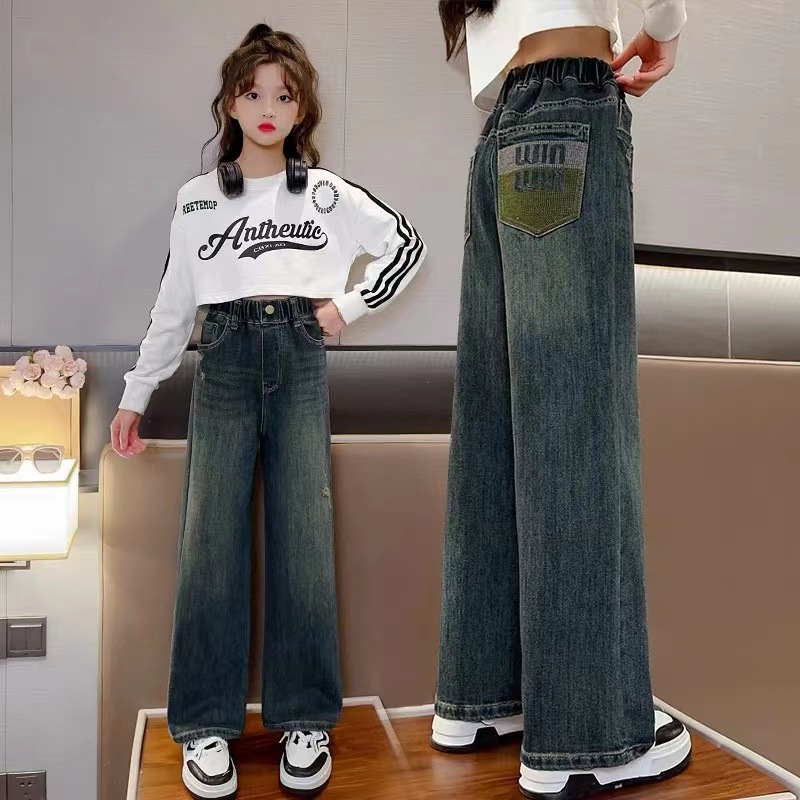 소녀 청바지 가을 2025 새로운 어린이 넓은 다리 바지 큰 어린이 느슨한 서양식 바지 봄과 가을 스트레이트 바지스토어 가기