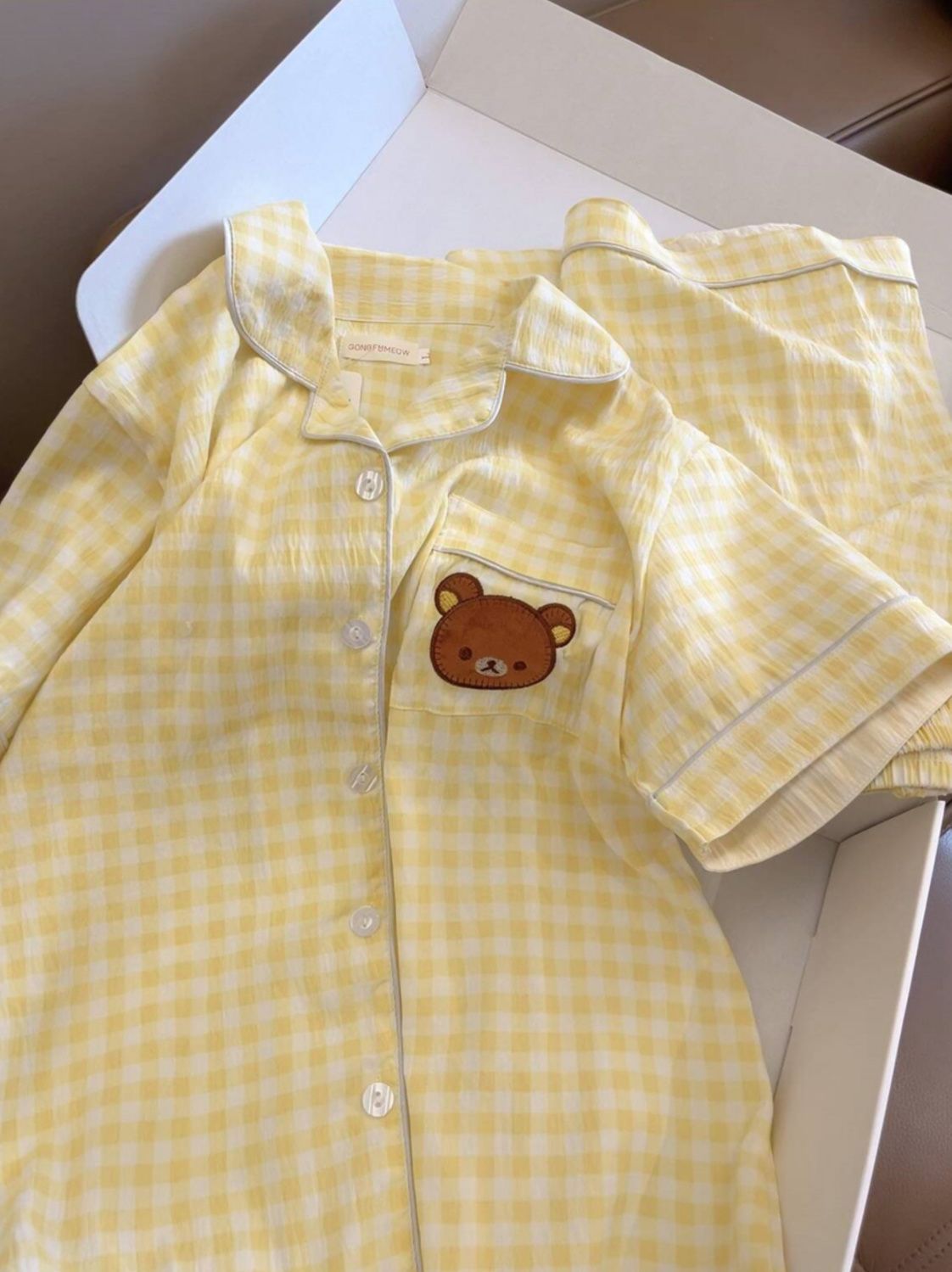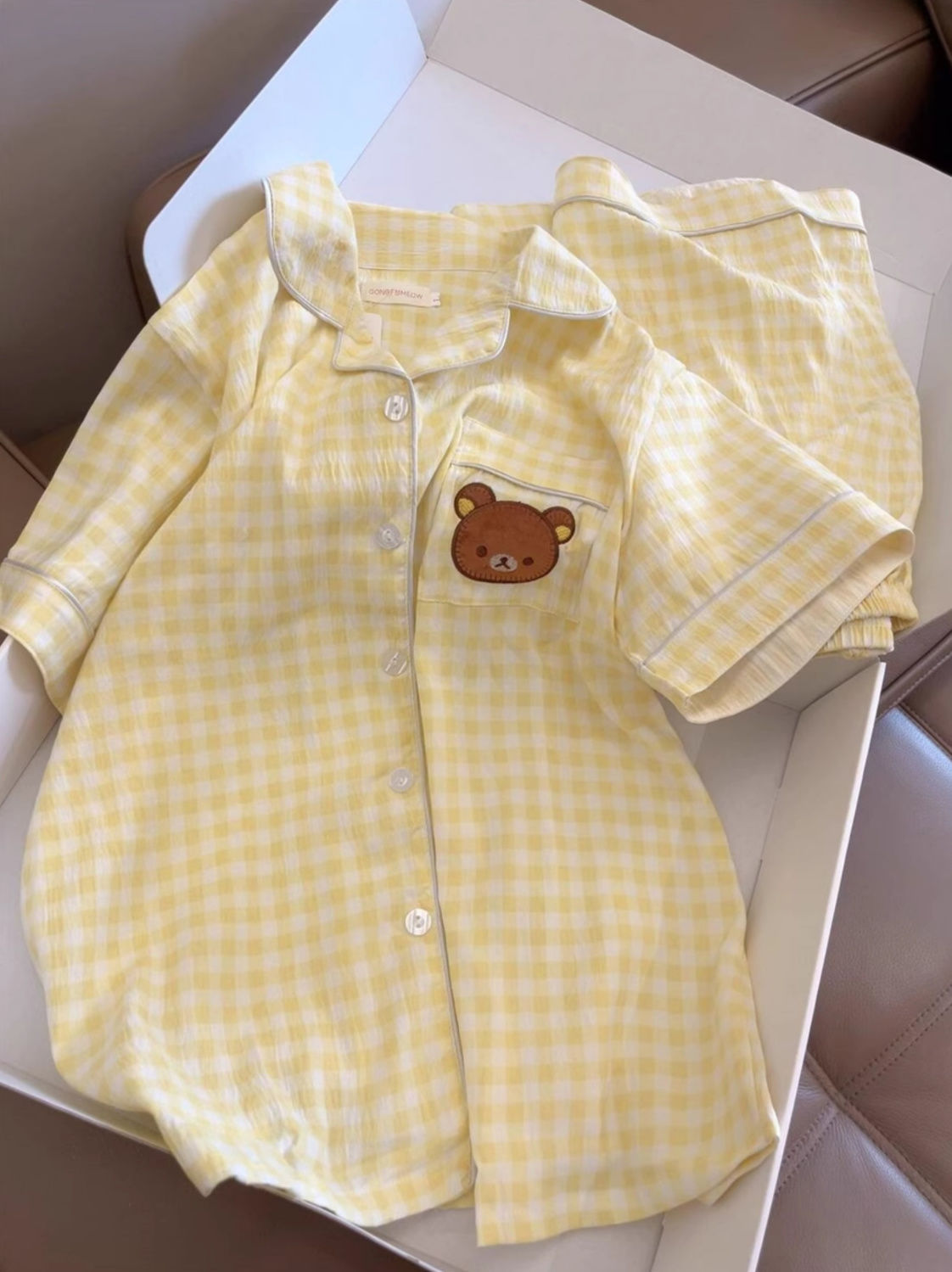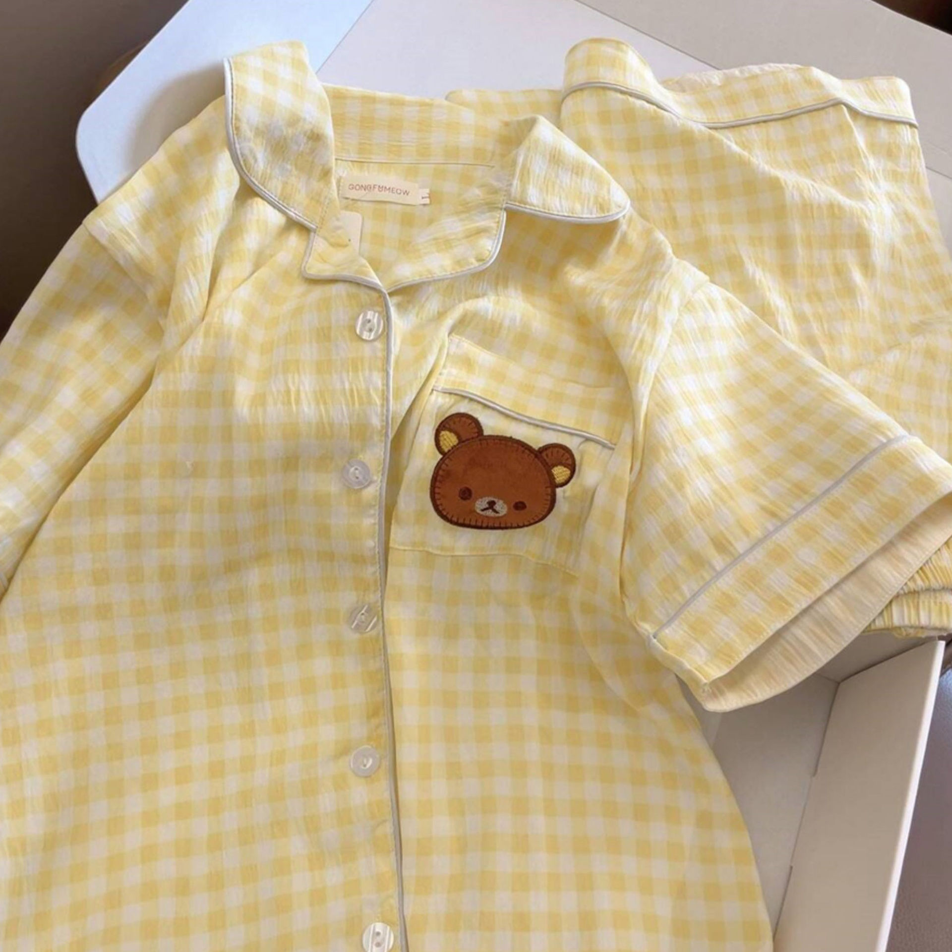 격자 무늬 경량 곰 잠옷 여성의 여름 새로운 반팔 반바지 Ins 일본식 귀여운 학생 홈 의류 외주