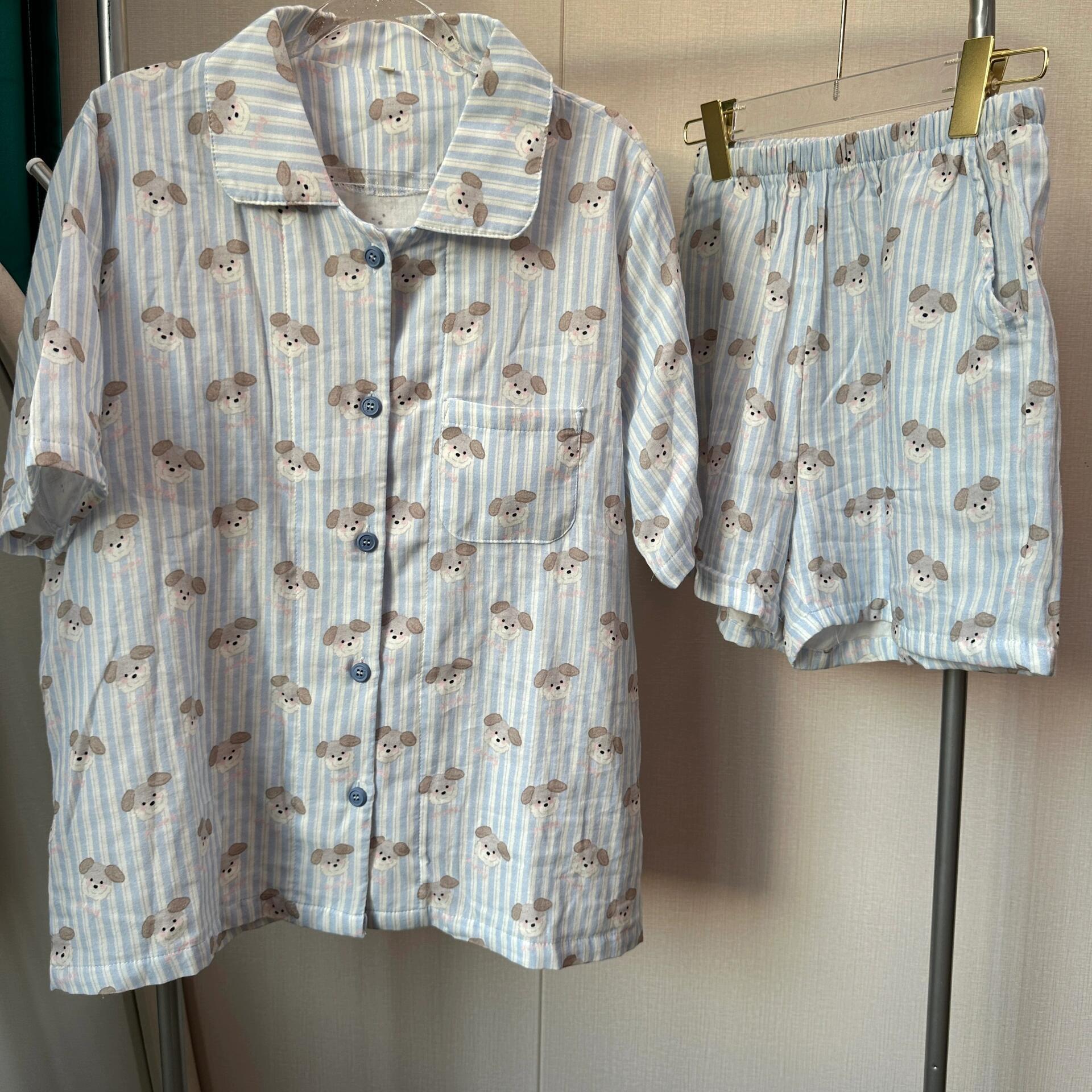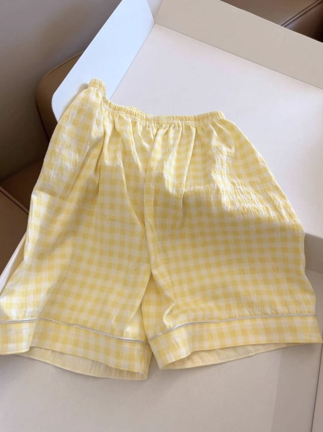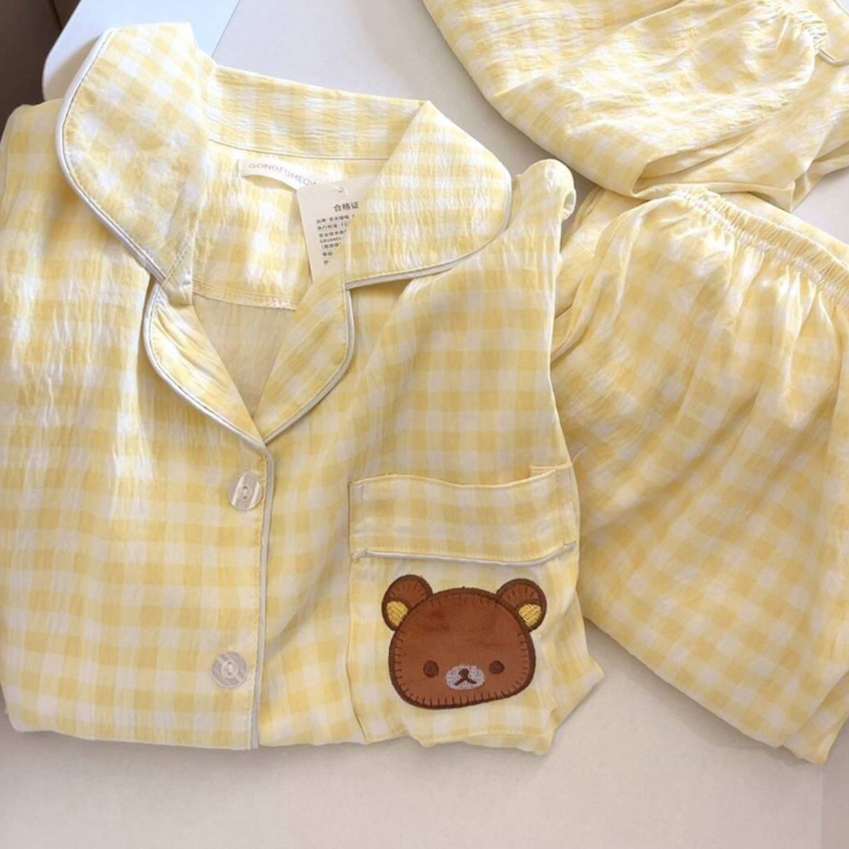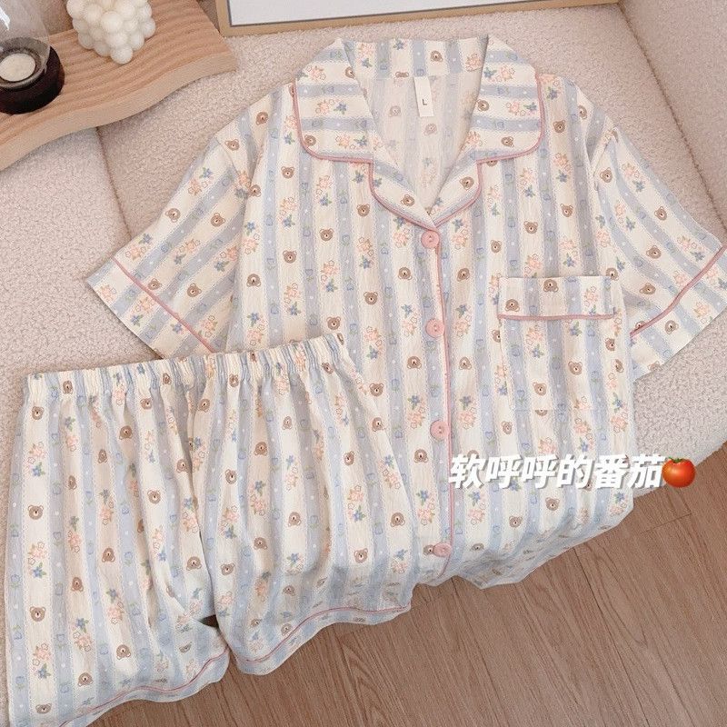 격자 무늬 경량 곰 잠옷 여성의 여름 새로운 반팔 반바지 Ins 일본식 귀여운 학생 홈 의류 외주