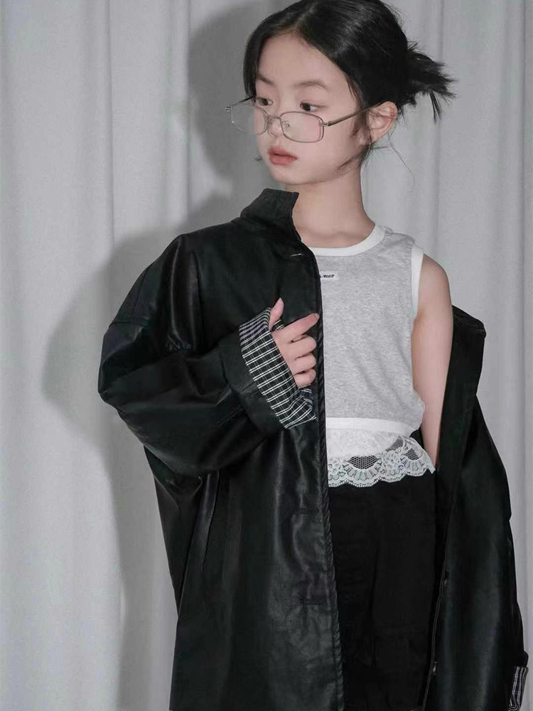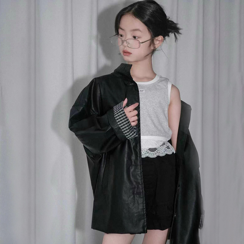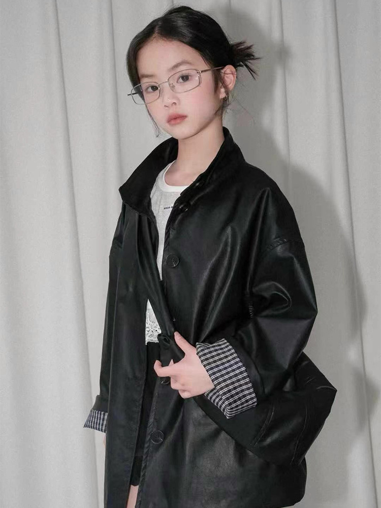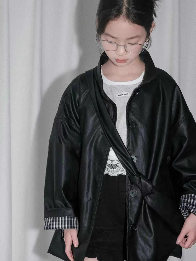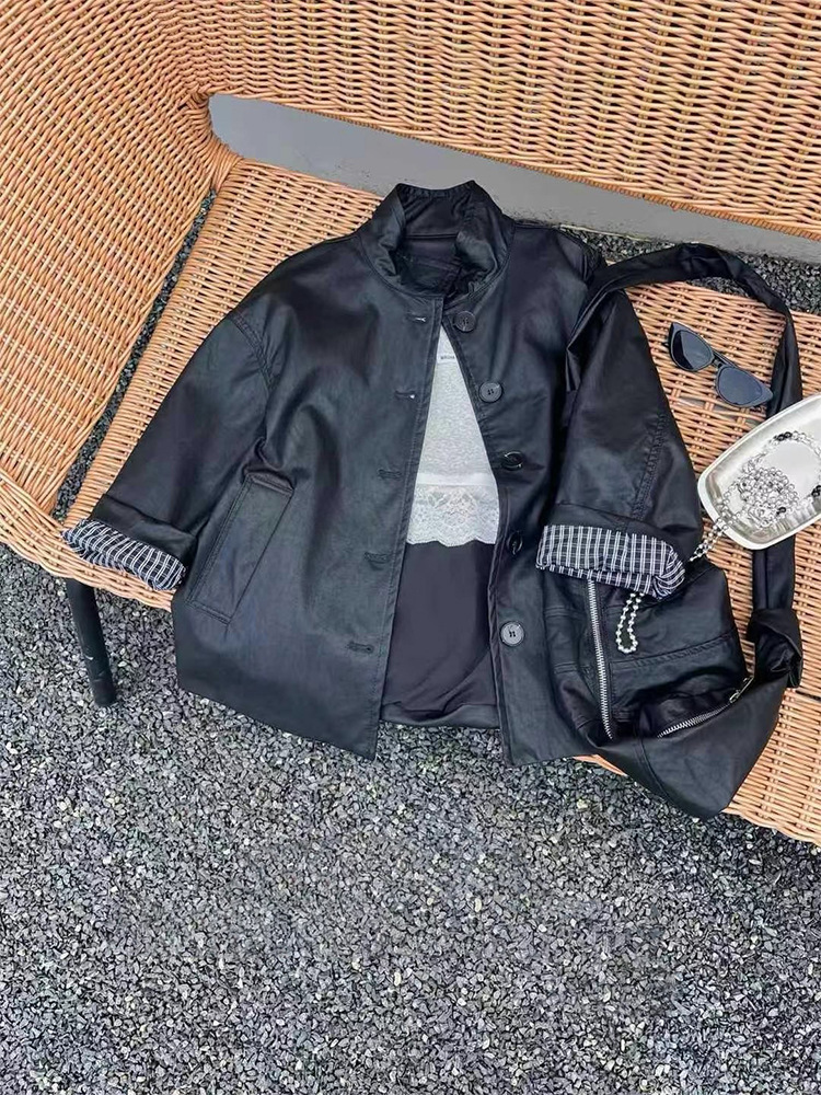 한국 스타일 격자 무늬 스티칭 PU 가죽 코트 여성 2025 봄과 가을 새로운 올 매치 걸스 패션 세련된 재킷