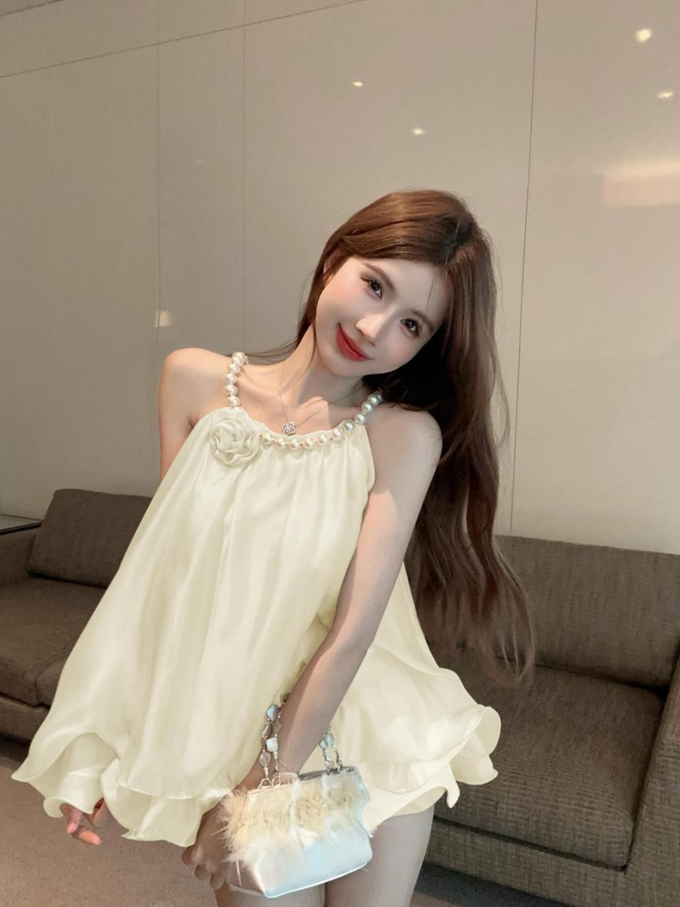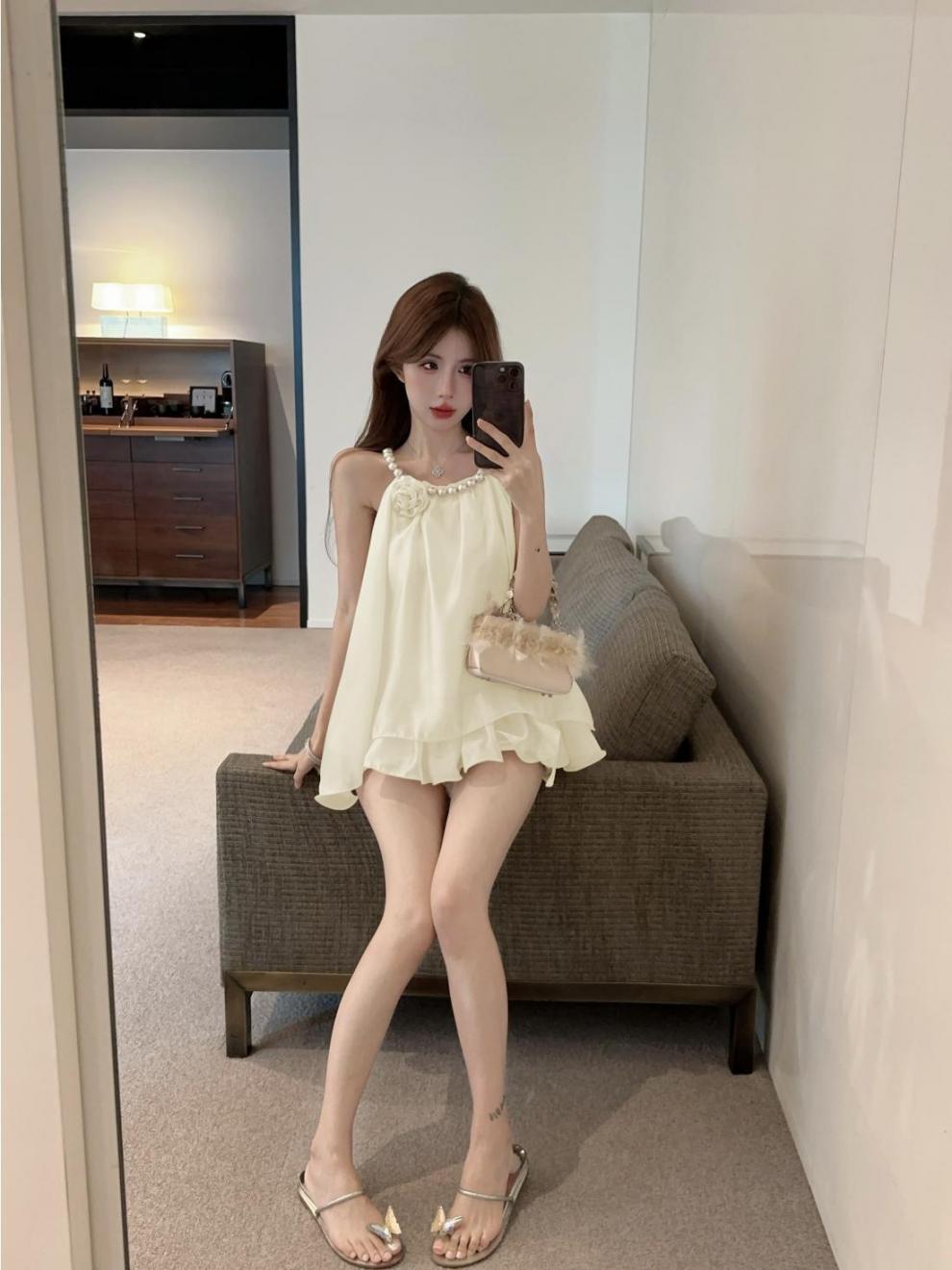 니치 목에 걸린 진주 장식 스티칭 러플 헴 루즈 탑 2025 년 여름과 가을 새로운 프랑스 스타일 여성