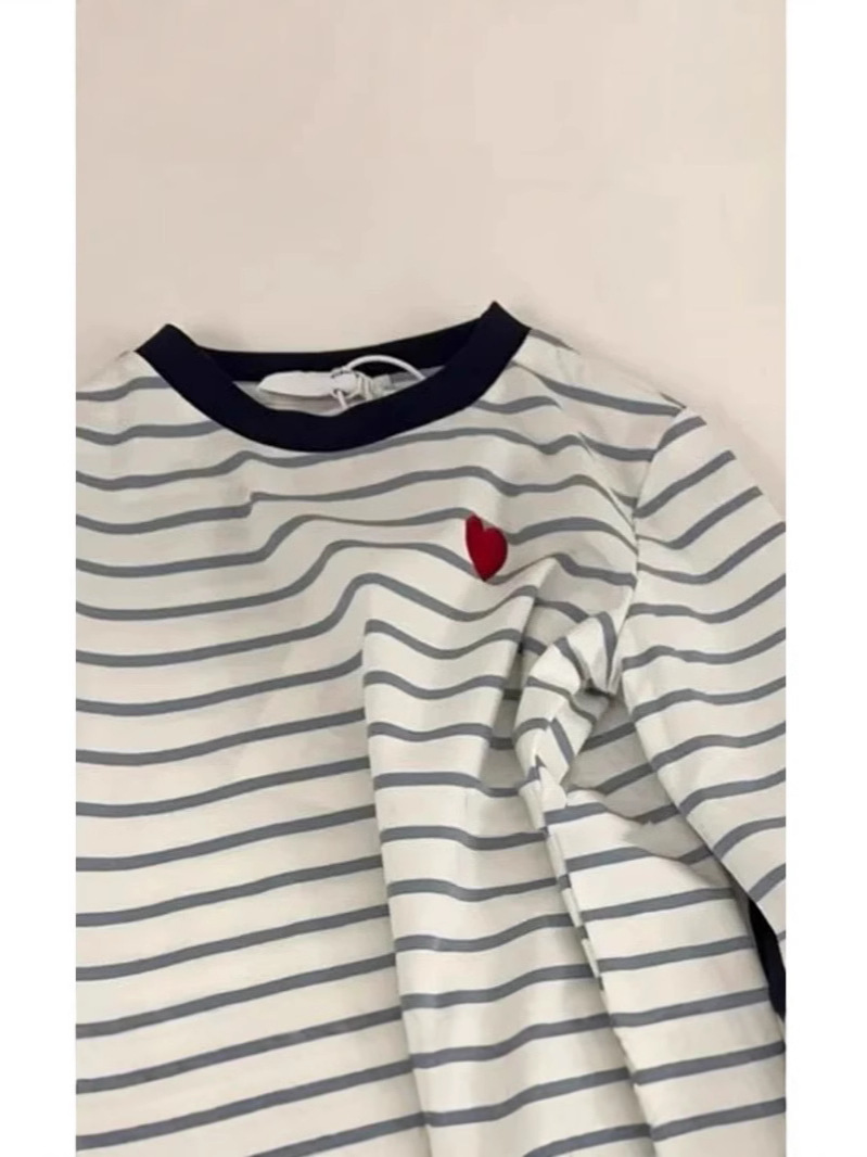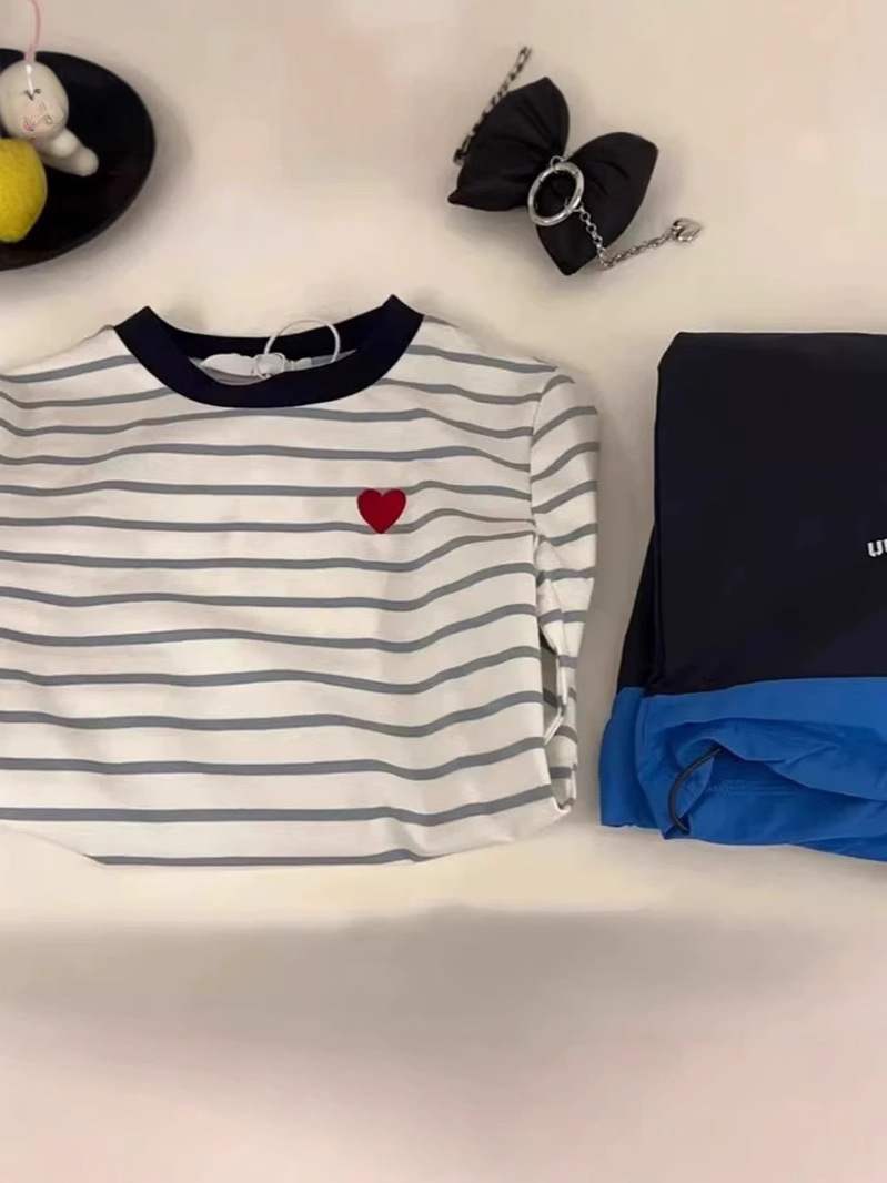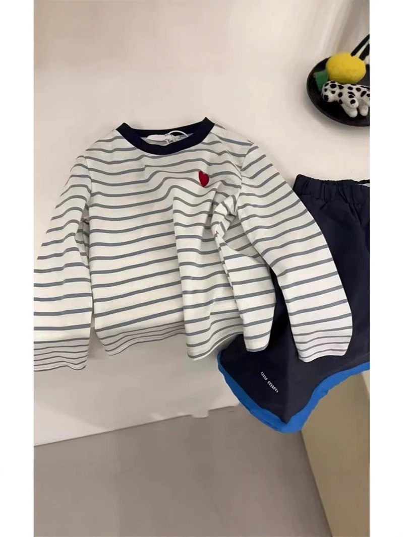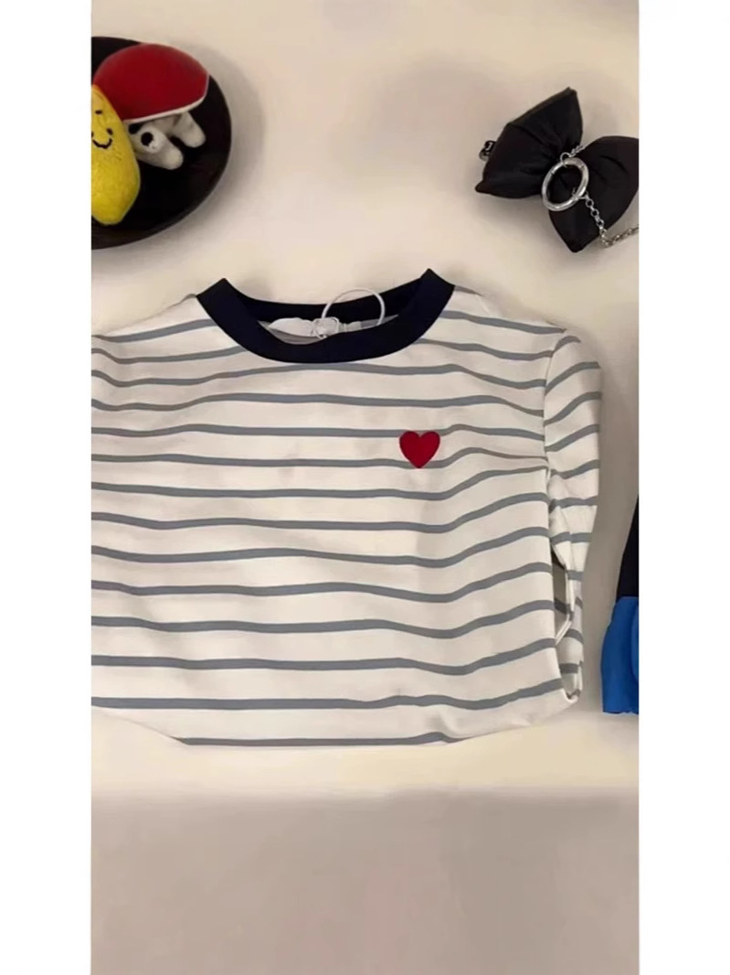 소녀 한국식 콘트라스트 스트라이프 티셔츠 2025 봄 새 어린이 라운드 넥 긴팔 베이스 탑 슬림 핏 인테리어
