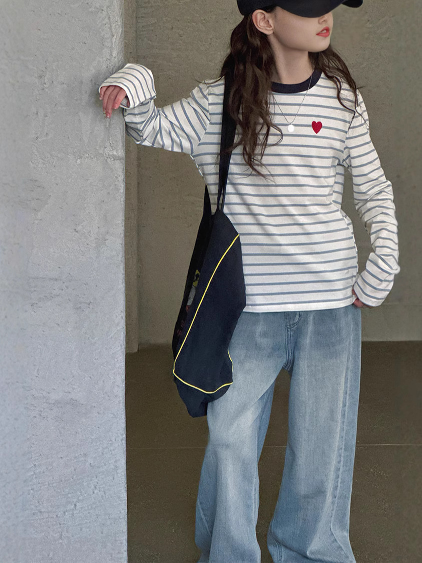 소녀 한국식 콘트라스트 스트라이프 티셔츠 2025 봄 새 어린이 라운드 넥 긴팔 베이스 탑 슬림 핏 인테리어스토어 가기