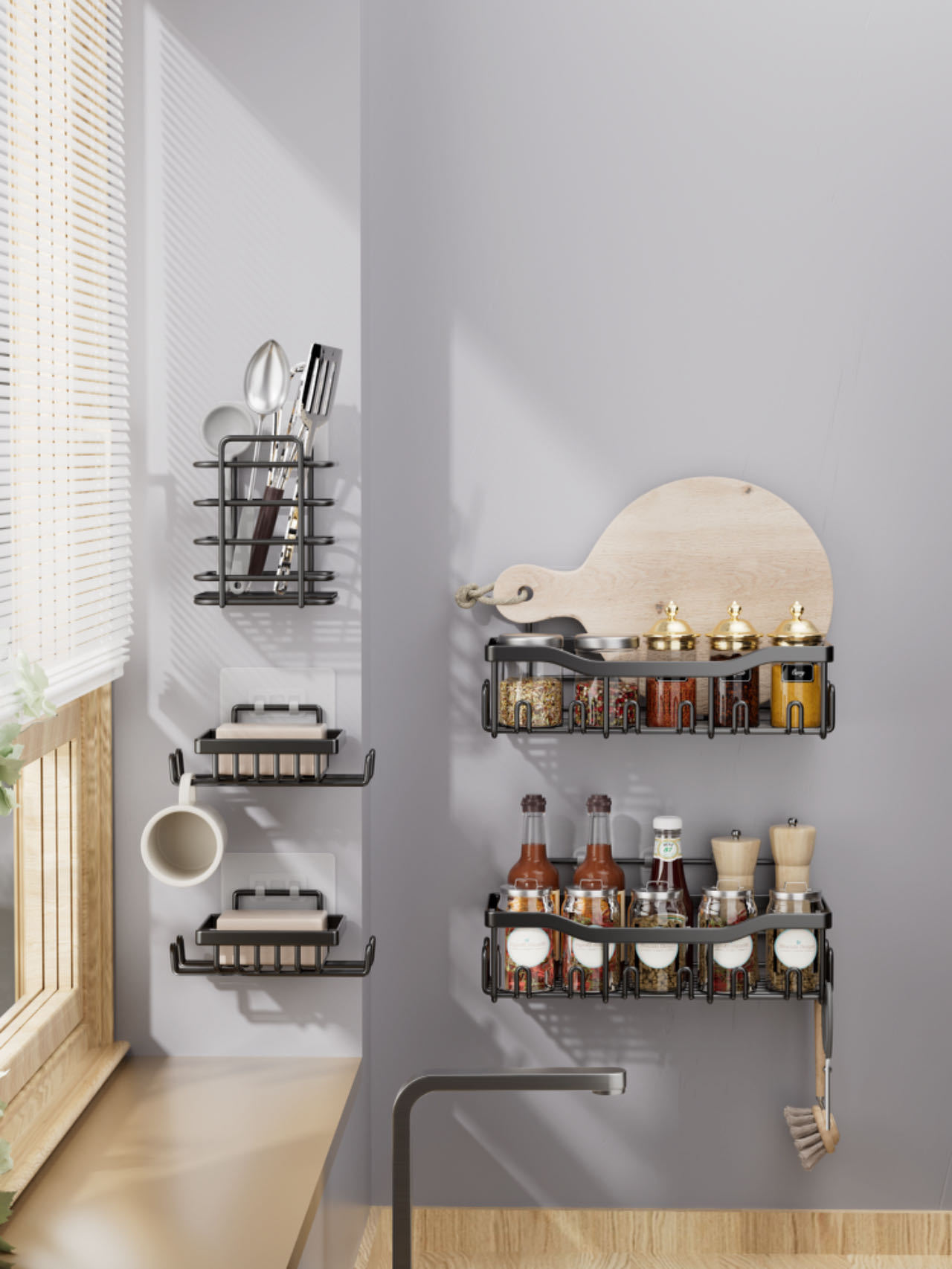 • 대형 싱글 바구니 + 비누걸이 + 칫솔꽂이 (후크 패치 포함)