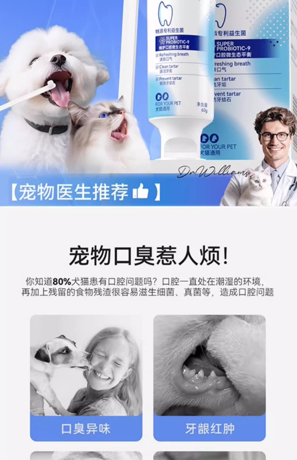 히피 개 애완 동물 치약 고양이 개 깨끗한 호흡 냄새 밝은 흰색 깨끗한 타르타르 테디 보메이 유니버설