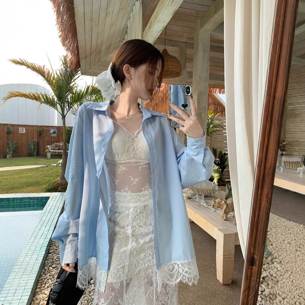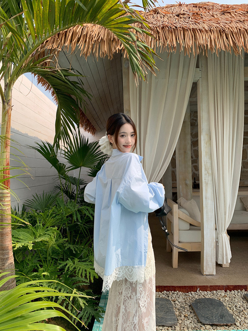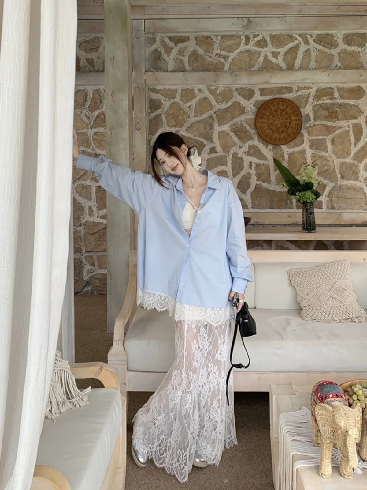 프랑스 스타일 레이스 바느질 머리 긴 소매 셔츠 여성의 이른 봄 한국 스타일 새로운 스타일 우아한 탑