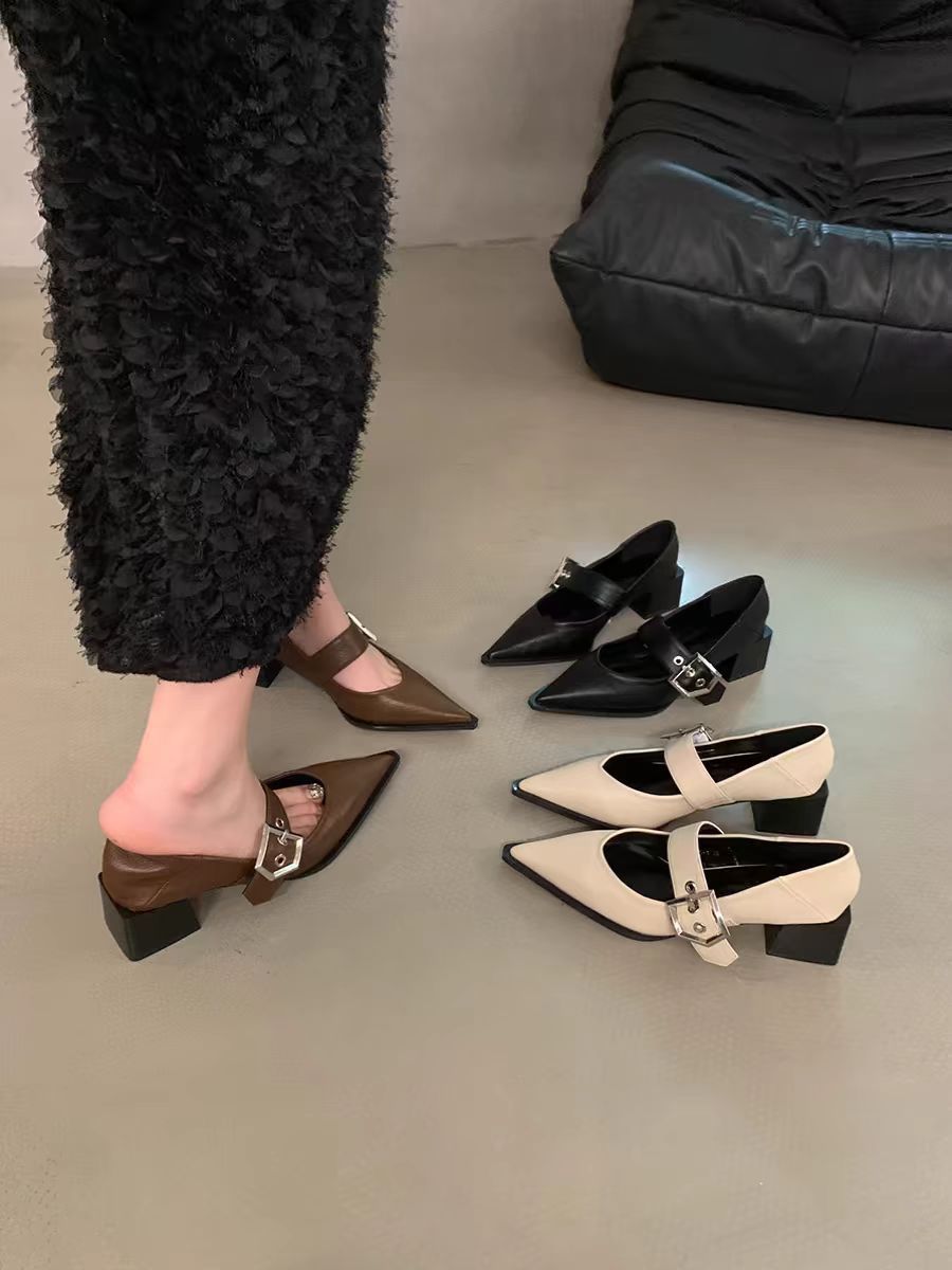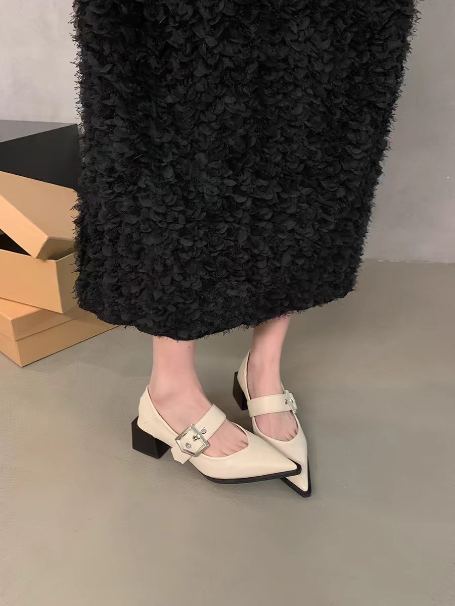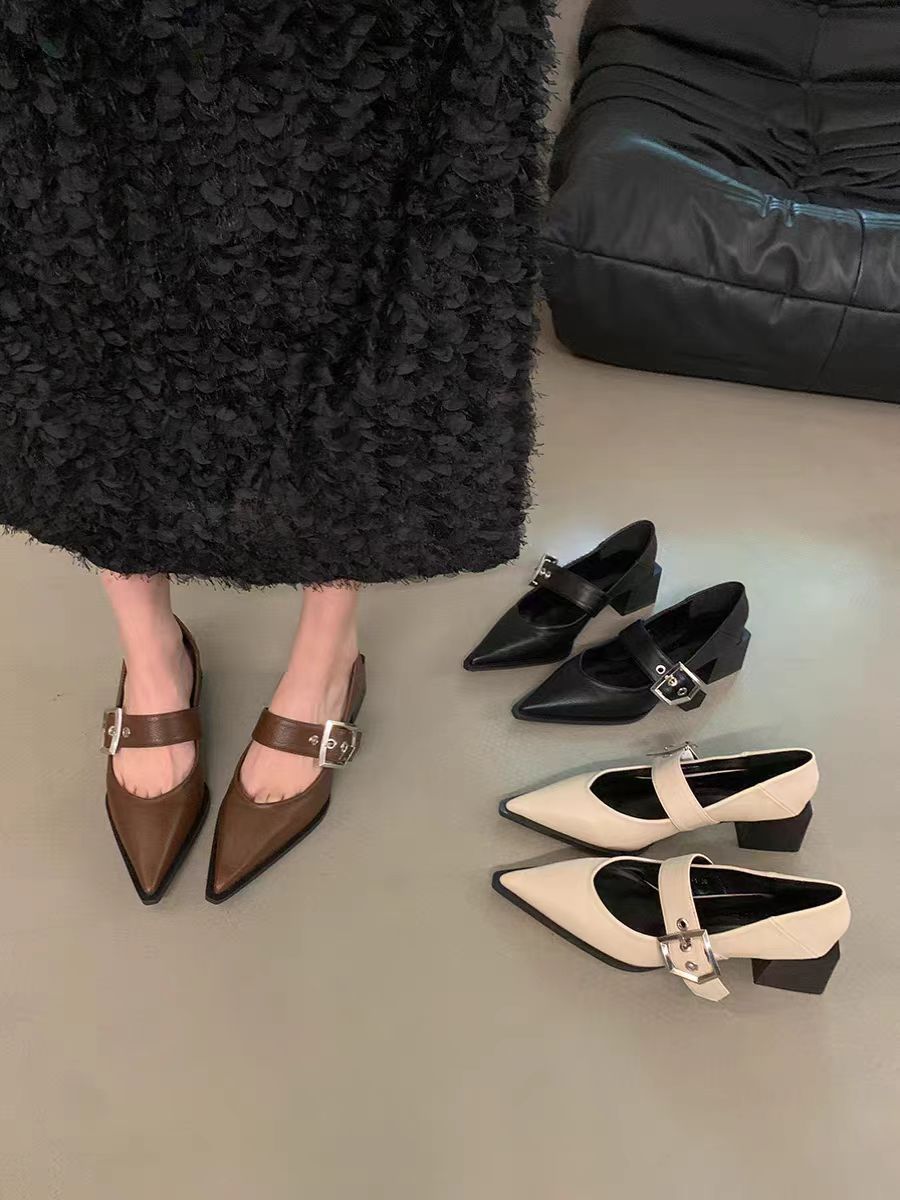 빈티지 포인팅 메리 제인 작은 가죽 신발 여성 2025 봄과 가을 새로운 한국 스타일 프랑스 청키 힐 미드 힐 레푸 싱글 신발스토어 가기