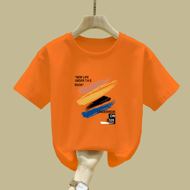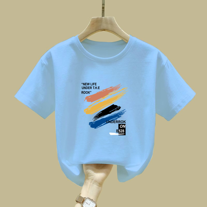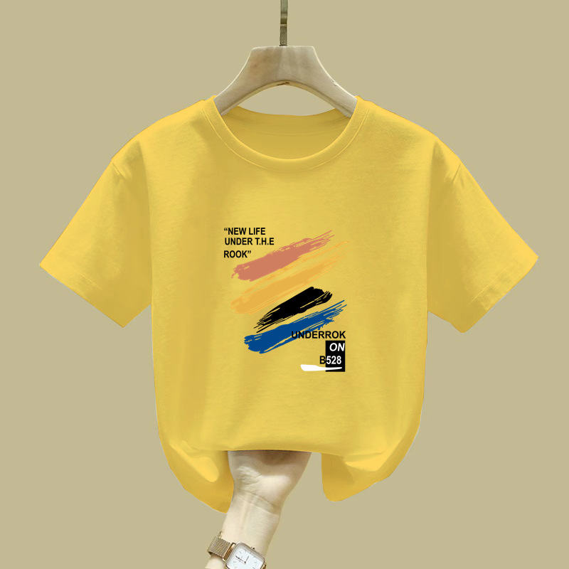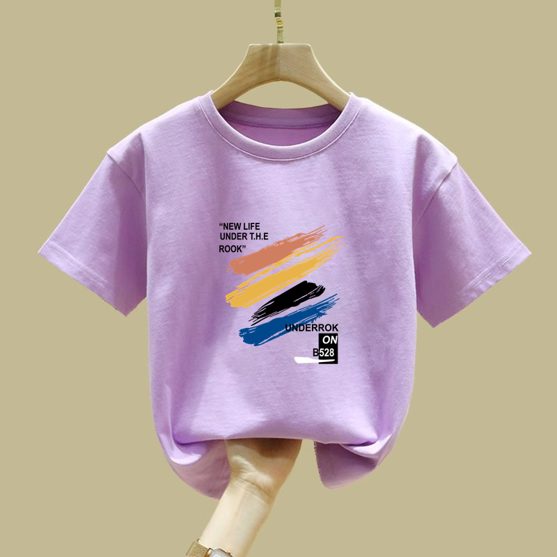 2397 # 소년 소녀를위한 어린이 페인트 인쇄 코튼 반팔 티셔츠 여름 착용 게으른 틈새 미중 및 큰 어린이 코튼 탑스토어 가기