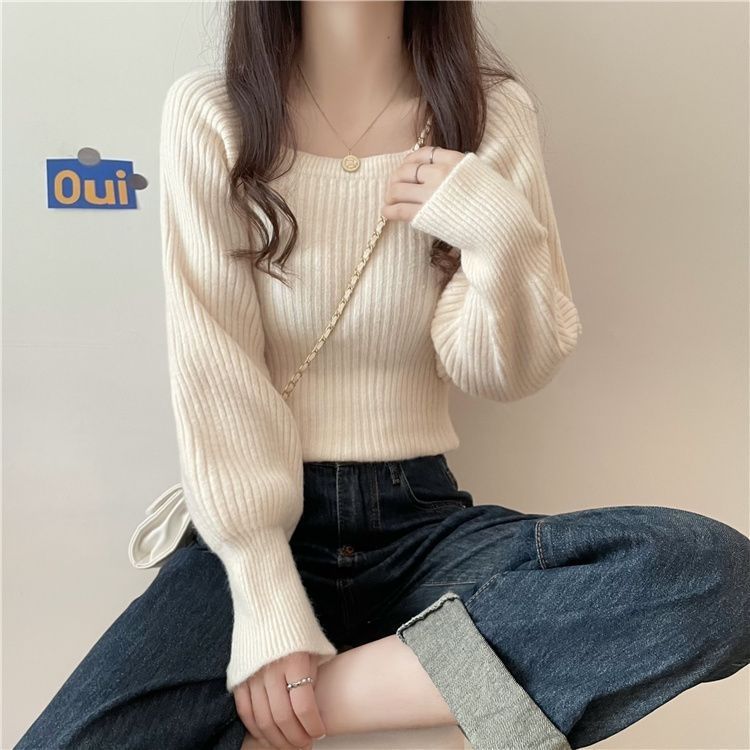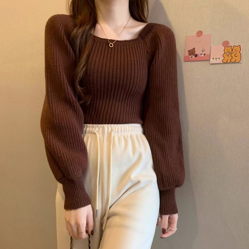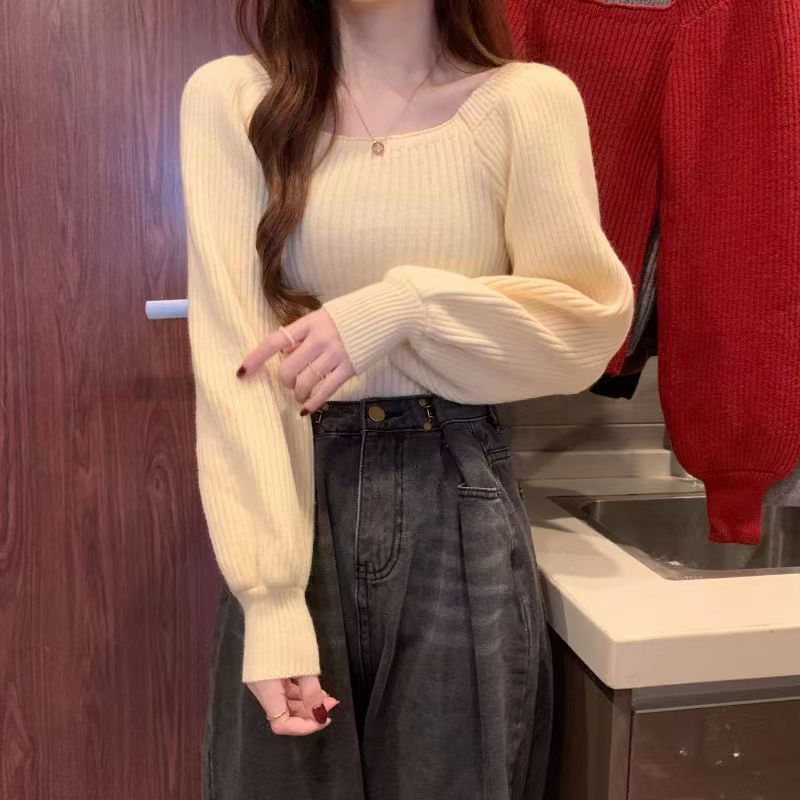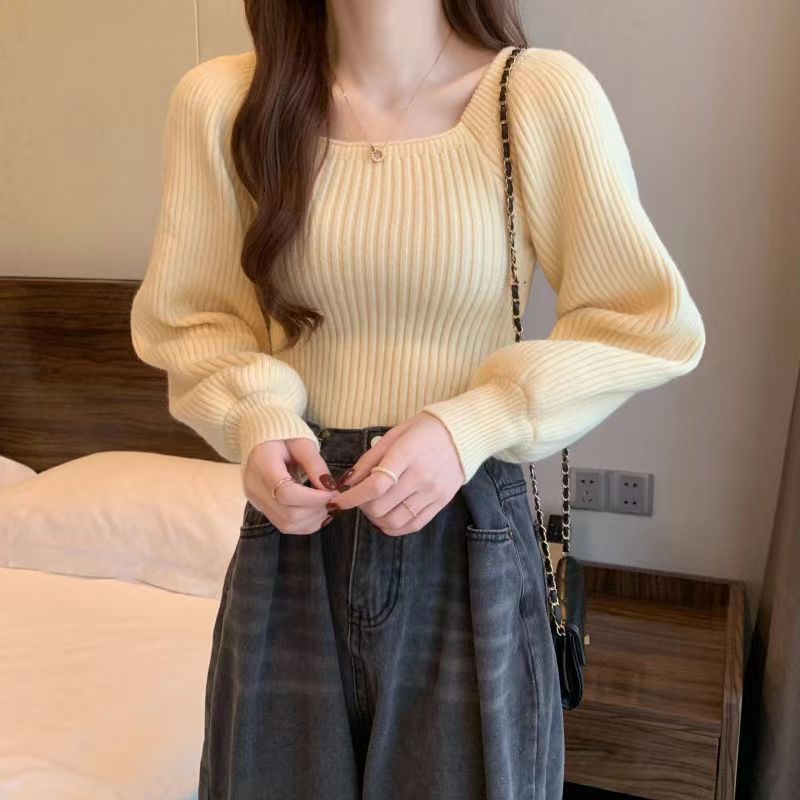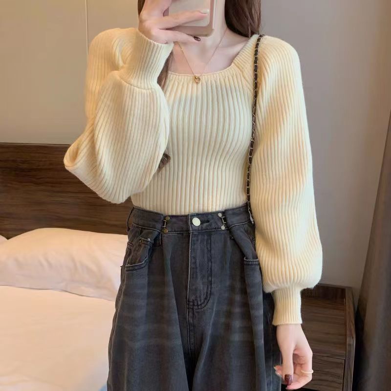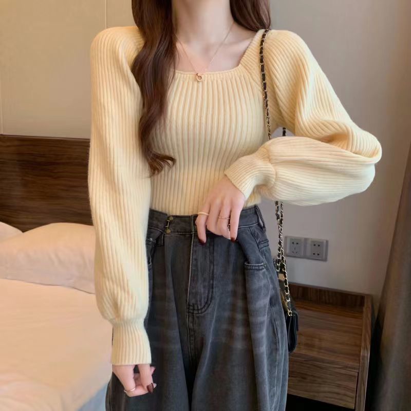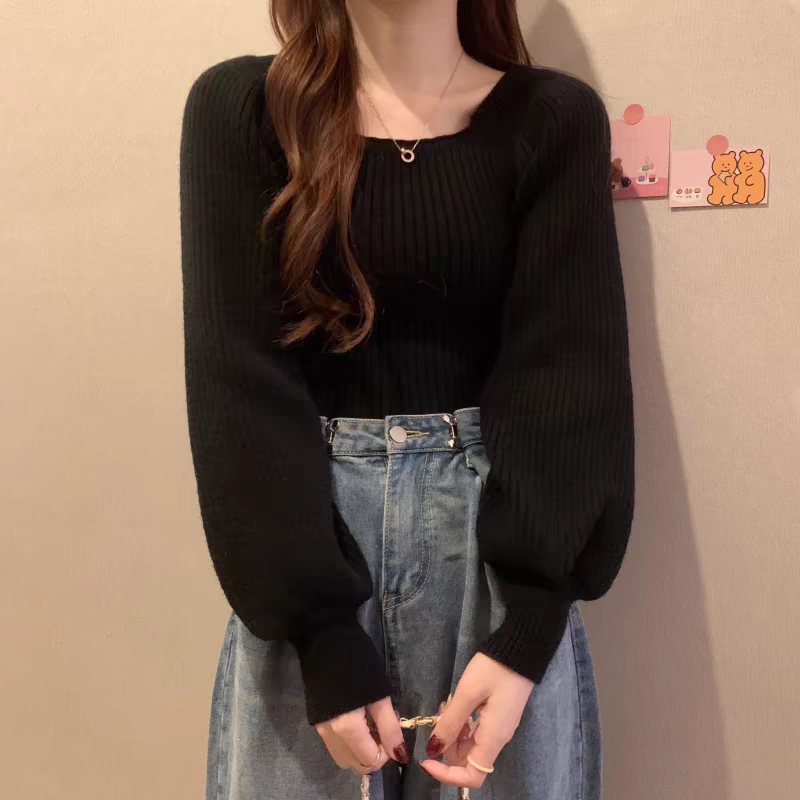 가을과 겨울 프랑스 광장 칼라 퍼프 슬리브 디자인 센스 틈새 내부 착용 외부 착용 스퀘어 칼라 니트 베이스 셔츠 스웨터 여성용 탑스토어 가기