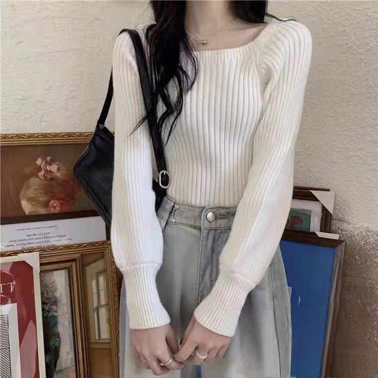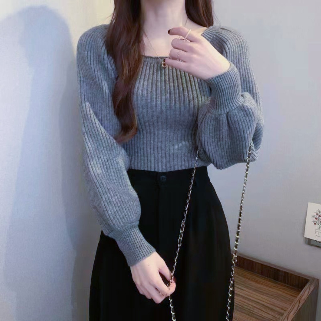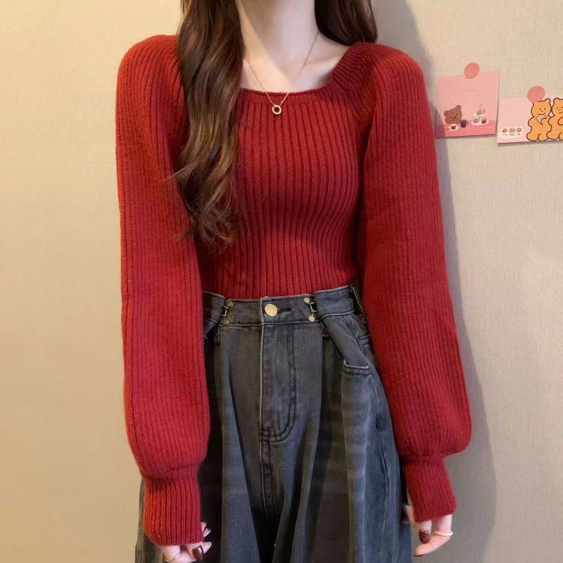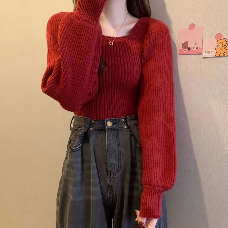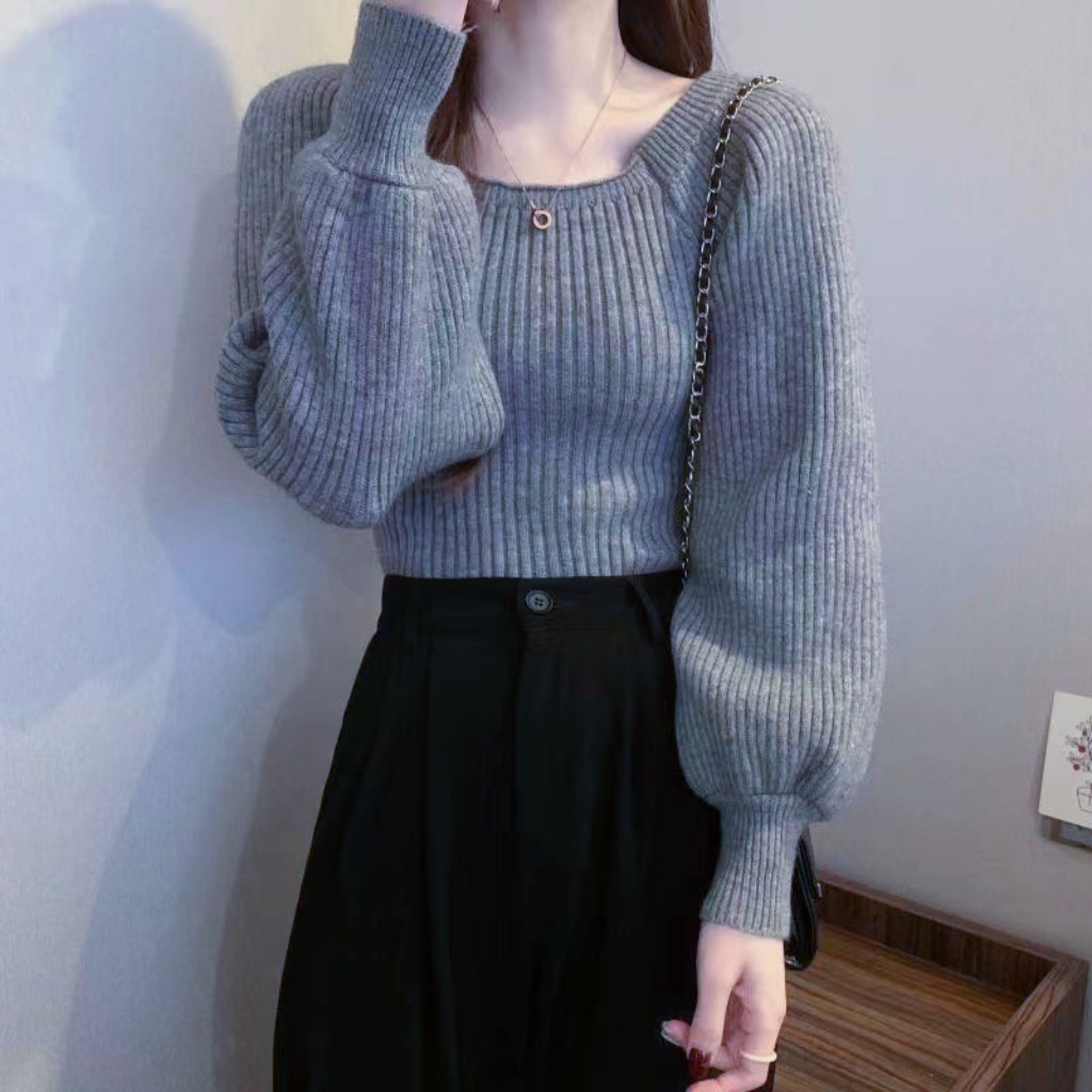 가을과 겨울 프랑스 광장 칼라 퍼프 슬리브 디자인 센스 틈새 내부 착용 외부 착용 스퀘어 칼라 니트 베이스 셔츠 스웨터 여성용 탑스토어 가기