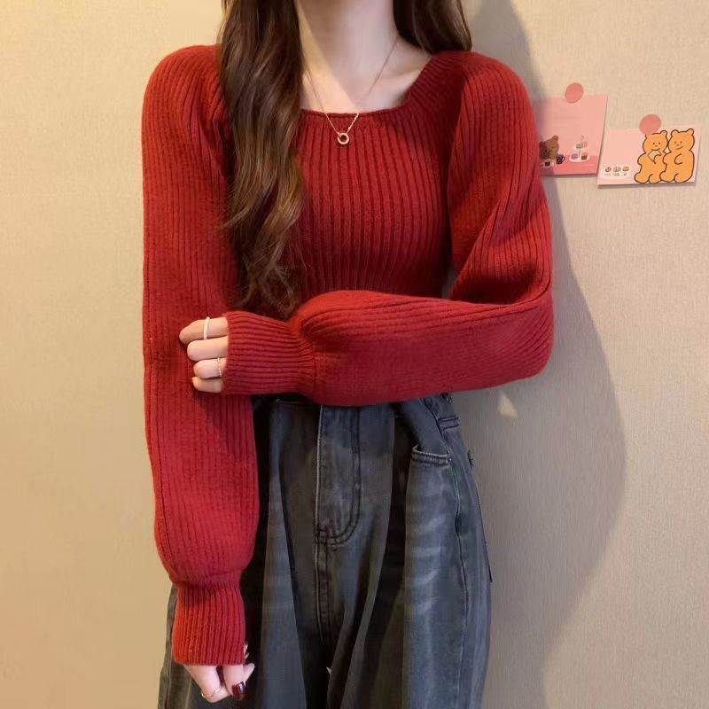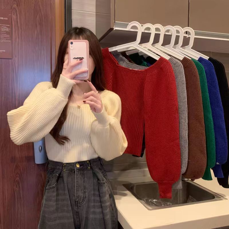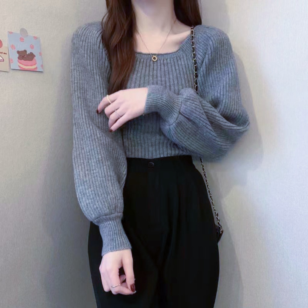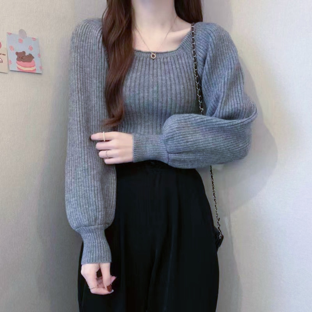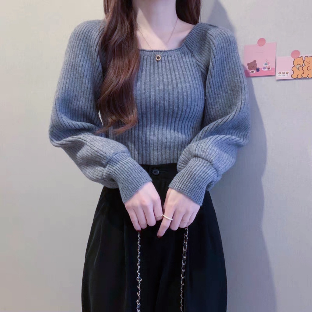 가을과 겨울 프랑스 광장 칼라 퍼프 슬리브 디자인 센스 틈새 내부 착용 외부 착용 스퀘어 칼라 니트 베이스 셔츠 스웨터 여성용 탑스토어 가기