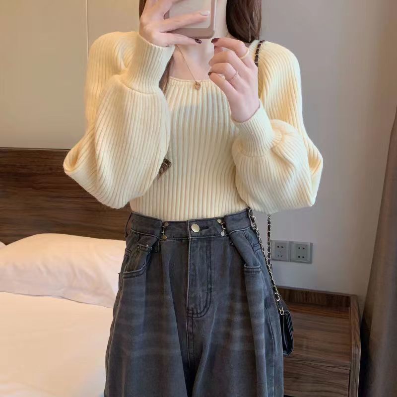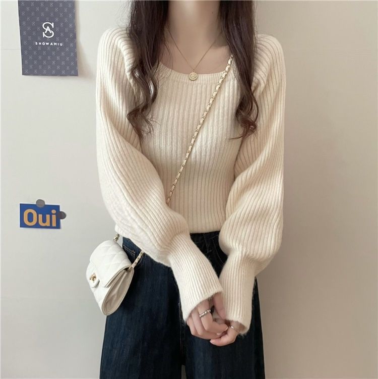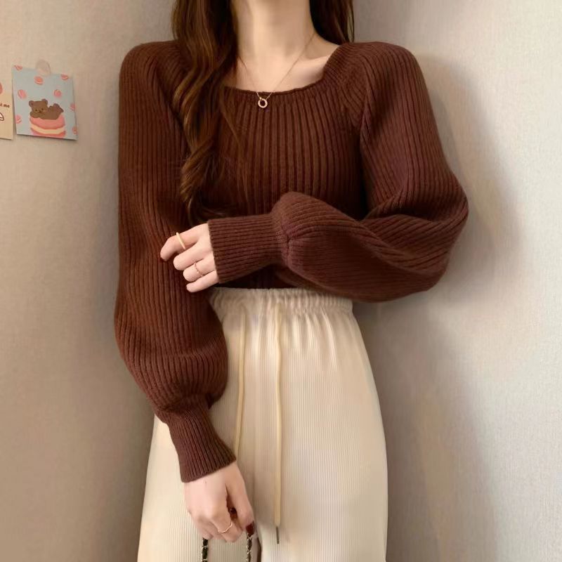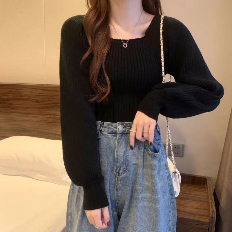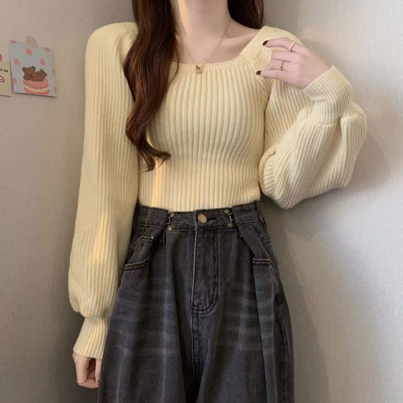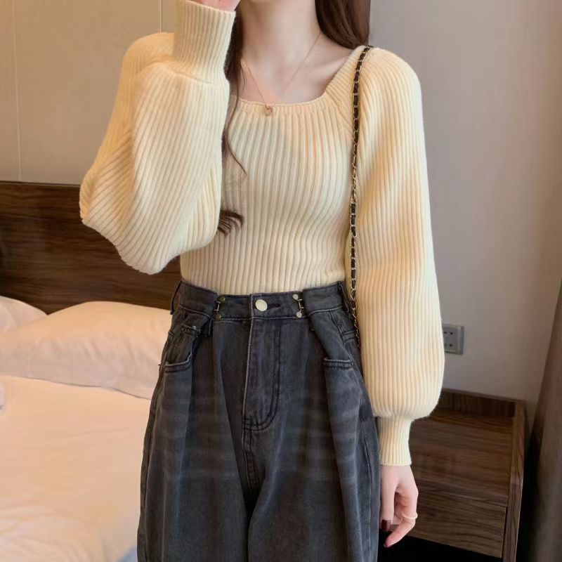 가을과 겨울 프랑스 광장 칼라 퍼프 슬리브 디자인 센스 틈새 내부 착용 외부 착용 스퀘어 칼라 니트 베이스 셔츠 스웨터 여성용 탑