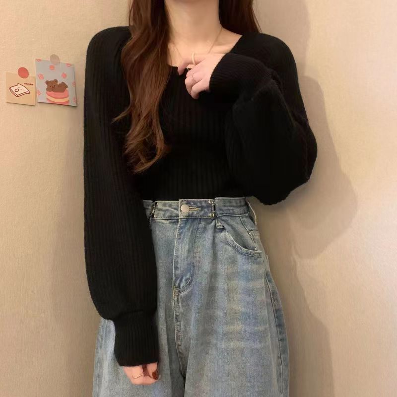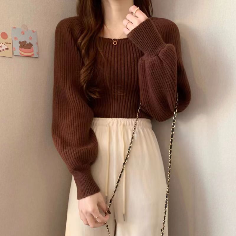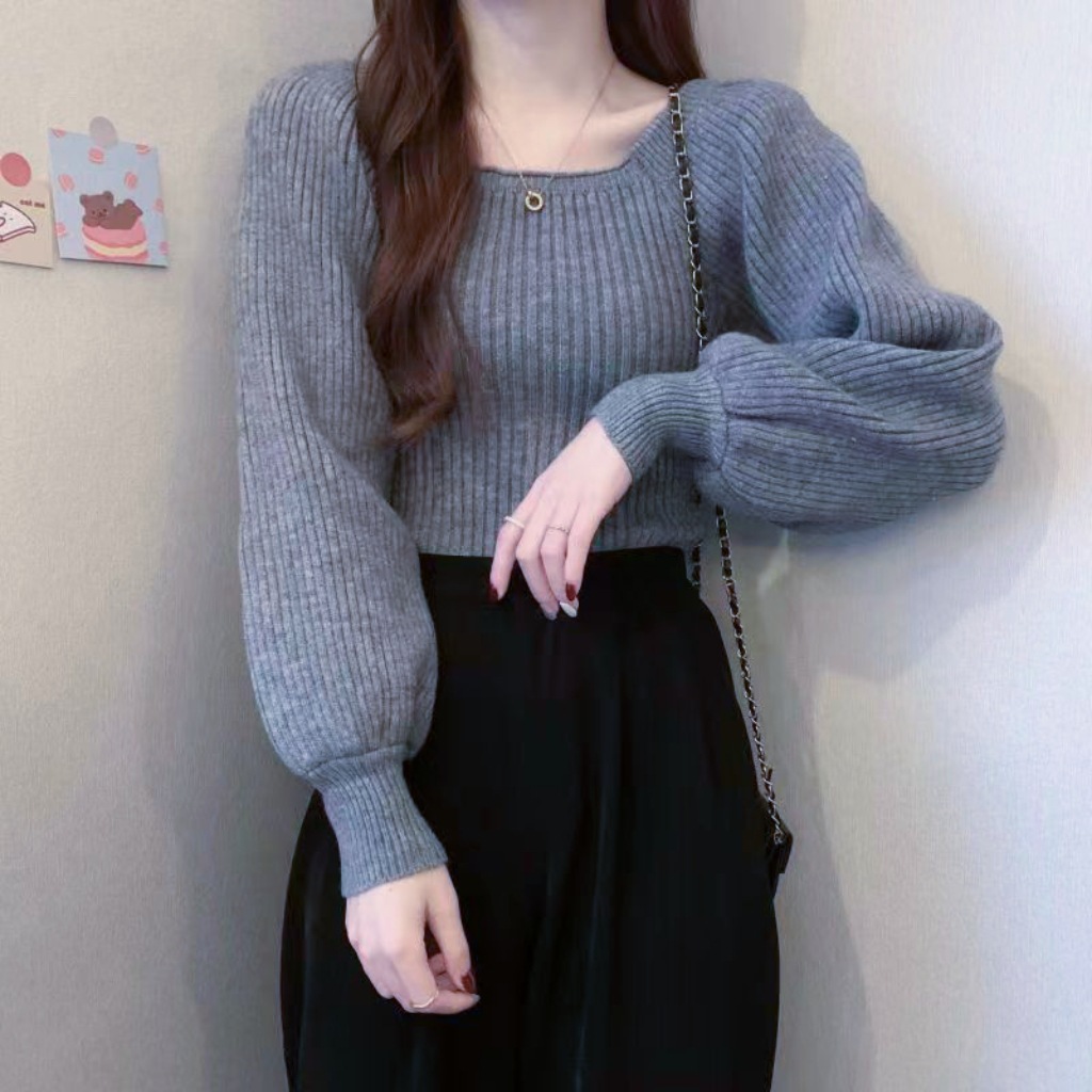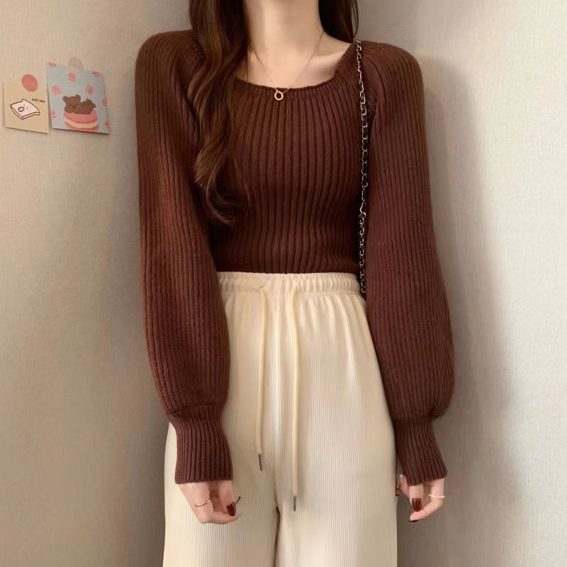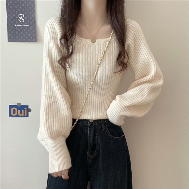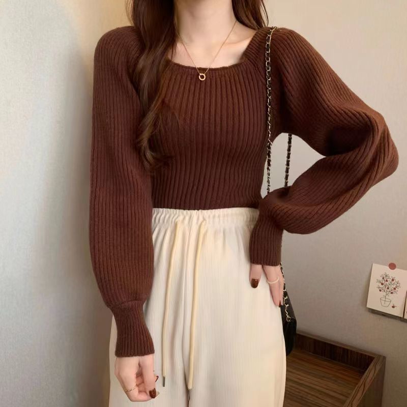 가을과 겨울 프랑스 광장 칼라 퍼프 슬리브 디자인 센스 틈새 내부 착용 외부 착용 스퀘어 칼라 니트 베이스 셔츠 스웨터 여성용 탑