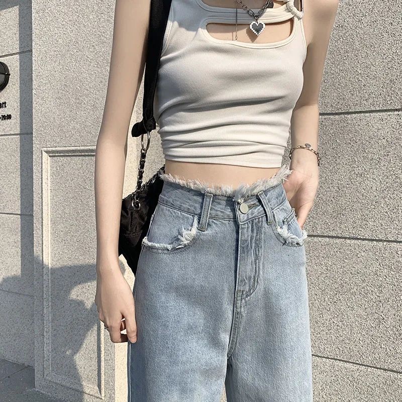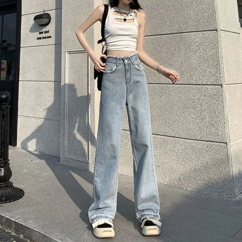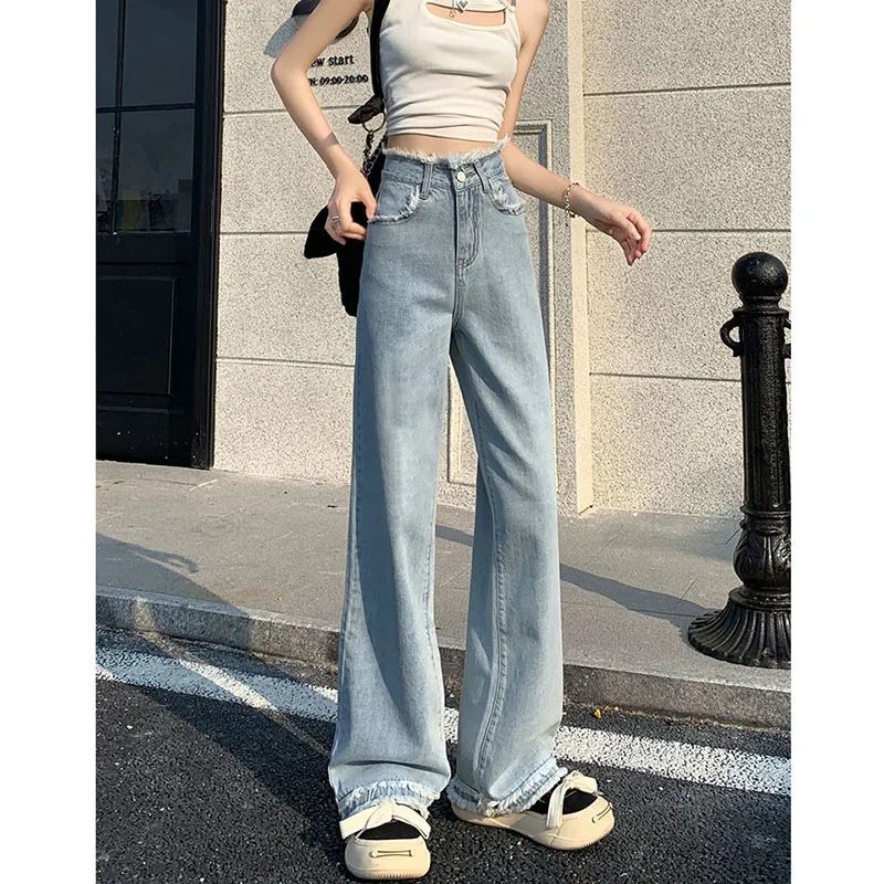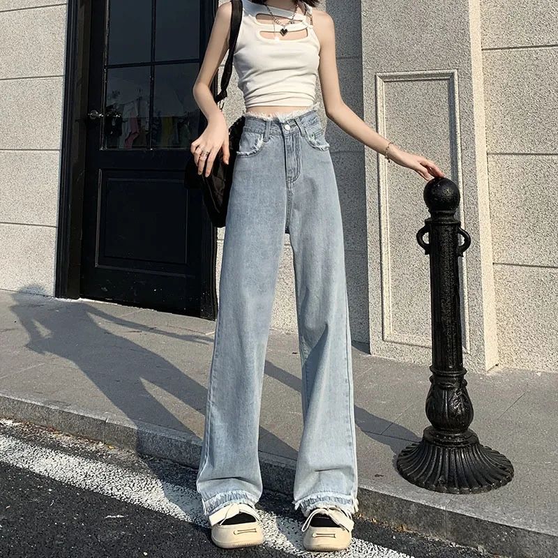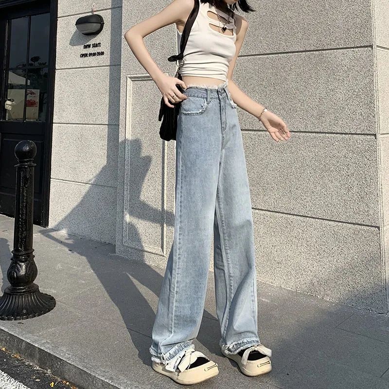 2025 디자인 센스 틈새 헝겊 청바지 여성용 높은 허리 슬리밍 스트레이트 바지 넓은 다리 바지 긴 바지스토어 가기