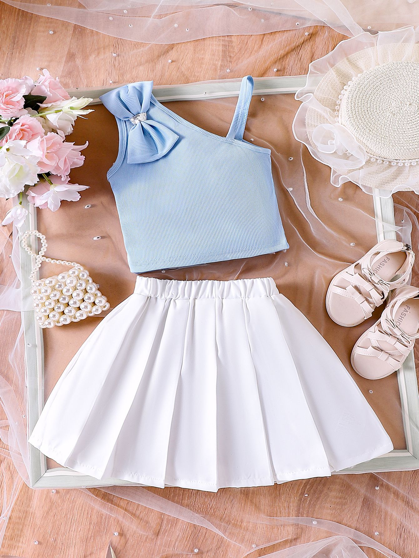 AliExpress 유럽과 미국 INS 여름 새로운 소녀 세트 어린이 활 스트랩 탑 화이트 주름 치마스토어 가기
