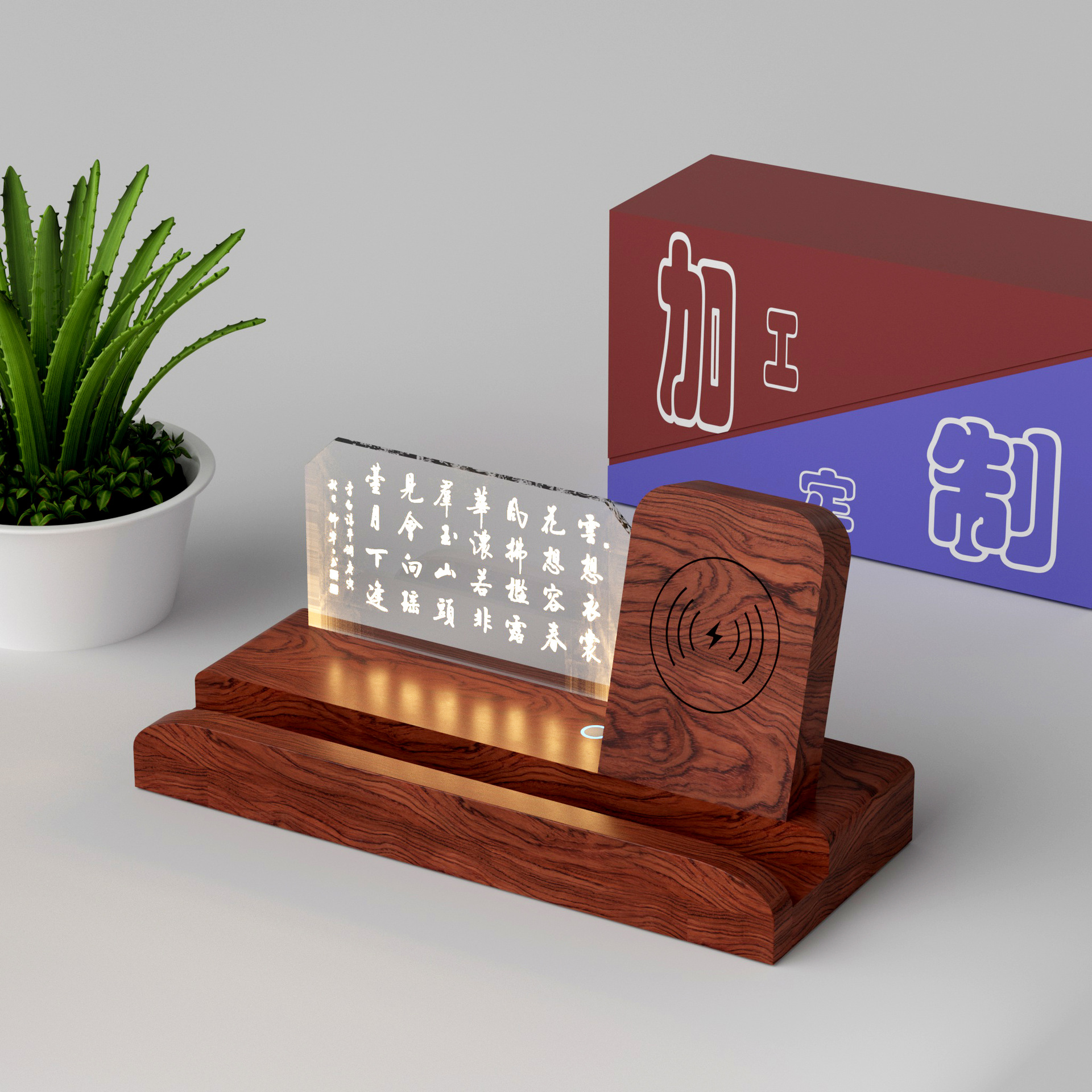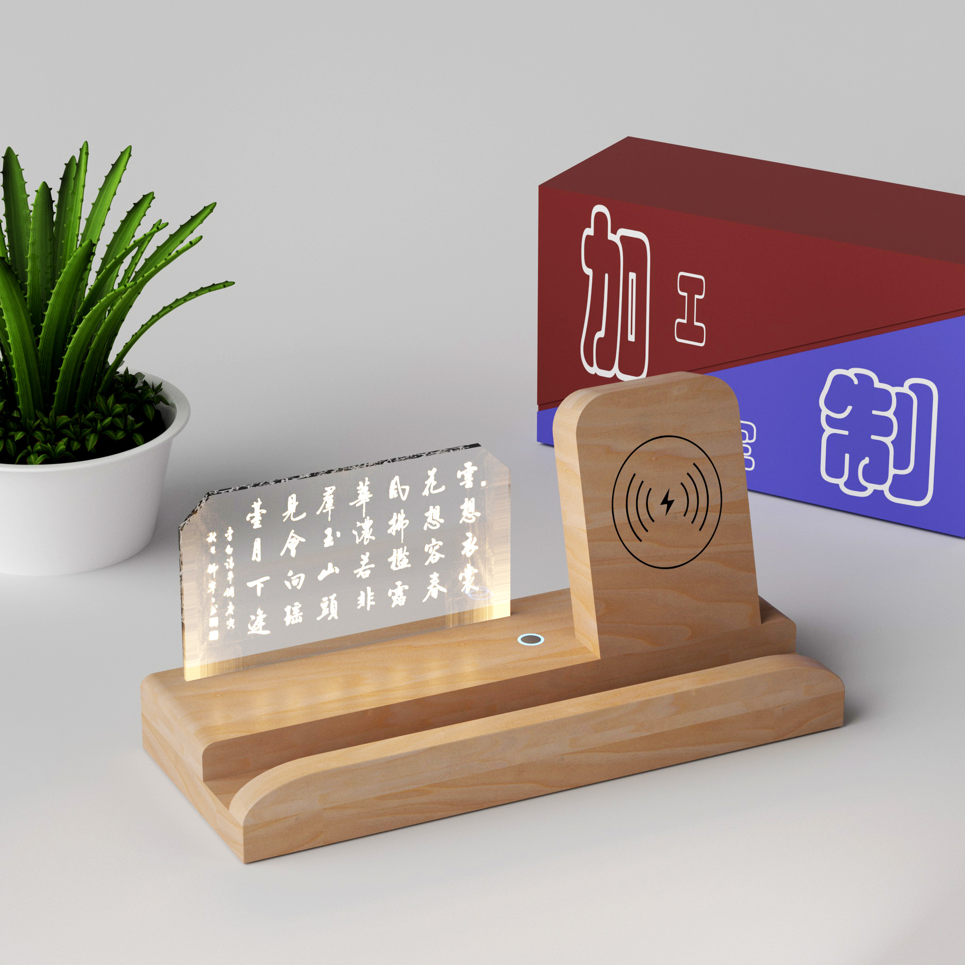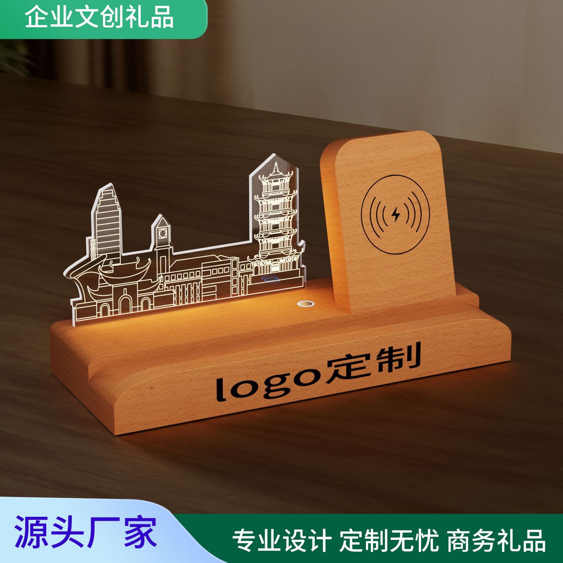 기업 축하 비즈니스 선물 빛나는 아크릴 단단한 나무 야간 조명 휴대 전화 홀더 무선 고속 충전 데스크탑 장식품스토어 가기