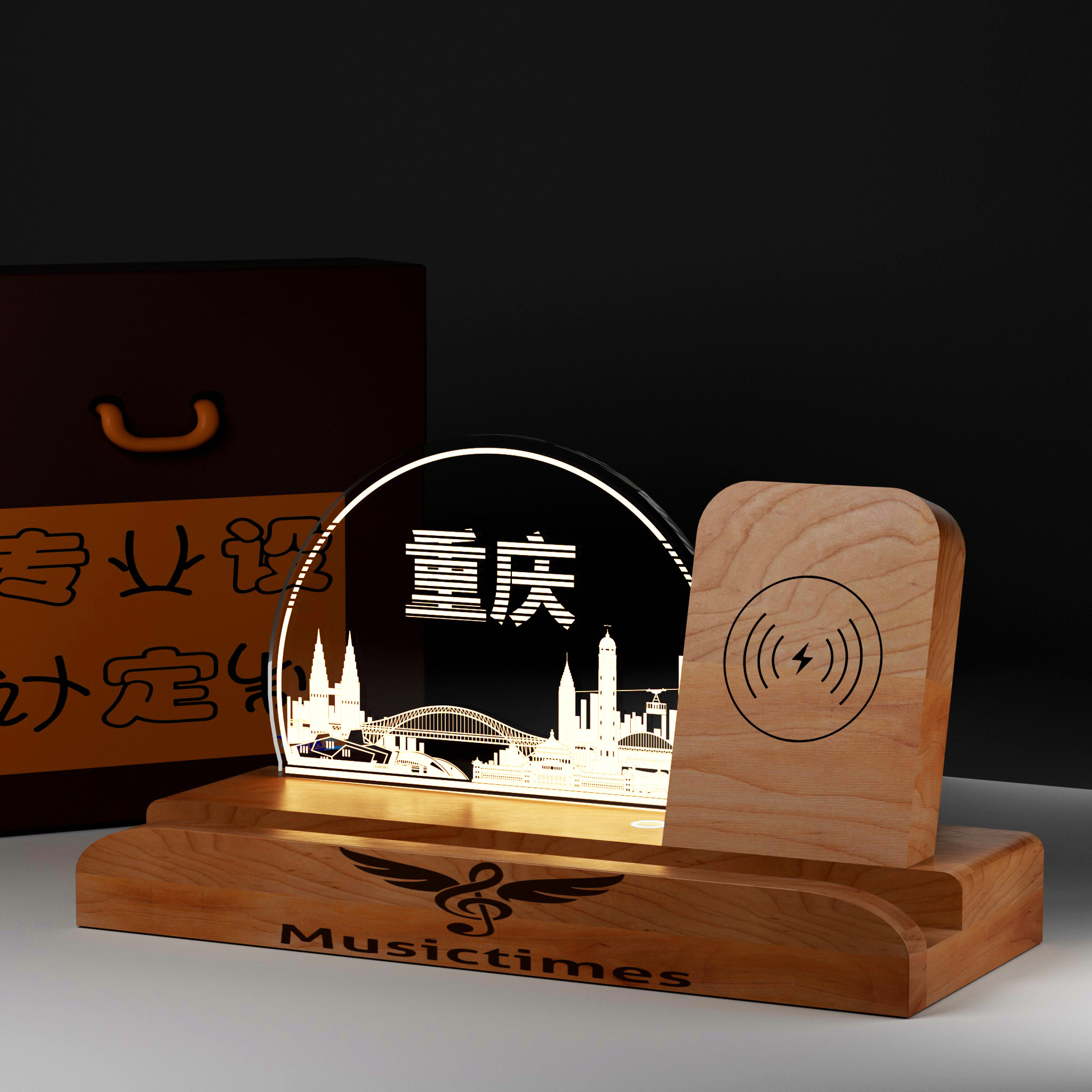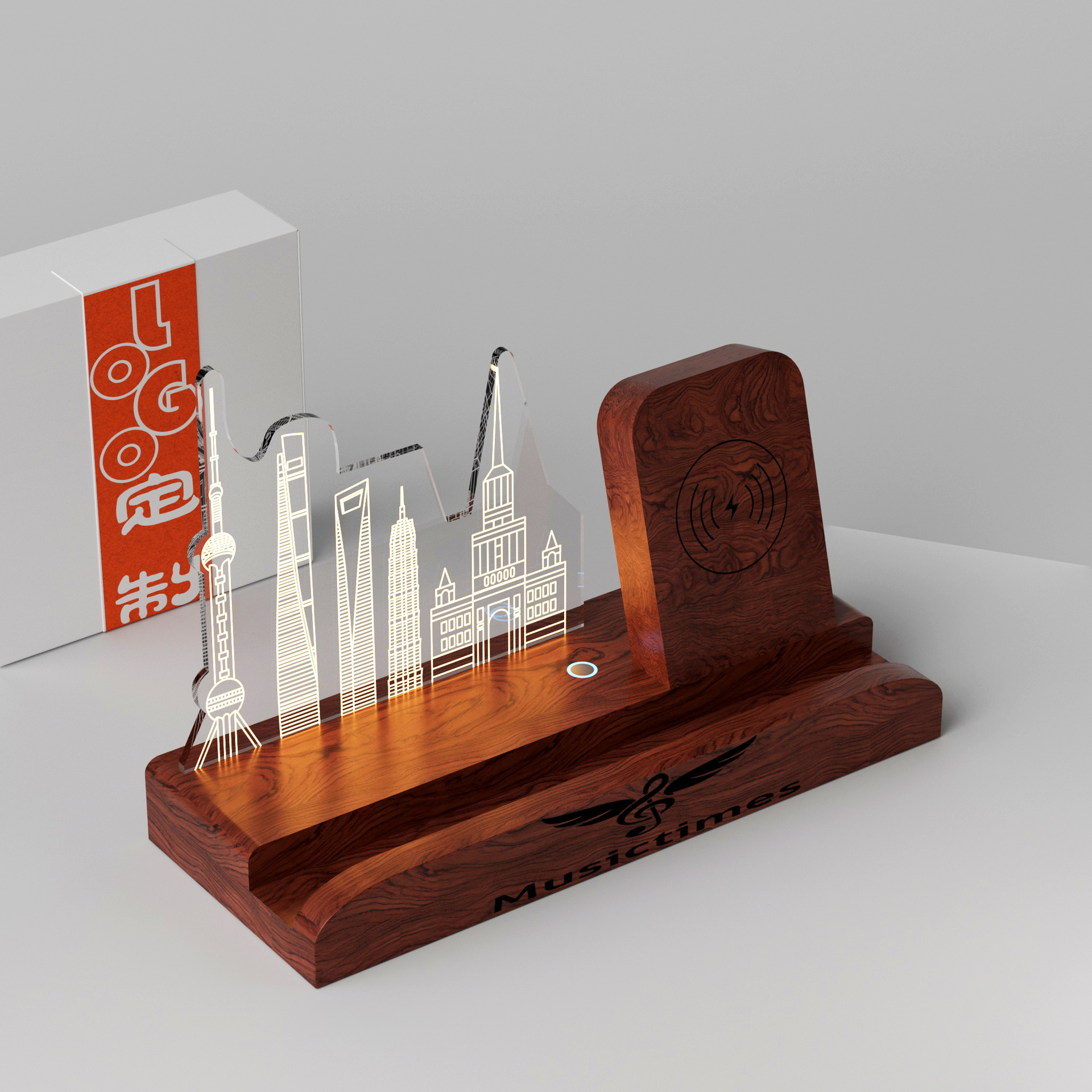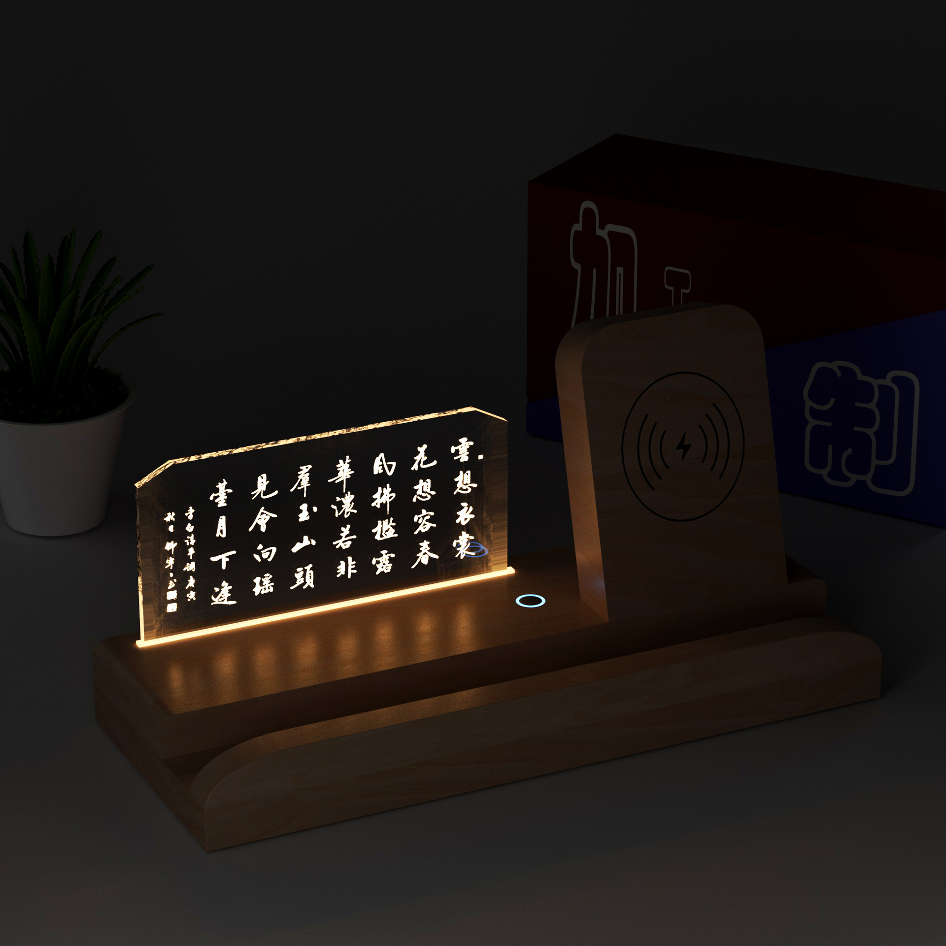 기업 축하 비즈니스 선물 빛나는 아크릴 단단한 나무 야간 조명 휴대 전화 홀더 무선 고속 충전 데스크탑 장식품스토어 가기