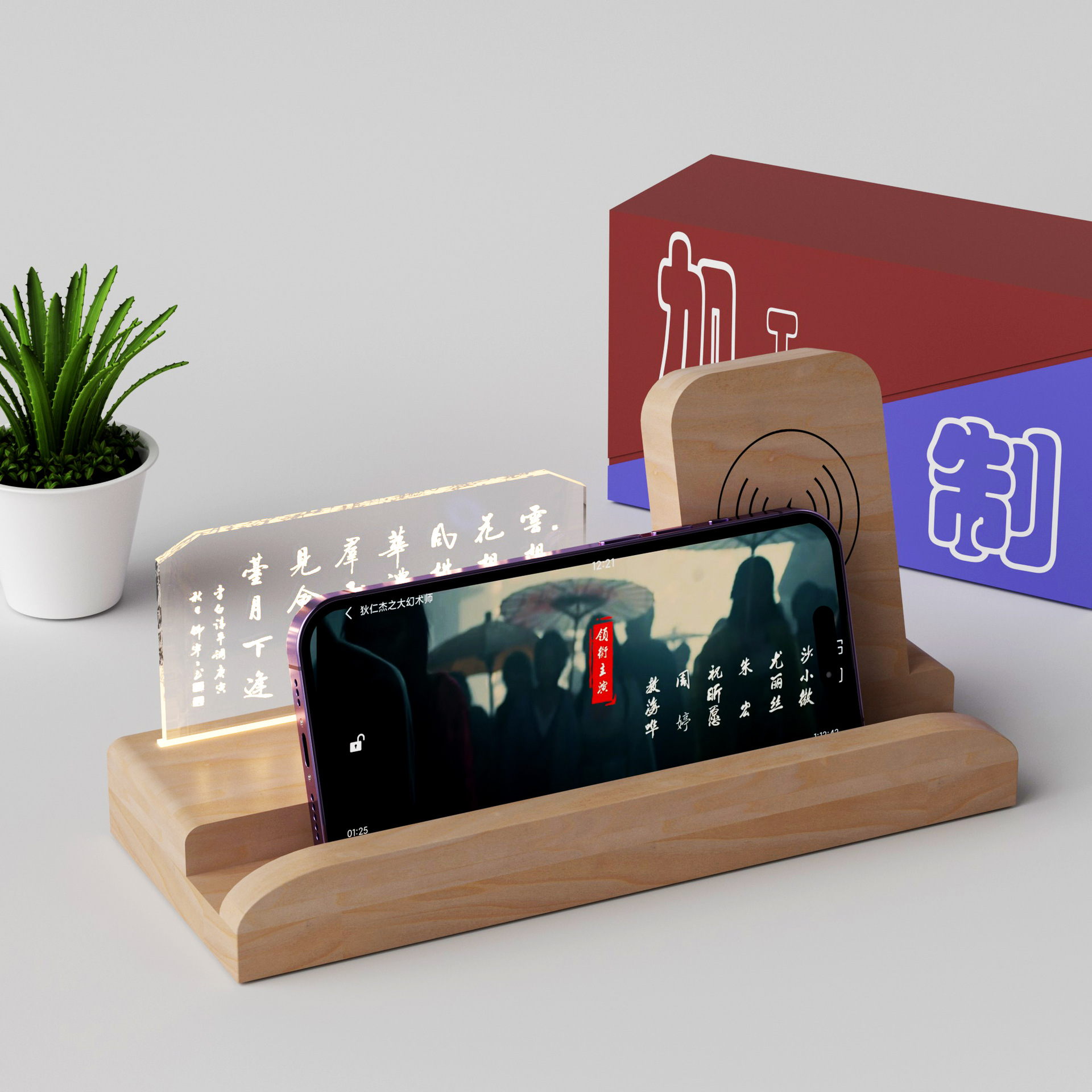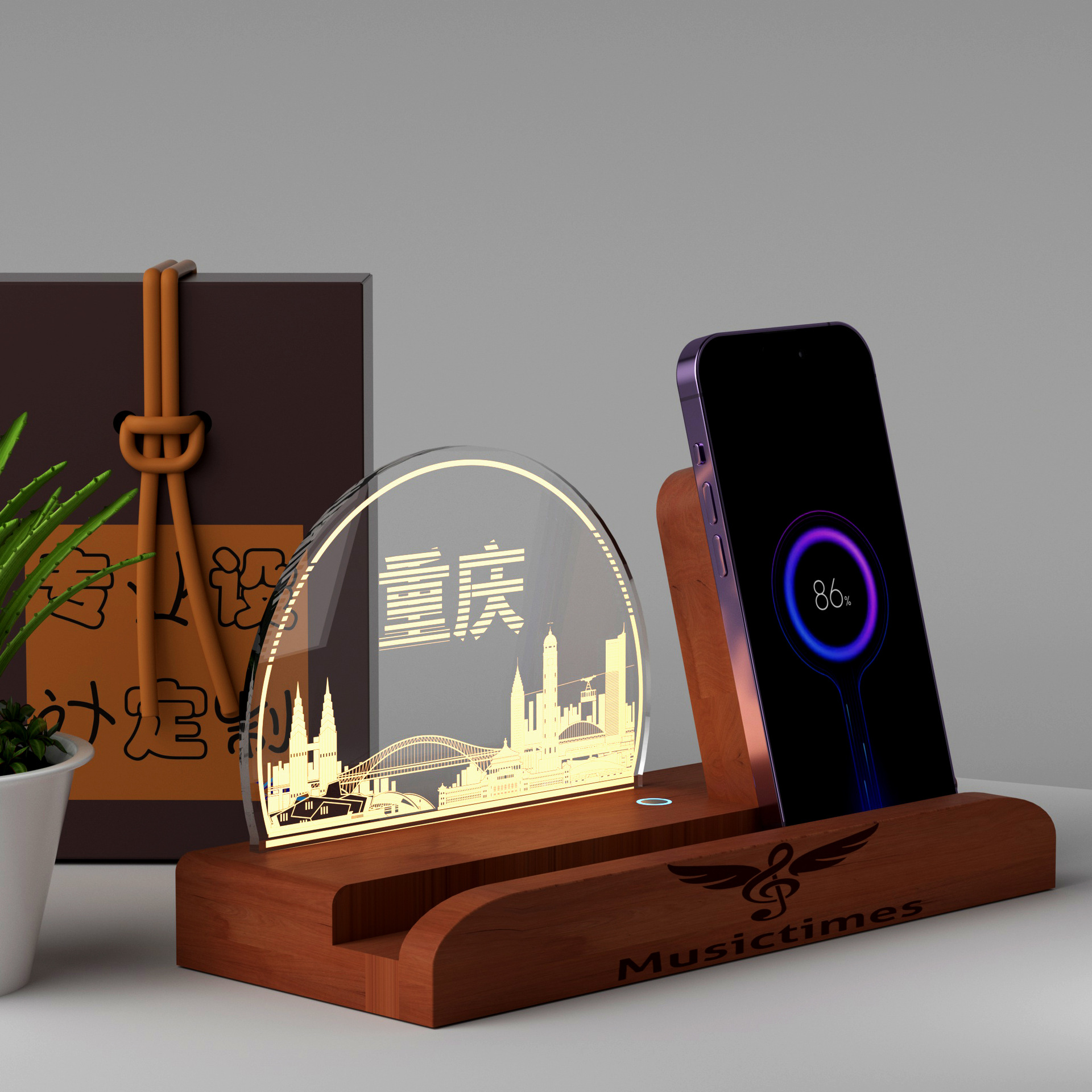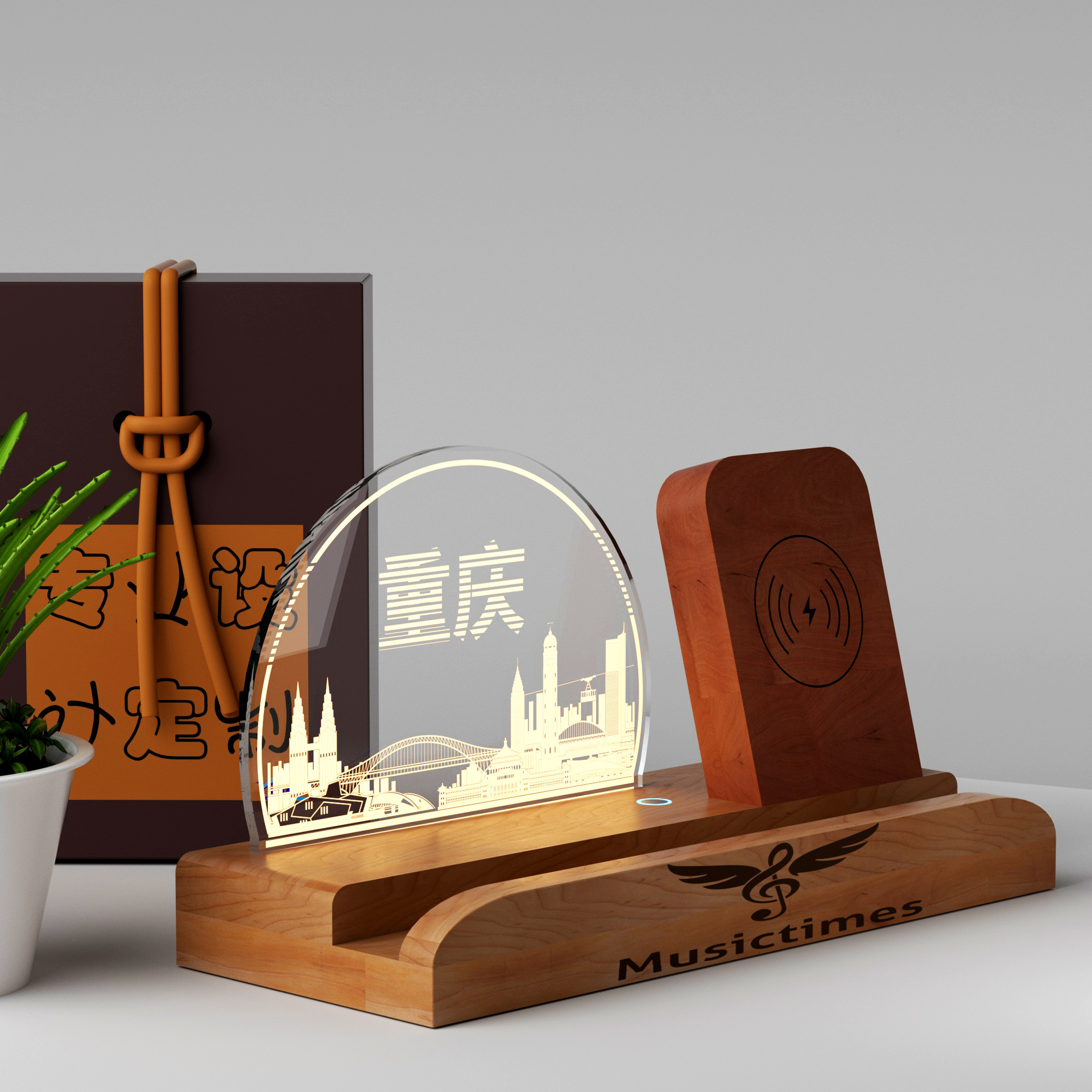기업 축하 비즈니스 선물 빛나는 아크릴 단단한 나무 야간 조명 휴대 전화 홀더 무선 고속 충전 데스크탑 장식품