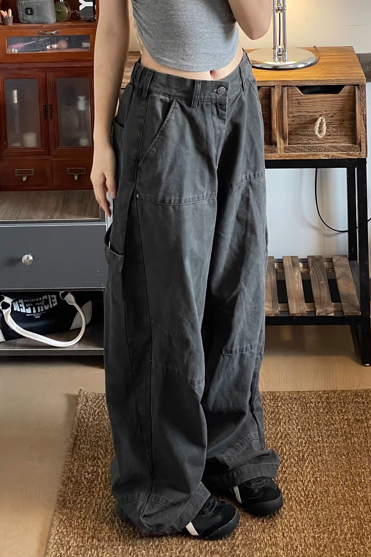 아메리칸 스타일 레트로 그레이 코일 청바지 여성의 가을 새 씻은 오래 된 스파이스 소녀 느슨한 넓은 다리 캐주얼 바지