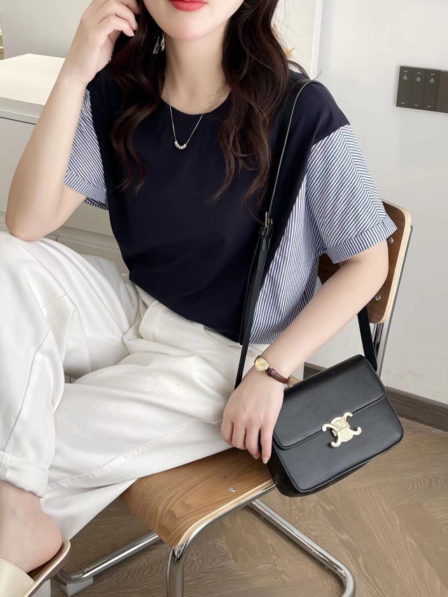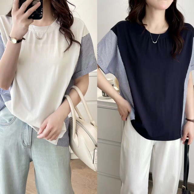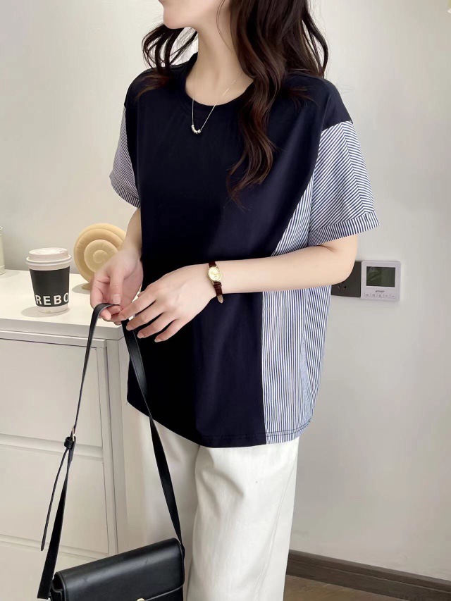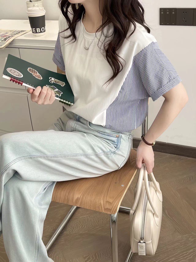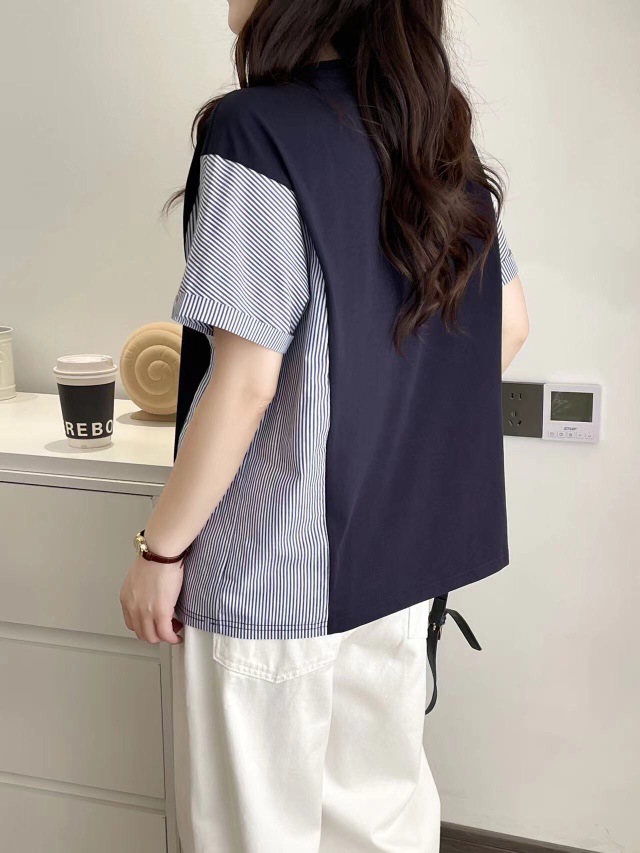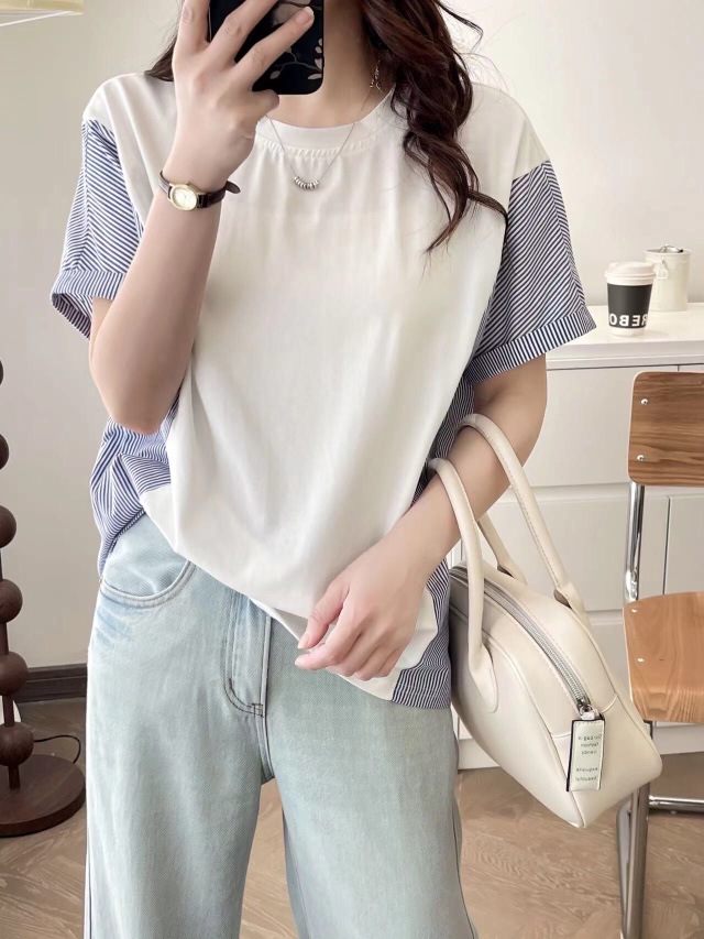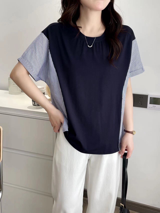 2025 여름 새 스타일 줄무늬 패치 워크 어깨 소매 반팔 티셔츠 여성용 크루 넥 스타일리시 디자인 틈새스토어 가기