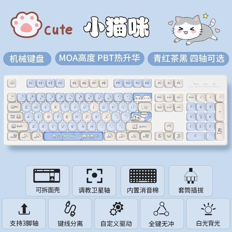 • Gaote Peach-Silent Axis-F104 흰색 배경 새끼 고양이 기계식 키보드