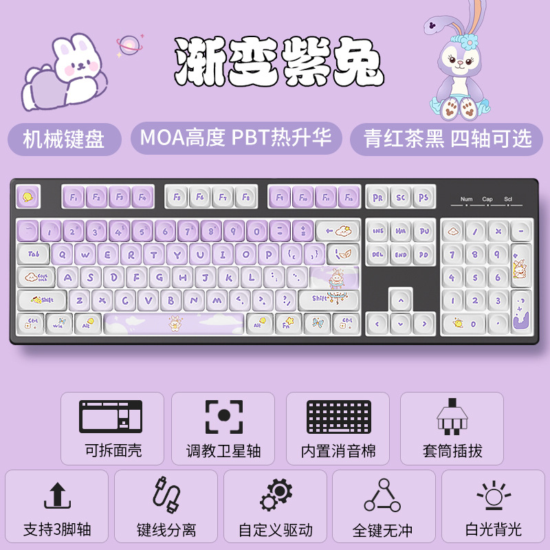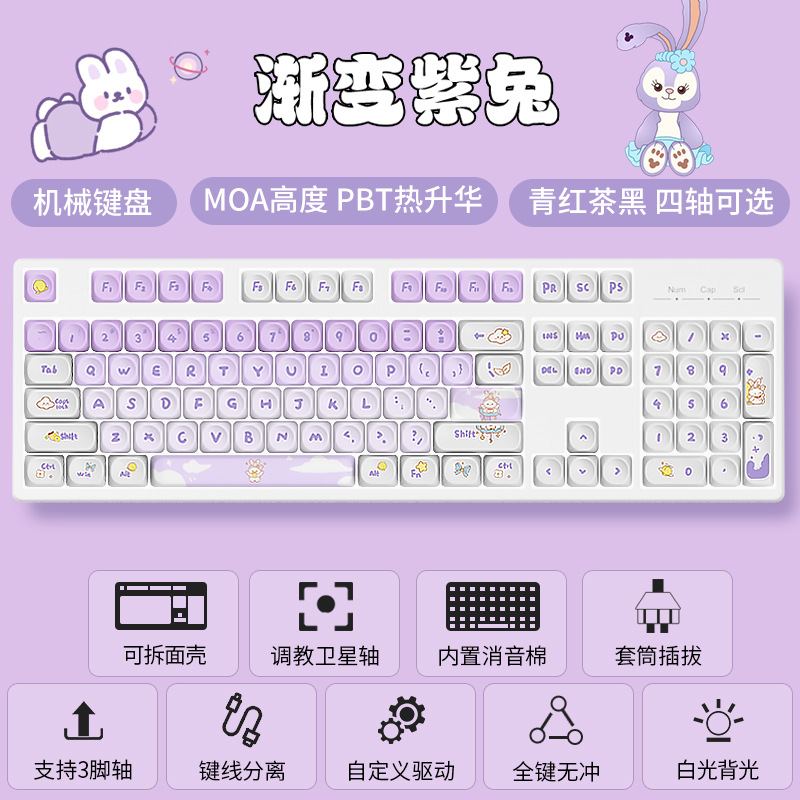 • Gaote Peach-Silent Axis-F104 흰색 배경 그라데이션 보라색 토끼 기계식 키보드
