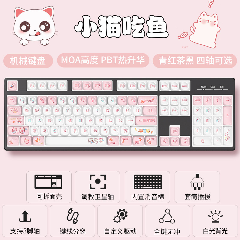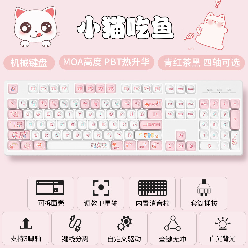 • Gaote Peach-Silent Axis-F104 흰색 배경 새끼 고양이 먹는 물고기 기계식 키보드