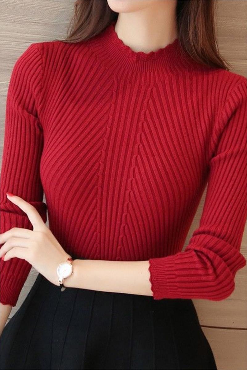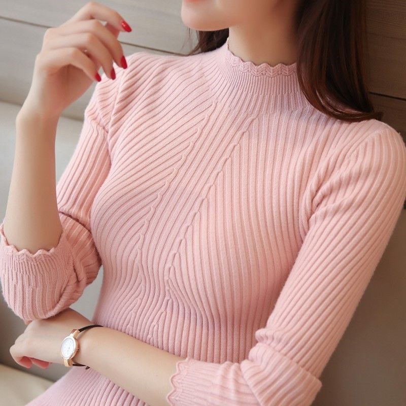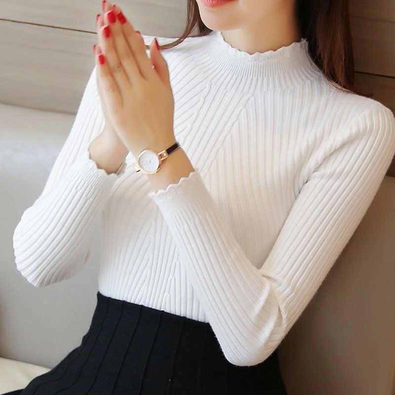 레이스 슬림 하프 터틀넥 스웨터 여성 가을, 겨울 기본 셔츠 한국 스타일 꽃잎 풀오버 긴팔 다용도 새 스웨터스토어 가기