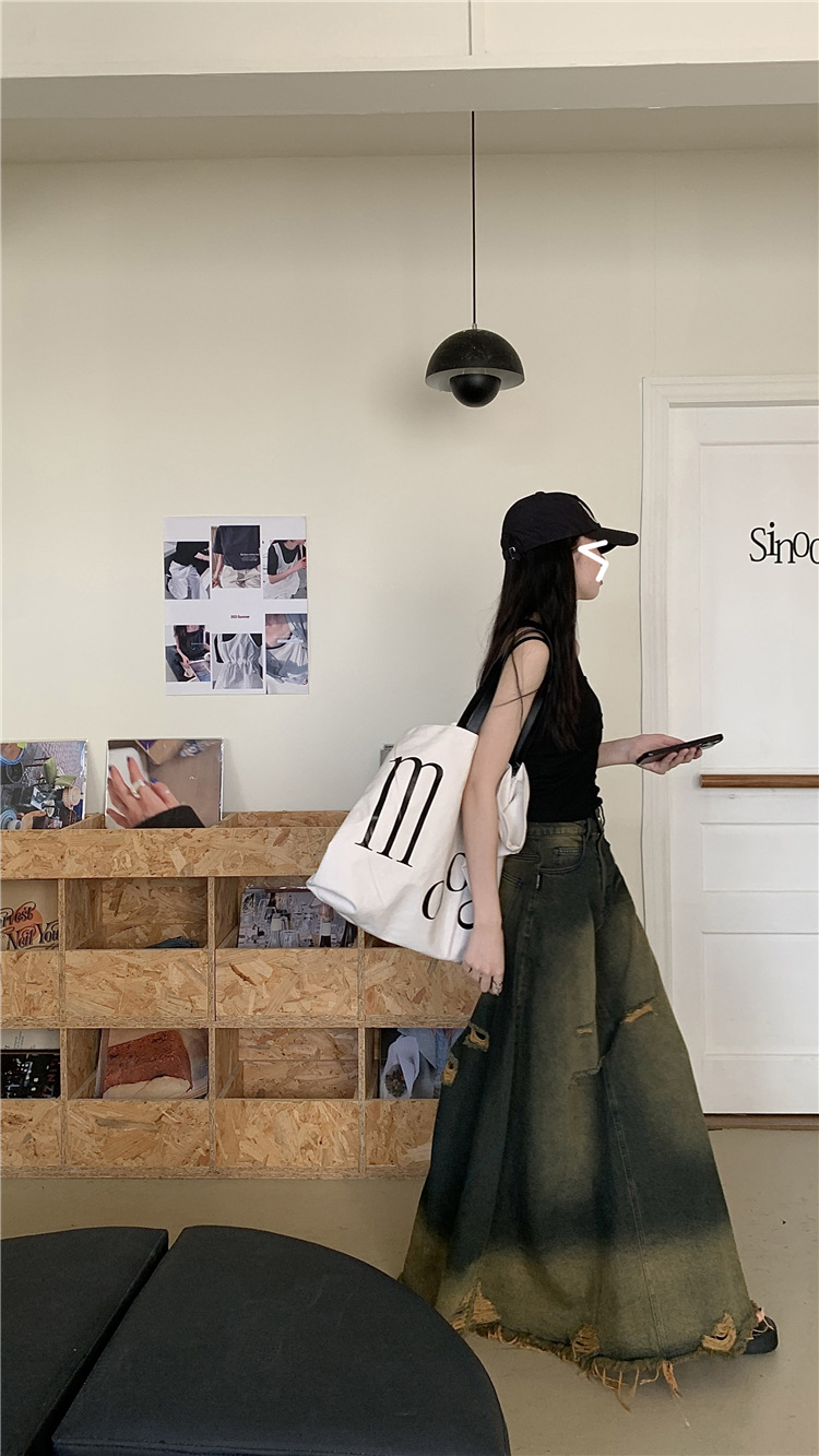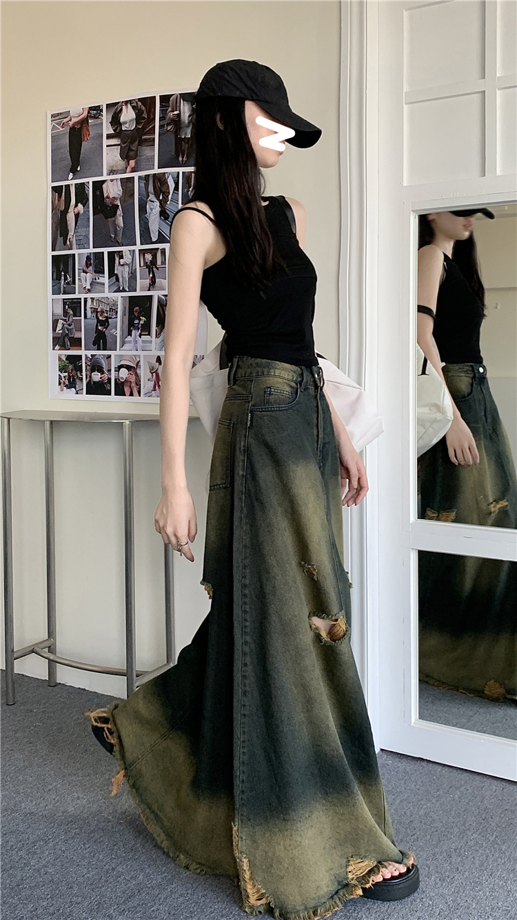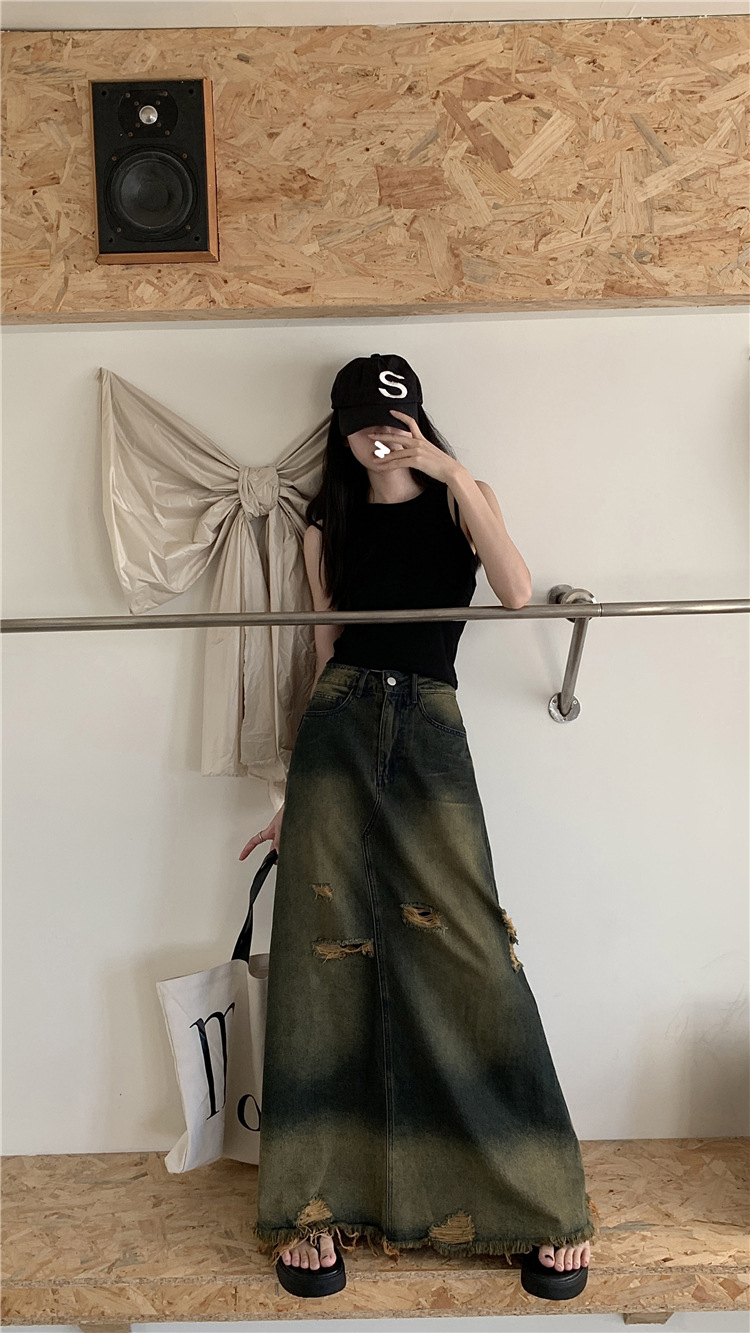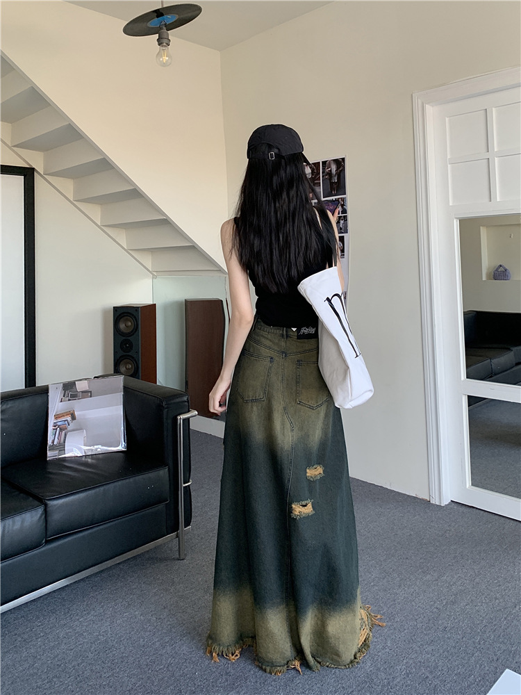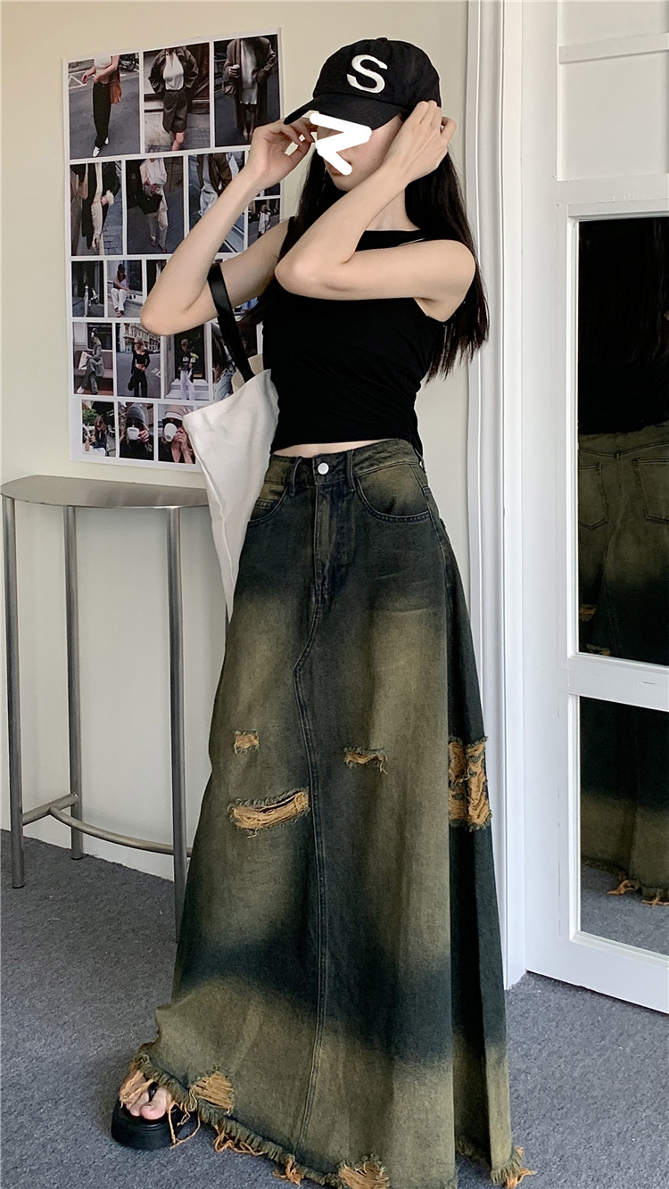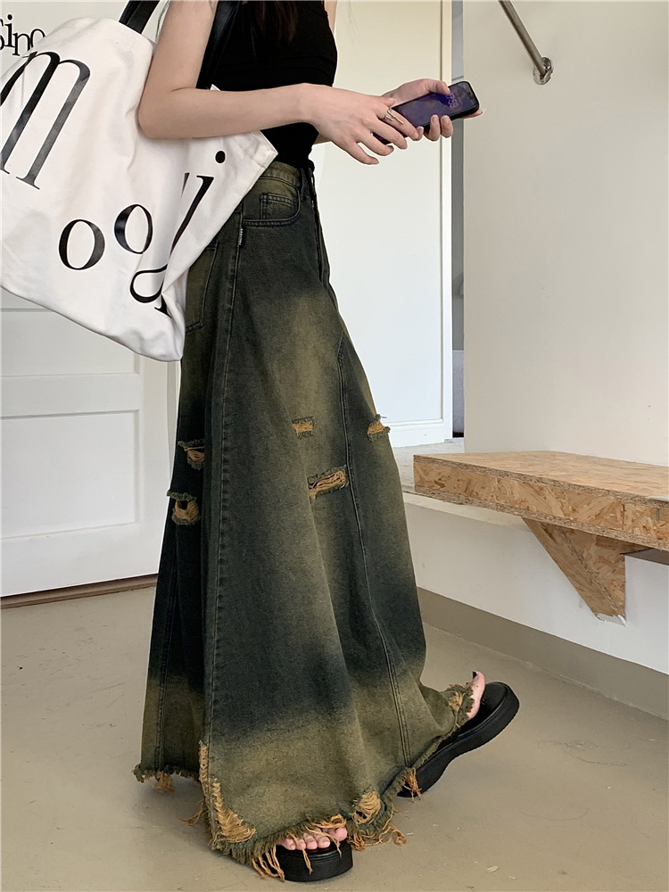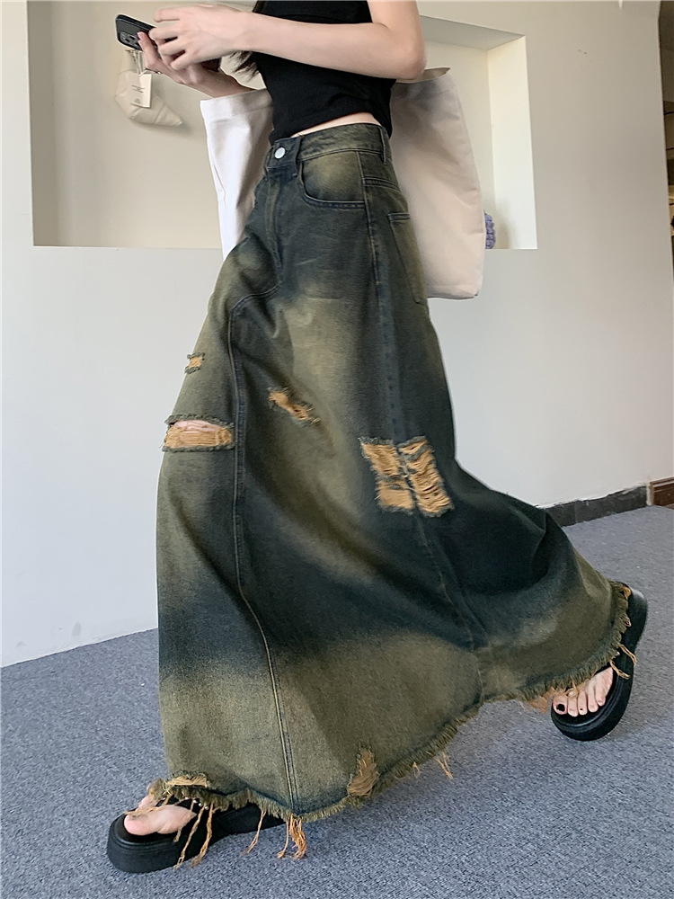 향수 레트로 버 홀 데님 스커트 여성 2023 가을 새로운 하이 웨이스트 슬림 A 라인 스커트 롱 스커트스토어 가기