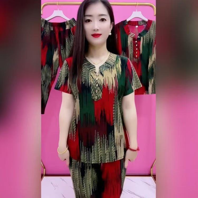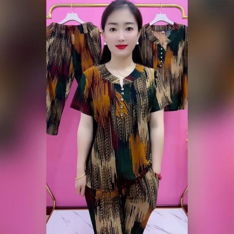 헤어 어머니의 여름 새로운 중년 여성 반팔 티셔츠 세트 패션 통기성 높은 탄성 투피스 세트의 세대