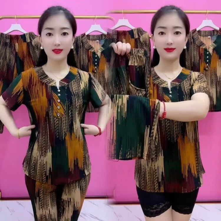 헤어 어머니의 여름 새로운 중년 여성 반팔 티셔츠 세트 패션 통기성 높은 탄성 투피스 세트의 세대스토어 가기