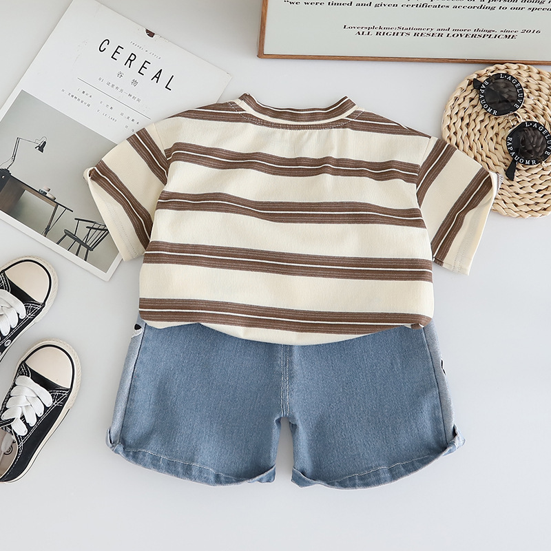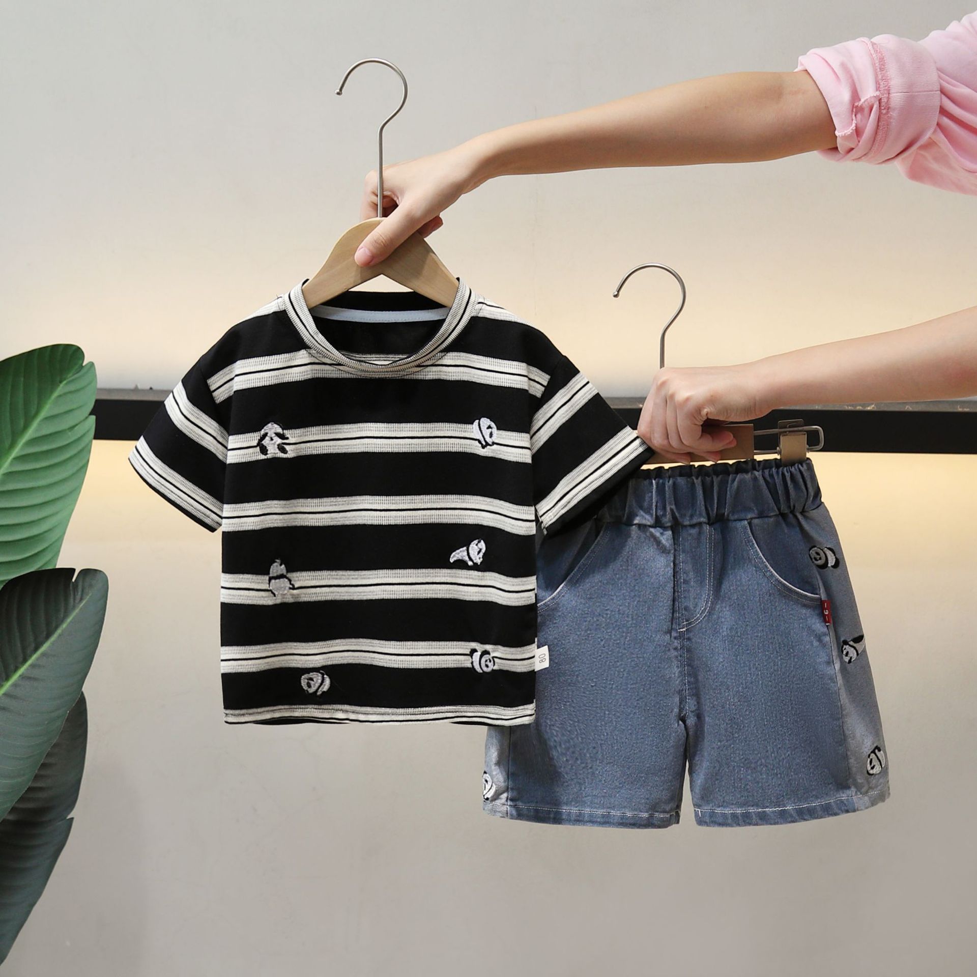 소년 소녀 아기 여름 면화 T 짧은 소매 세트 잘 생긴 유행 1-5 세 줄무늬 옷 대외 무역 공장 아동복 도매스토어 가기