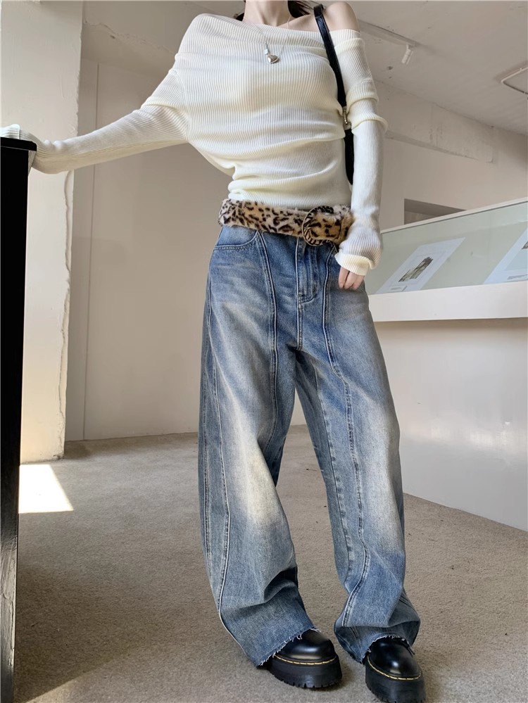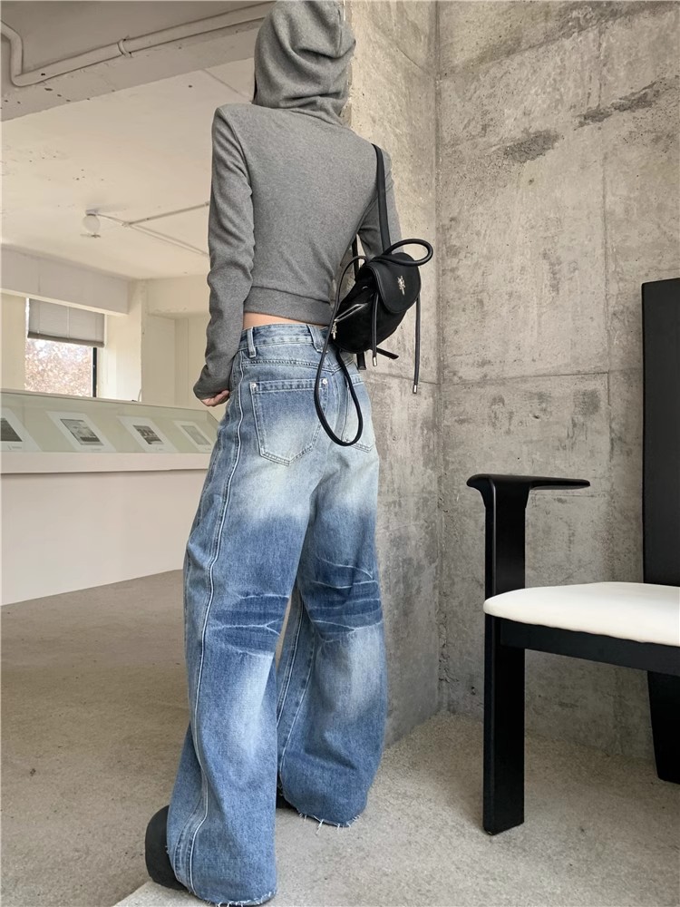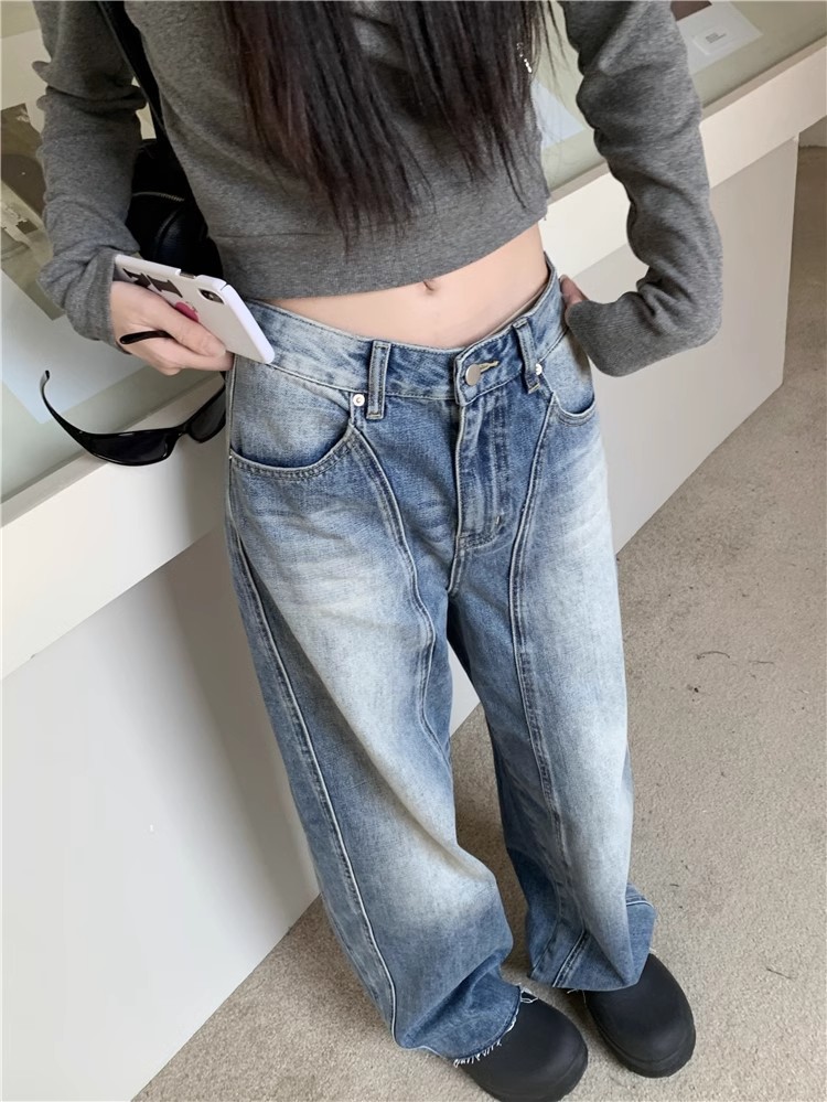 아메리칸 스타일 빈티지 바느질 세탁 청바지 여성용 가을 구식 모직 와이드 레그 팬츠 루즈 슬리밍 스트레이트 바지 바지스토어 가기