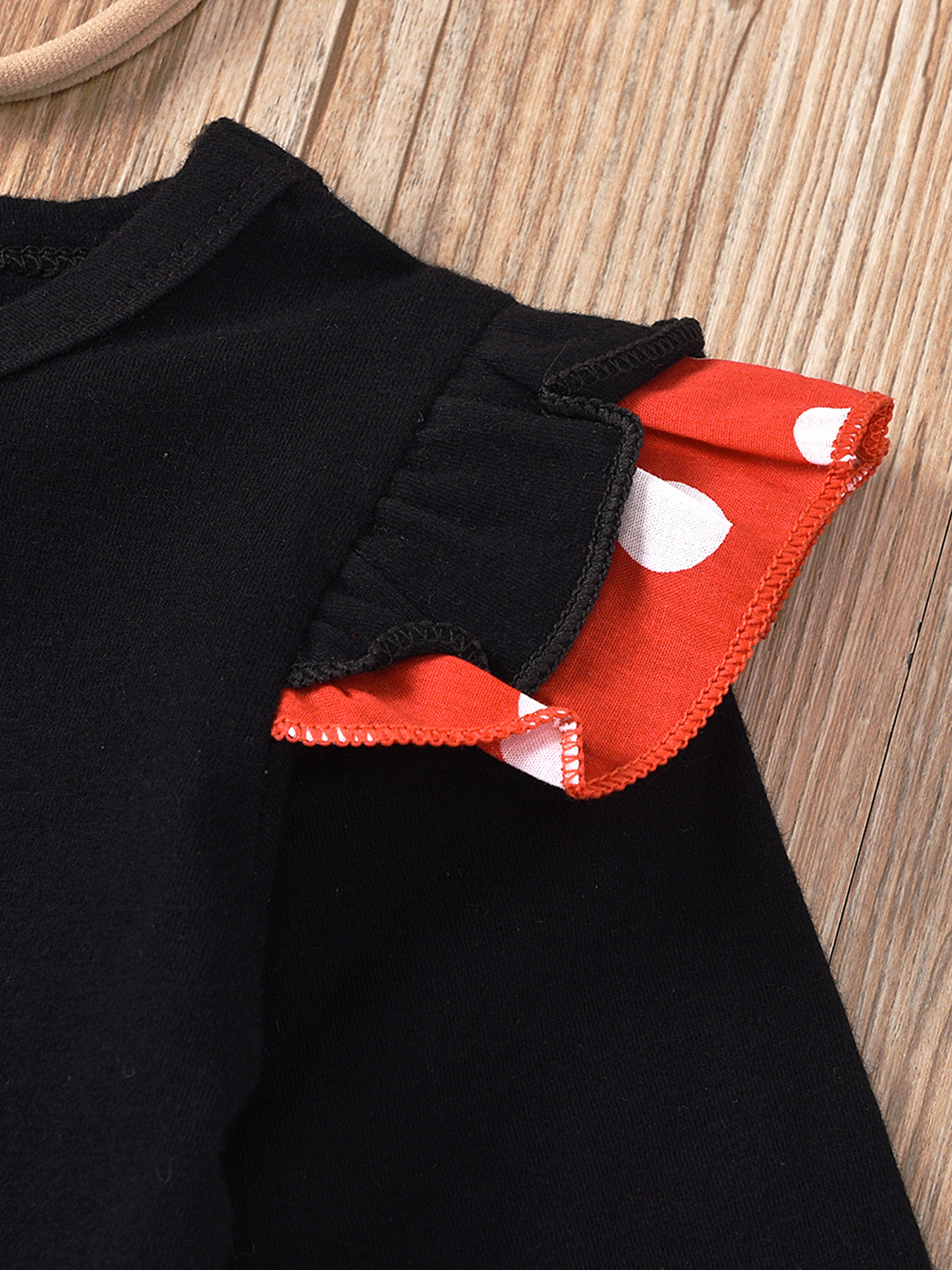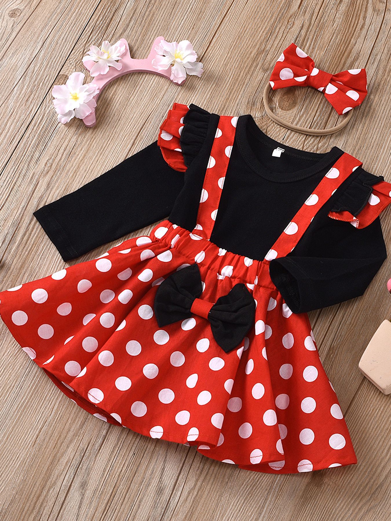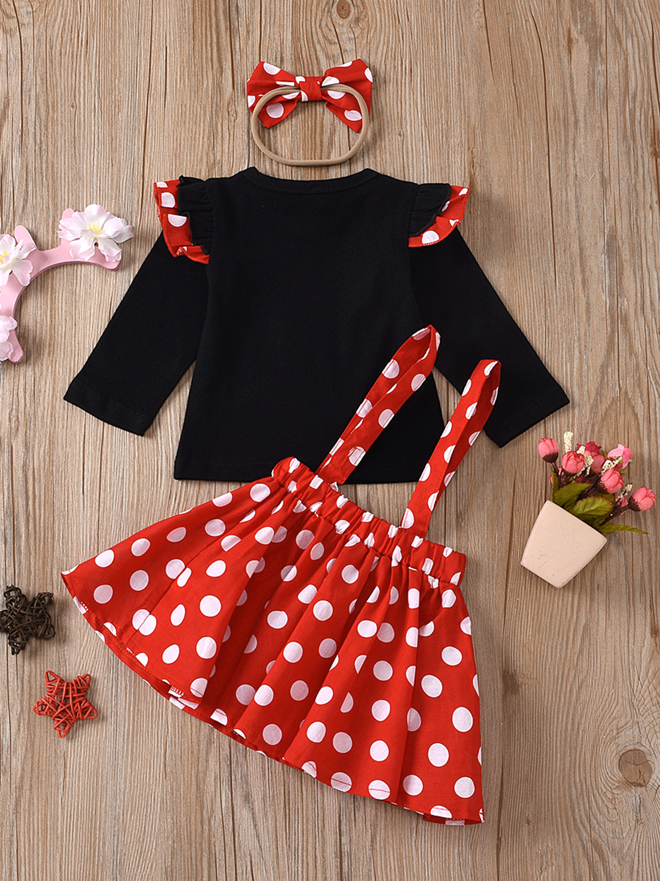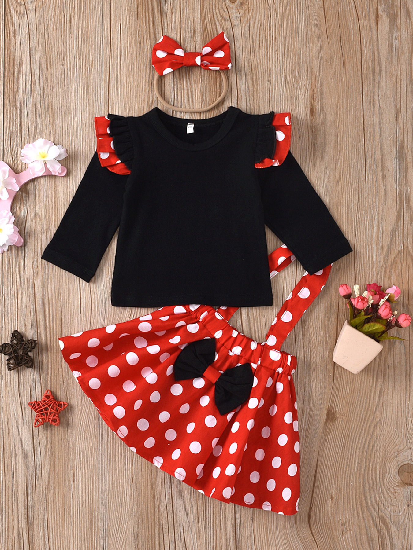 유럽과 미국 스타일의 국경 간 소녀 봄과 가을 폴카 도트 세트 3 피스 세트 귀여운 나비 헤어 밴드 폴카 도트 스트랩 스커트 세트
