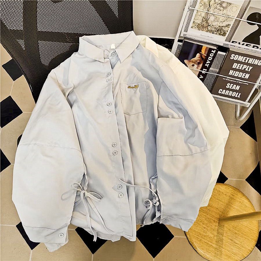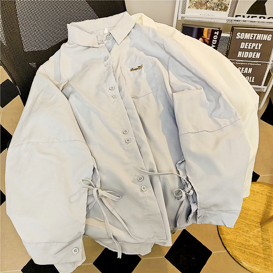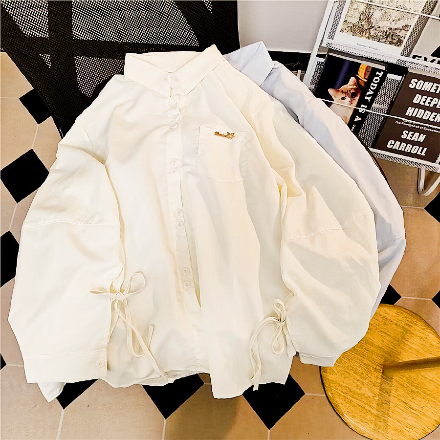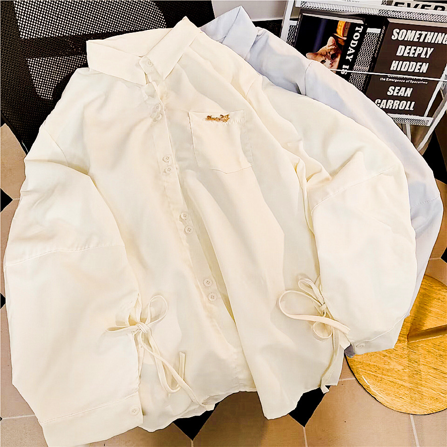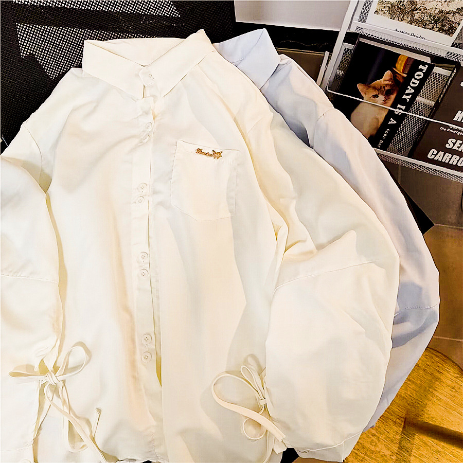 실제 샷 재고 봄과 가을 여성 의류 대학 스타일 나이를 줄이는 긴팔 셔츠 여성용 루즈 스트랩 게으른 스타일 탑 셔츠스토어 가기