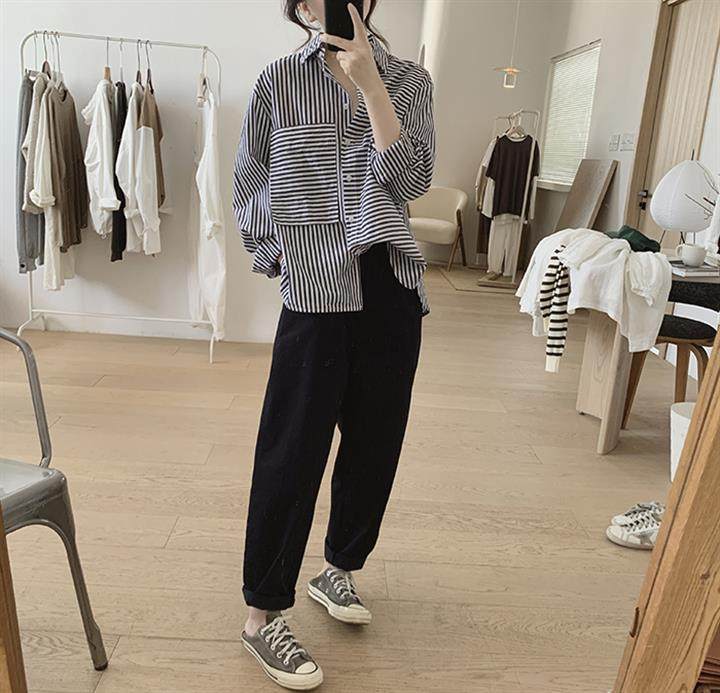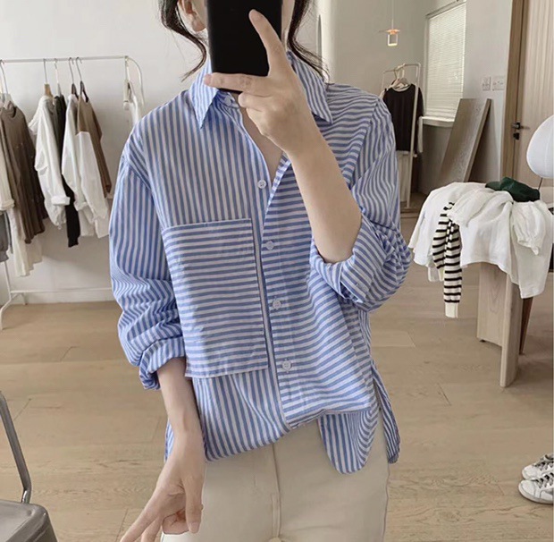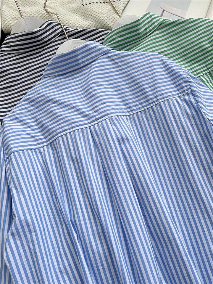 2025 봄 줄무늬 셔츠 여성의 느슨한 슬리밍 큰 포켓 간단한 긴 소매 분할 캐주얼 탑