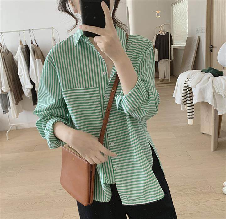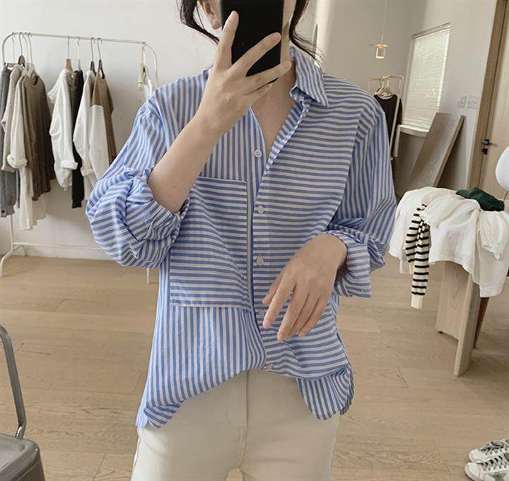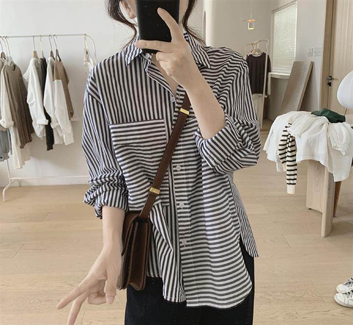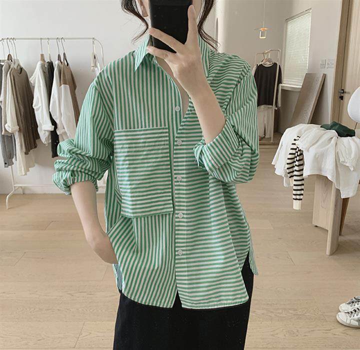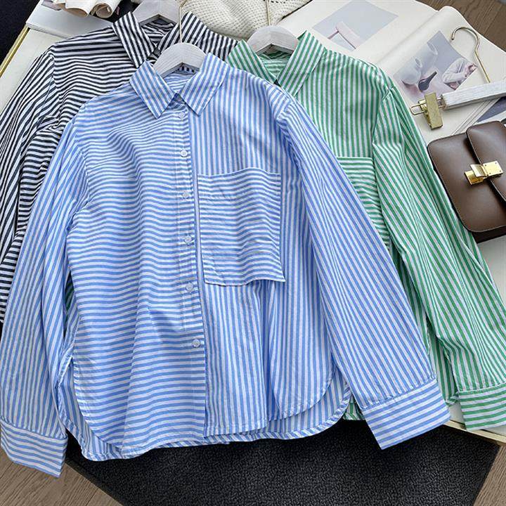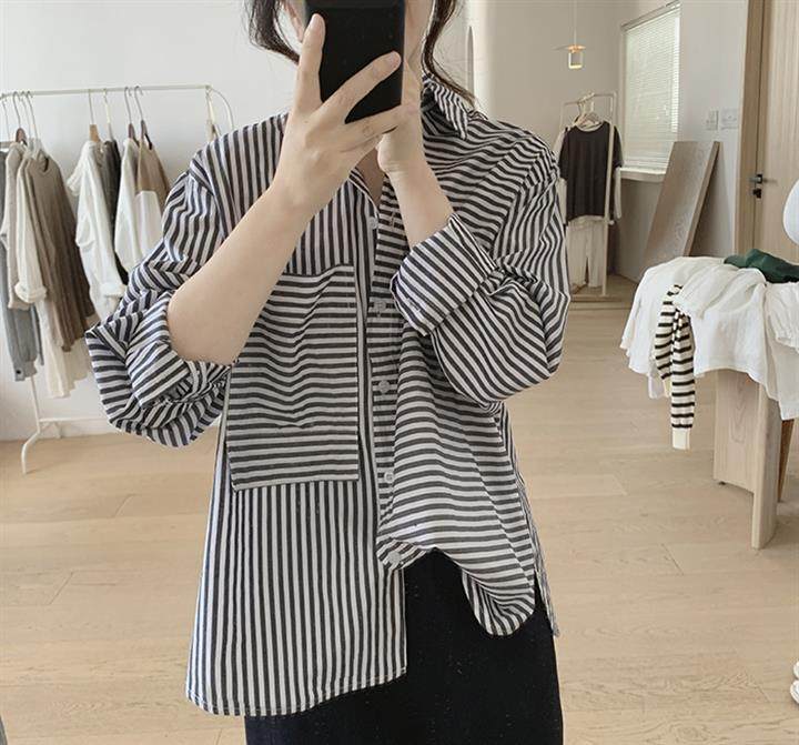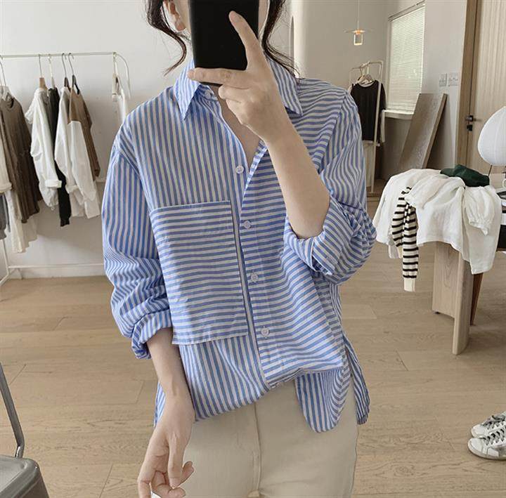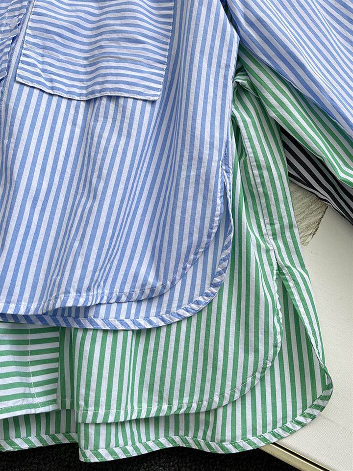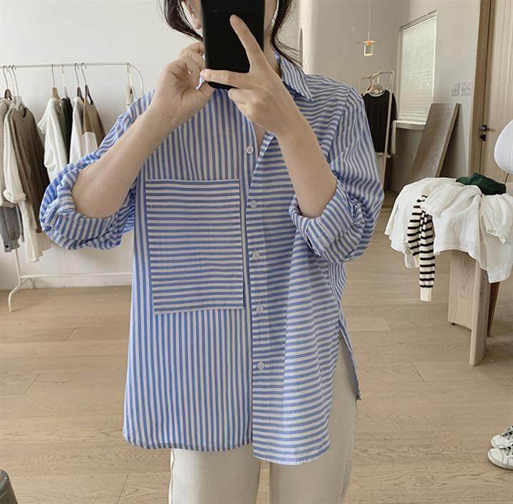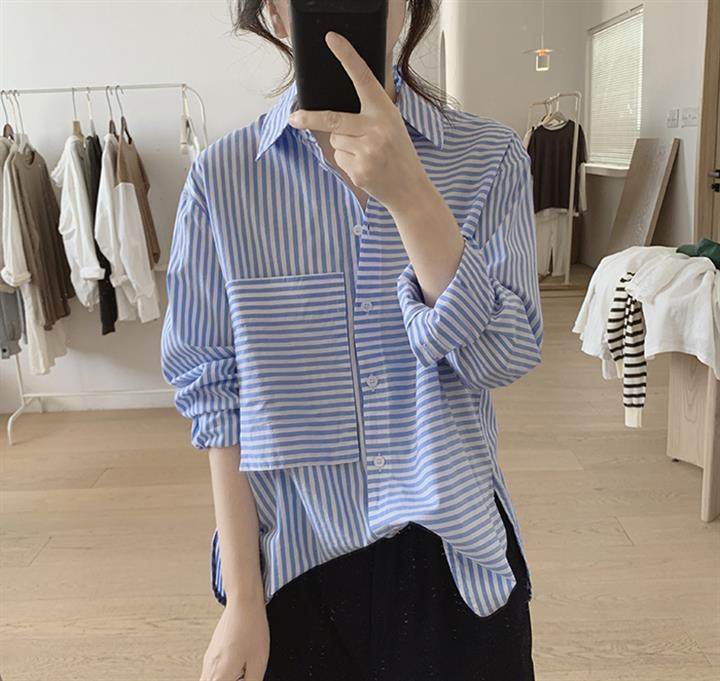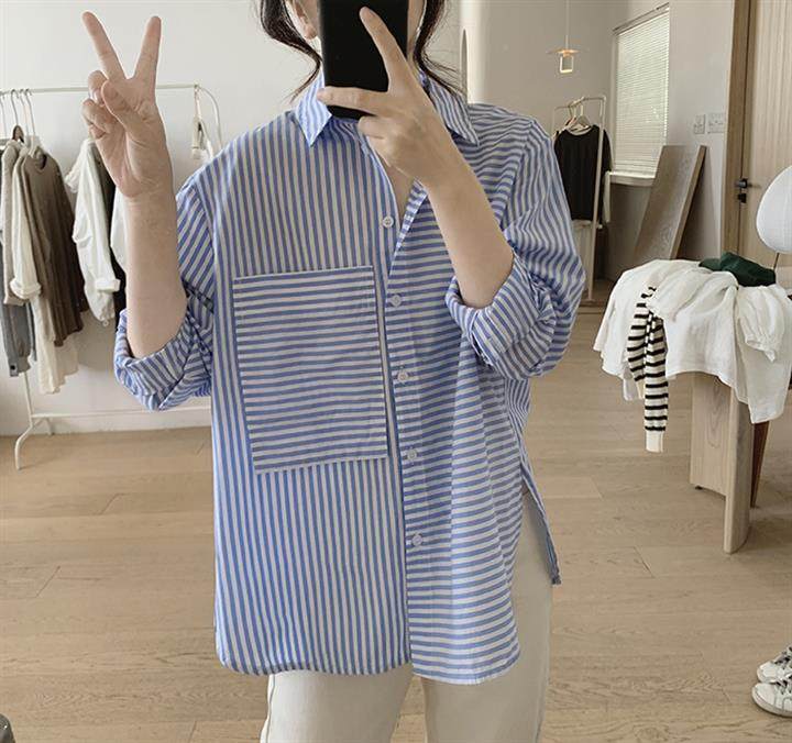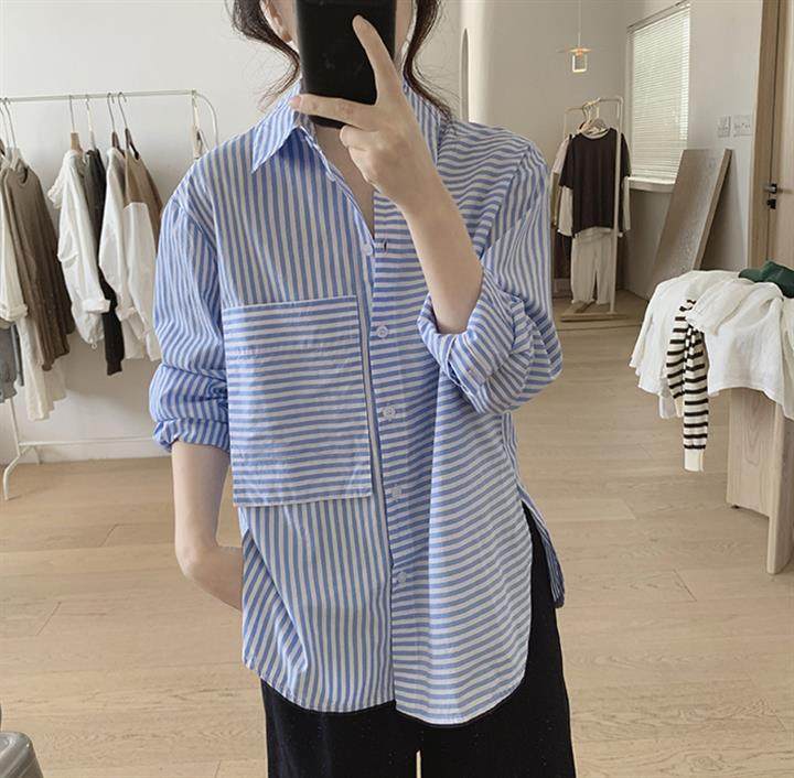 2025 봄 줄무늬 셔츠 여성의 느슨한 슬리밍 큰 포켓 간단한 긴 소매 분할 캐주얼 탑스토어 가기