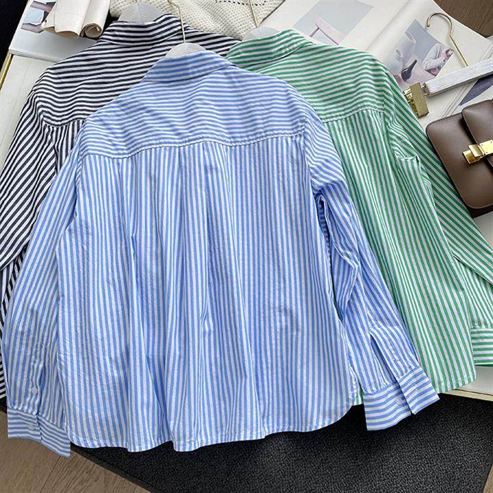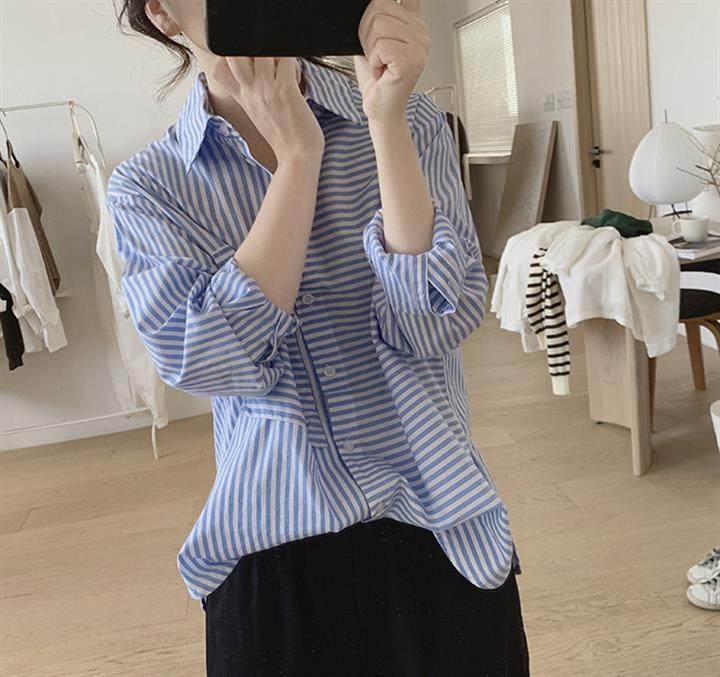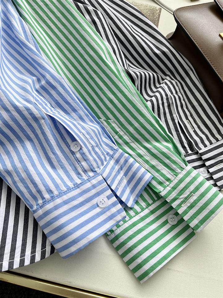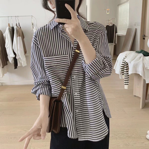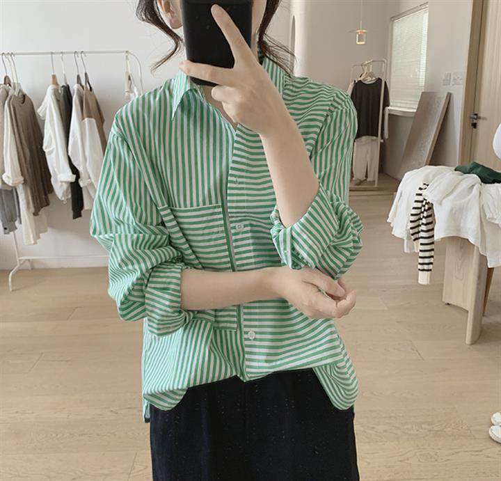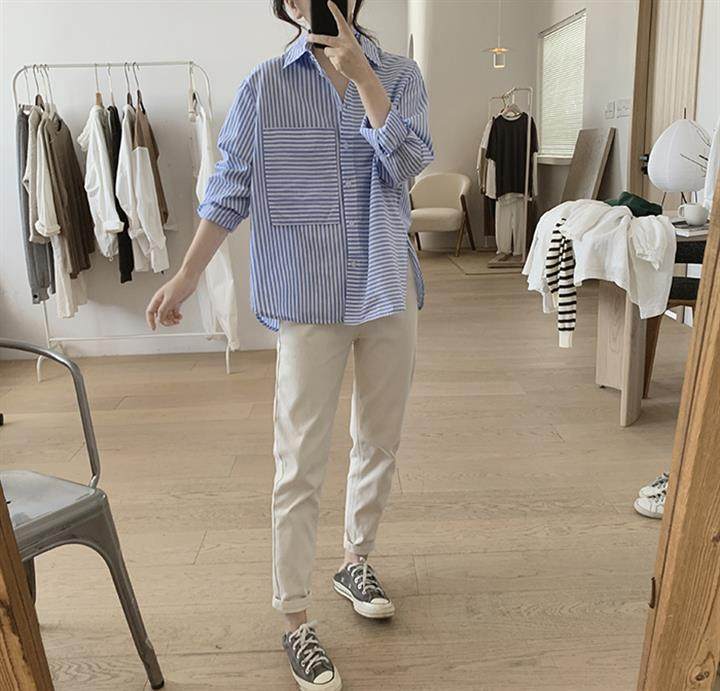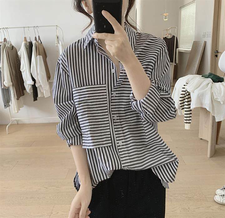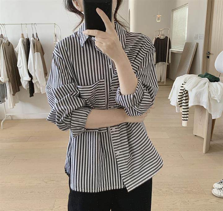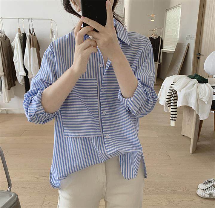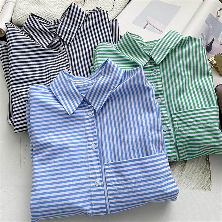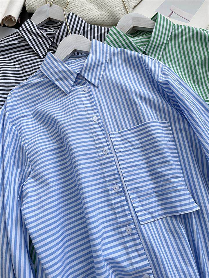2025 봄 줄무늬 셔츠 여성의 느슨한 슬리밍 큰 포켓 간단한 긴 소매 분할 캐주얼 탑스토어 가기