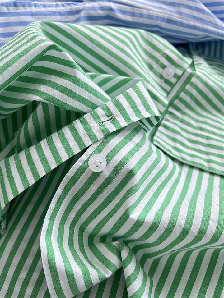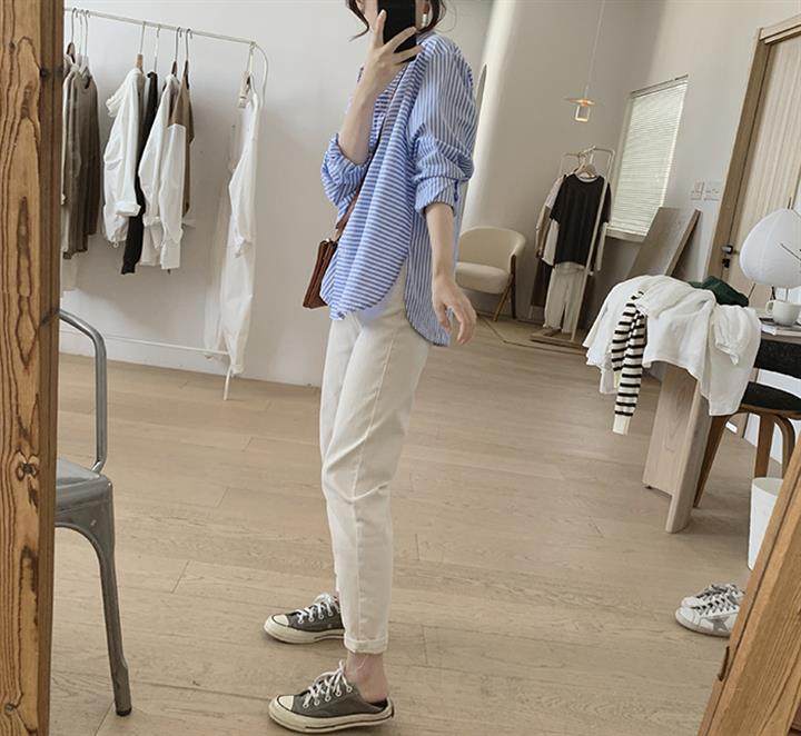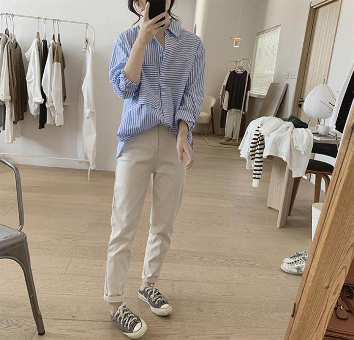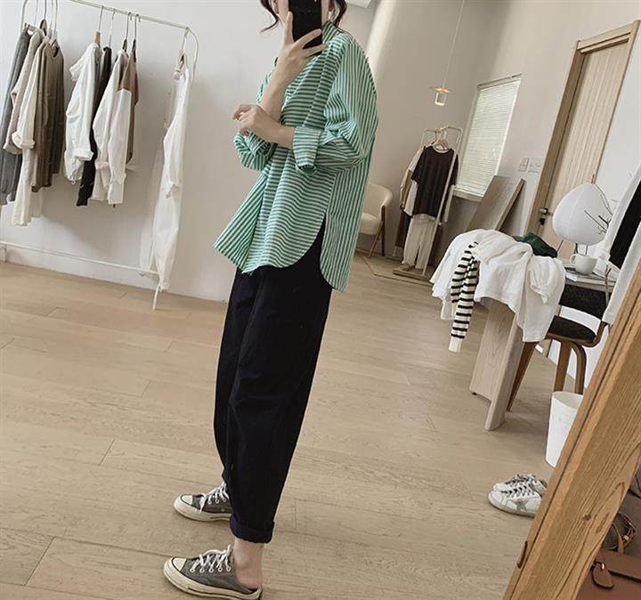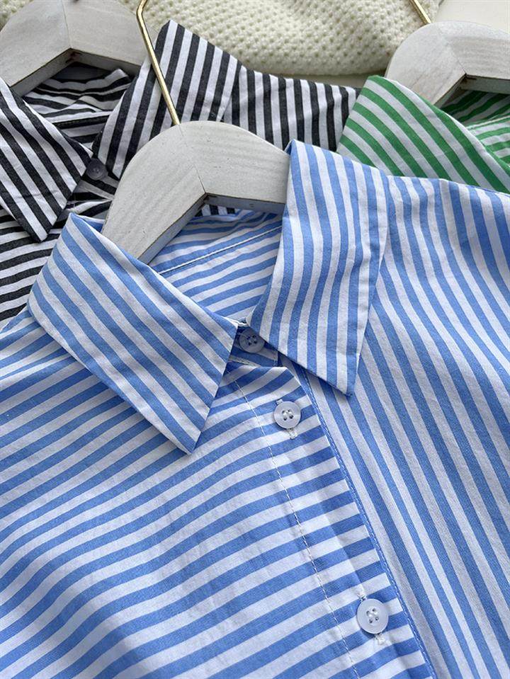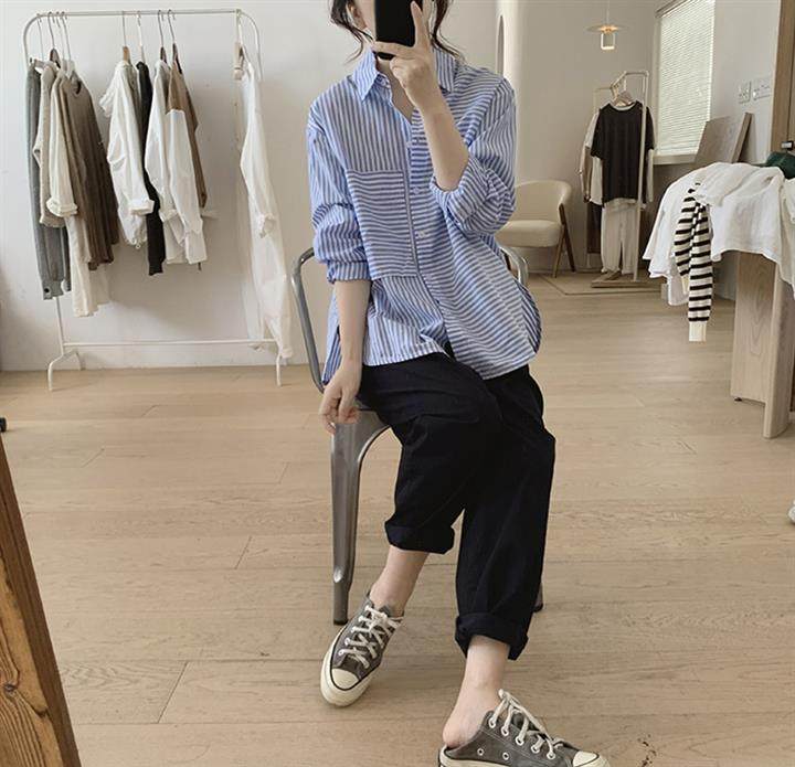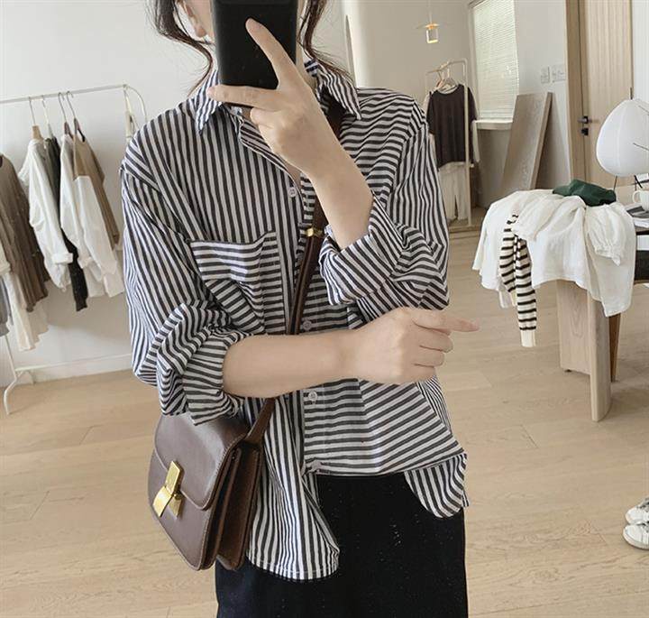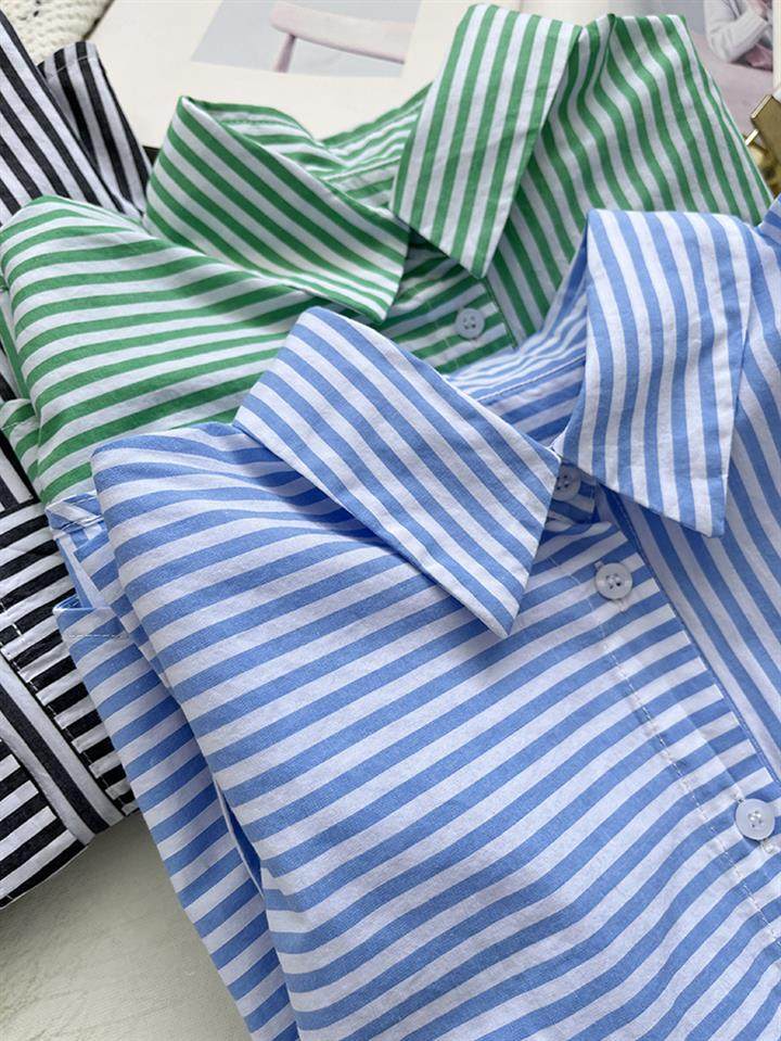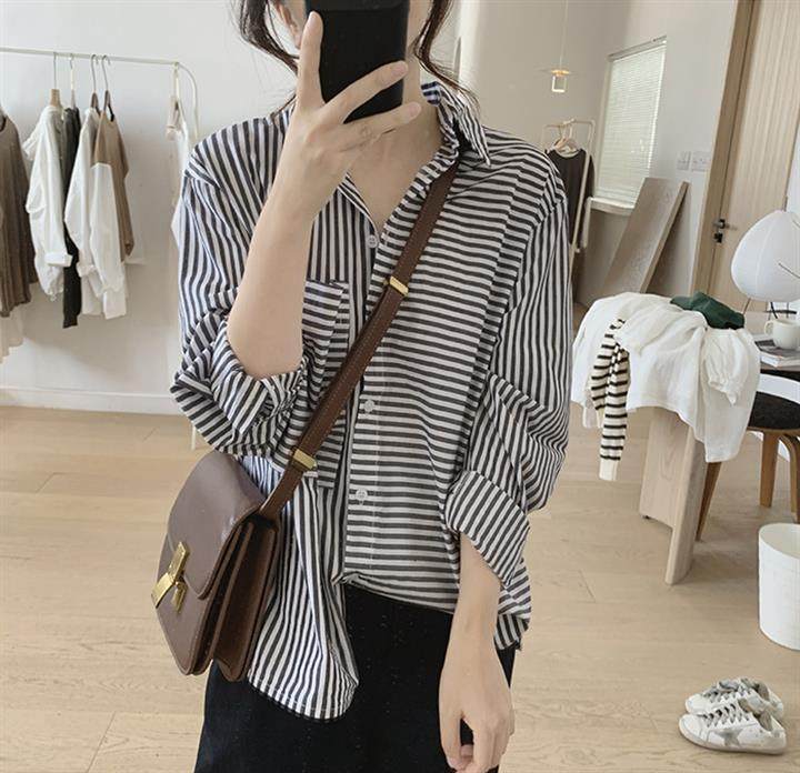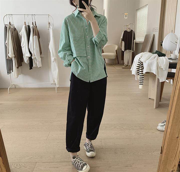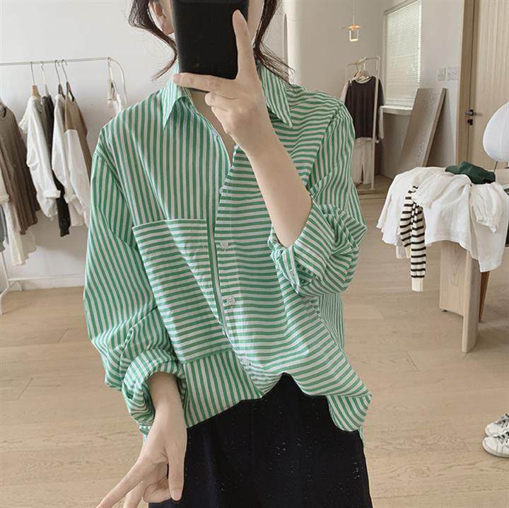 2025 봄 줄무늬 셔츠 여성의 느슨한 슬리밍 큰 포켓 간단한 긴 소매 분할 캐주얼 탑스토어 가기