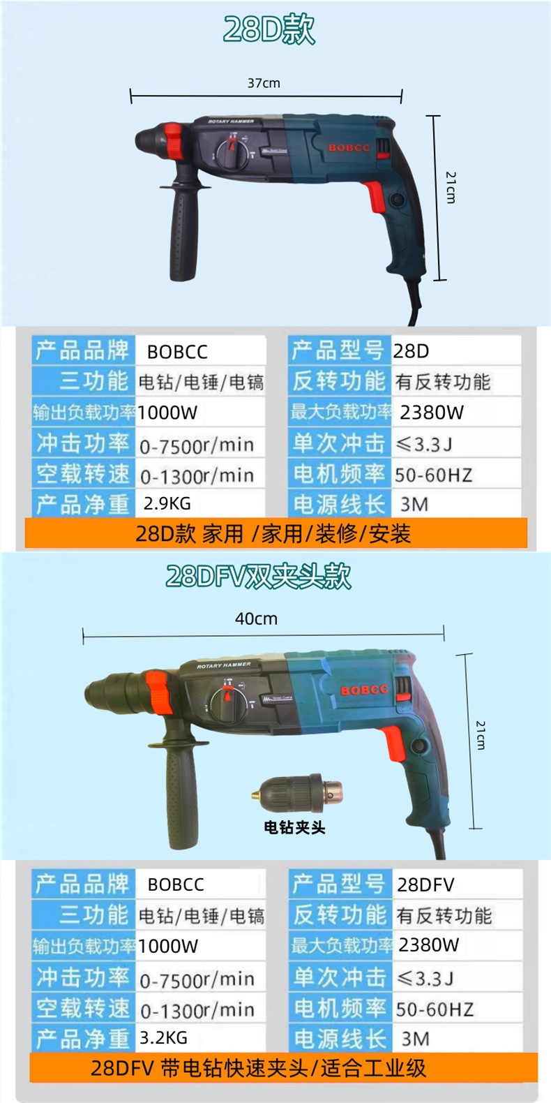 의사의 BOBCC 가벼운 전기 해머 전기 픽 전기 드릴 3 사용 다기능 고성능 충격 드릴 가정용 콘크리트