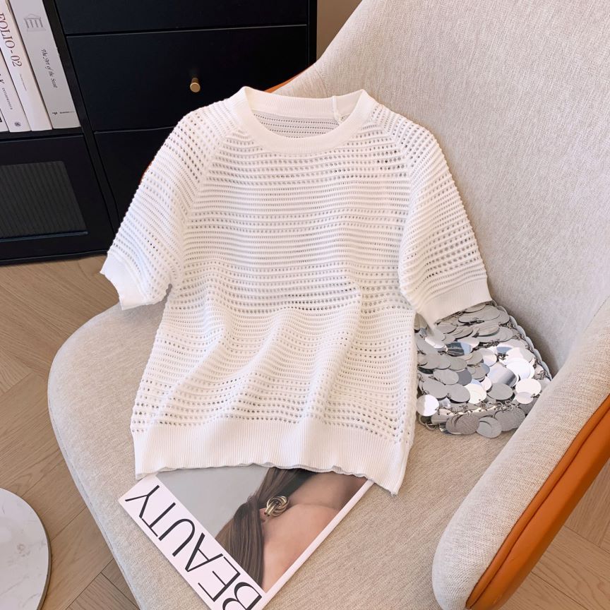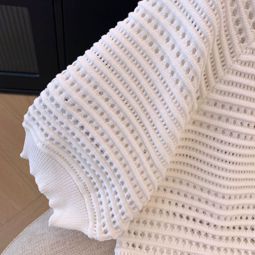 봄과 여름 2025 새로운 프랑스 고급 중공업 크로 셰 뜨개질 할로우 니트 셔츠 탑 캐주얼 반팔 티셔츠 여성용 여름