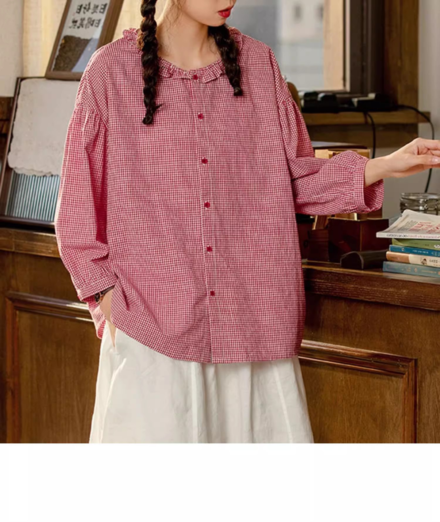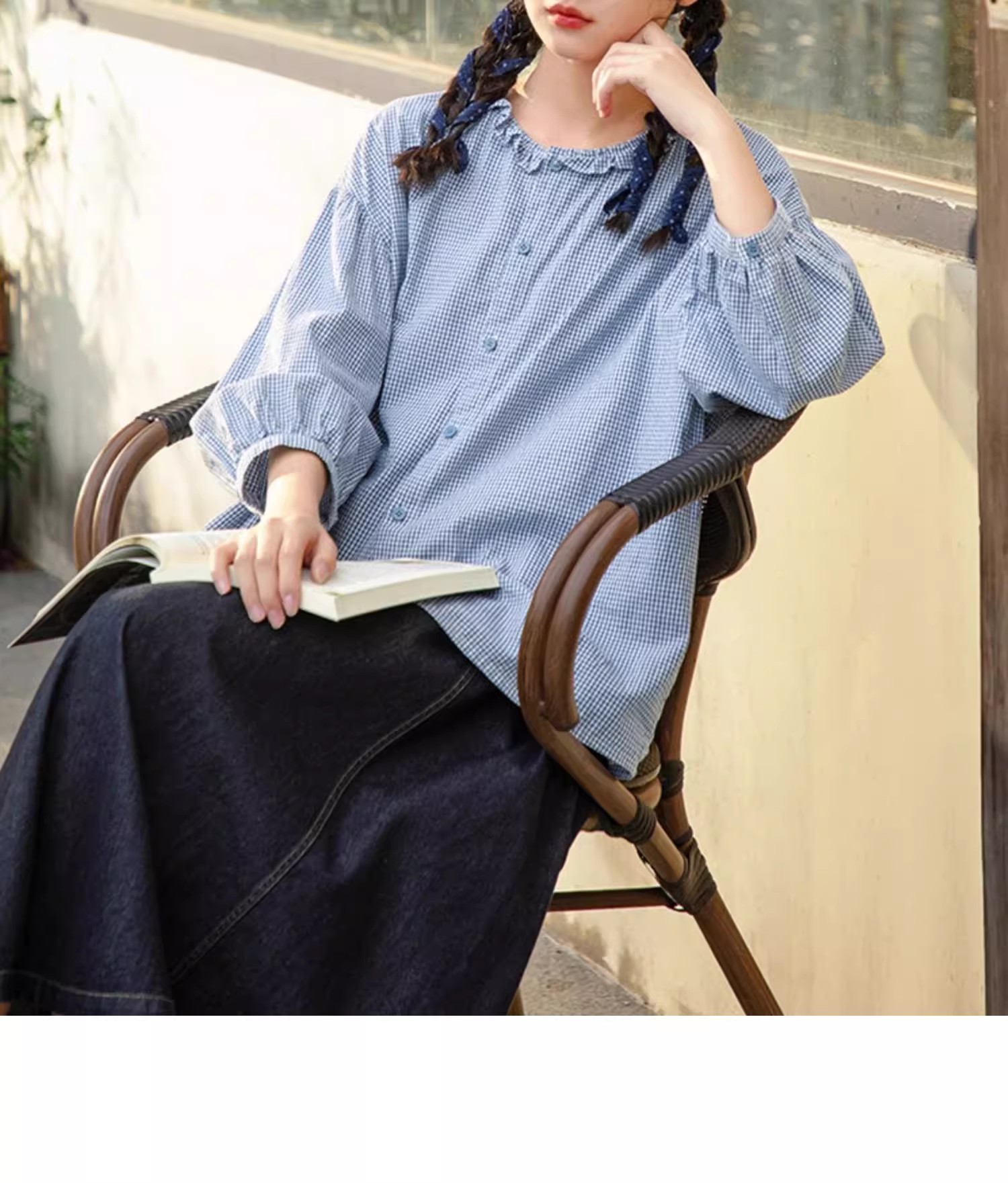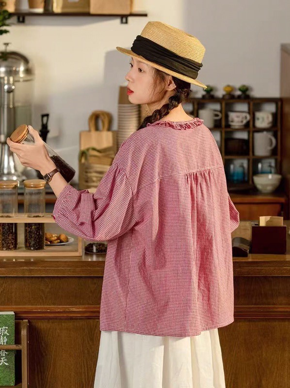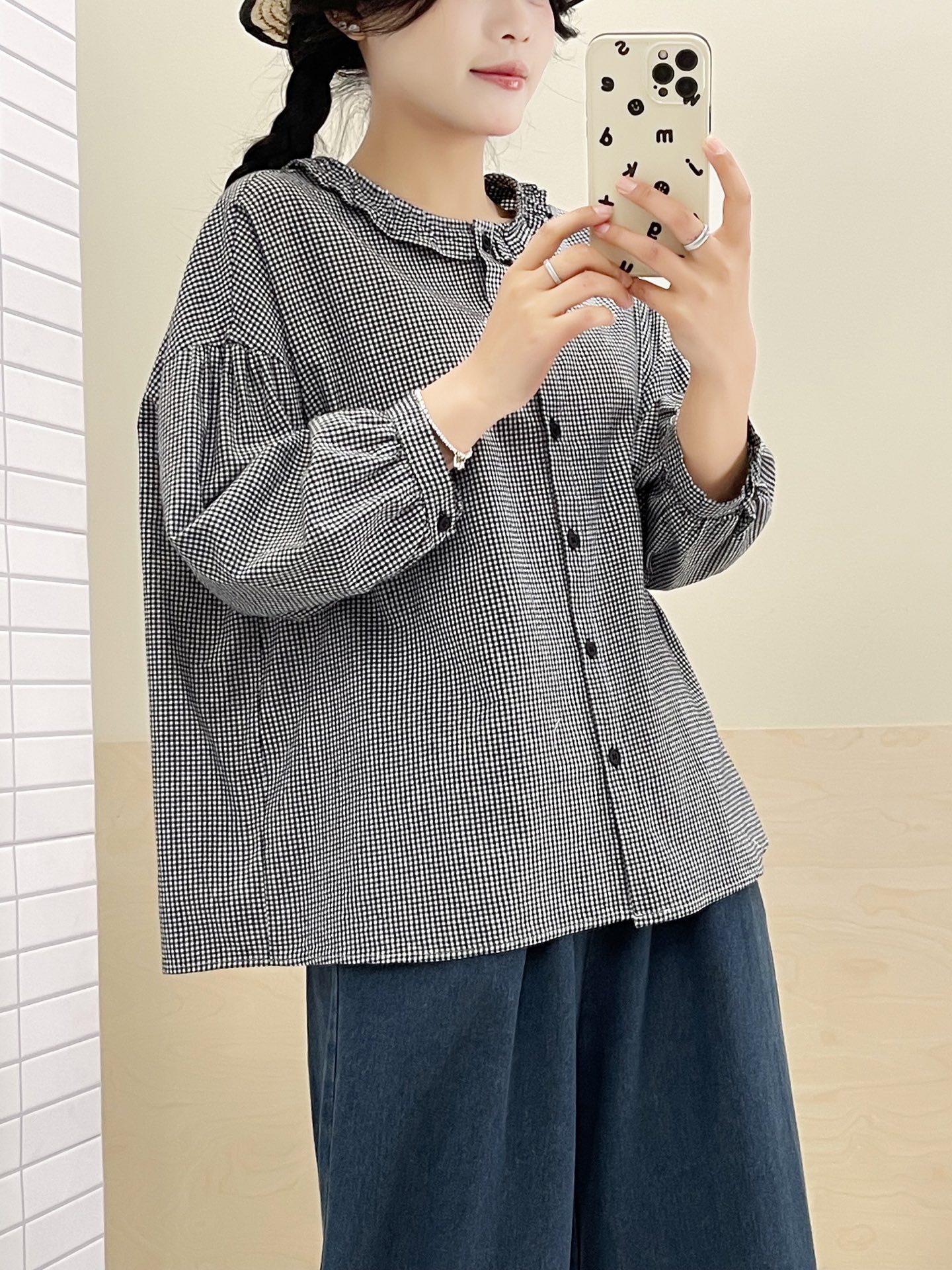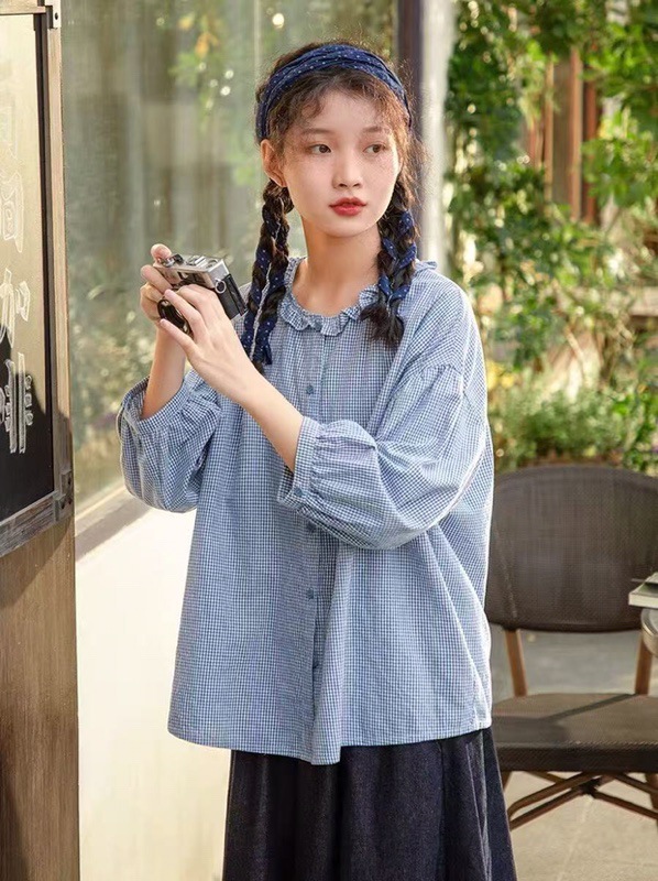 2025 봄 새 셔츠 모리 여자 일본 스타일 캐주얼 체크 무늬 레이스 칼라 올 매치 롱 슬리브 탑 셔츠스토어 가기