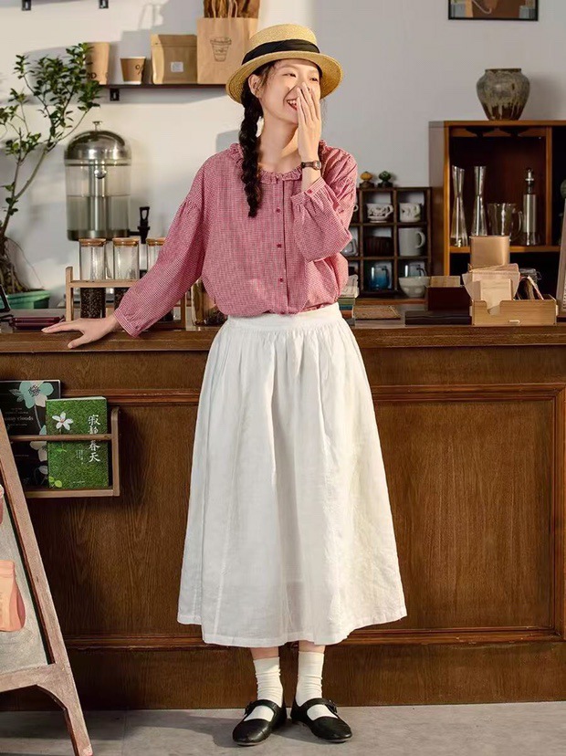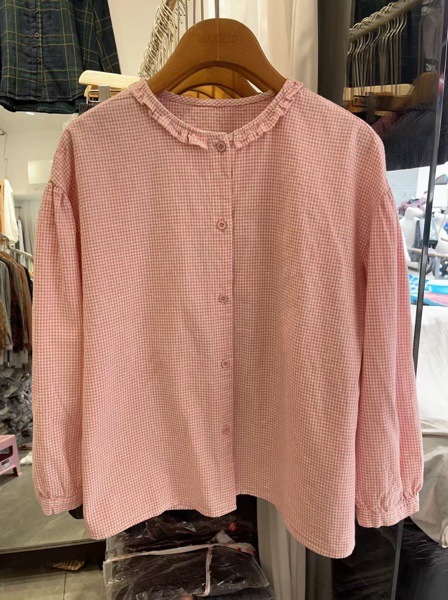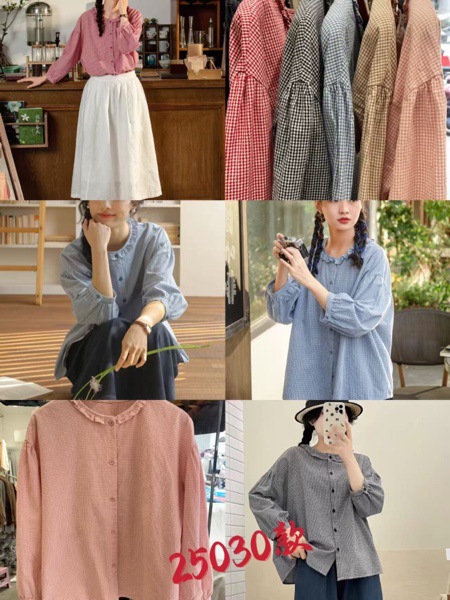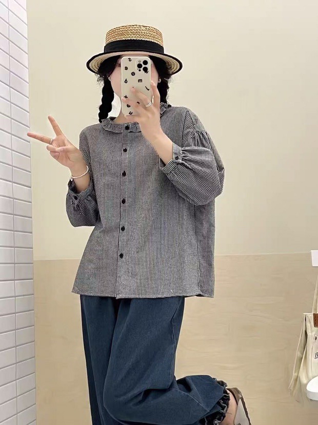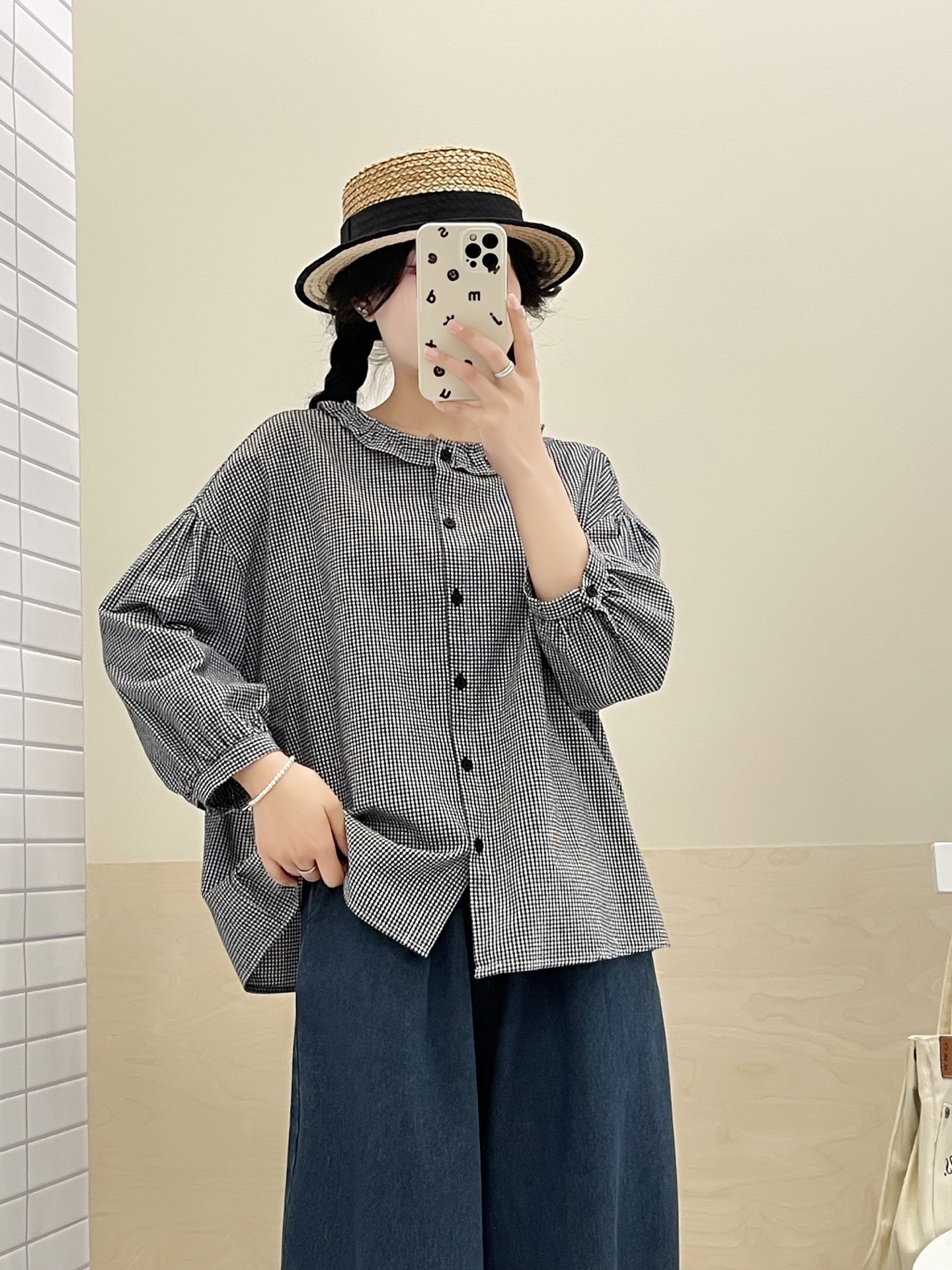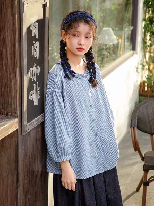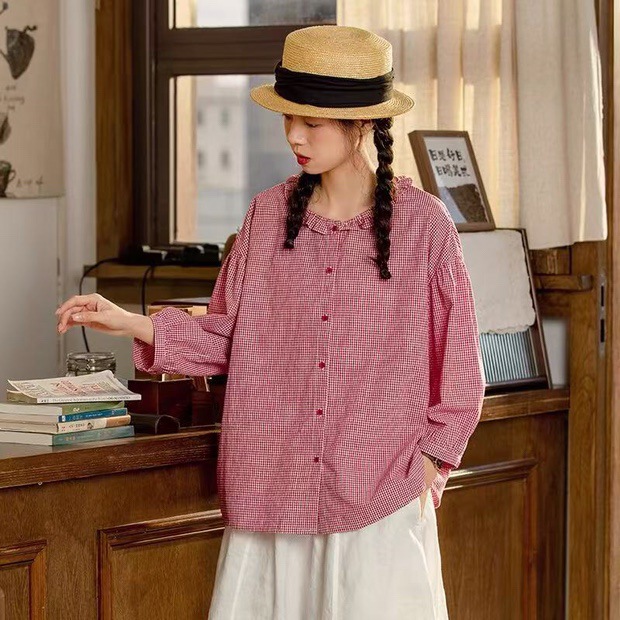 2025 봄 새 셔츠 모리 여자 일본 스타일 캐주얼 체크 무늬 레이스 칼라 올 매치 롱 슬리브 탑 셔츠스토어 가기