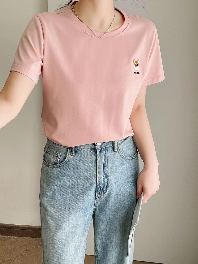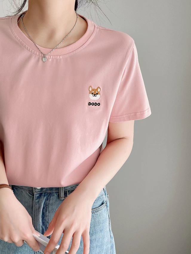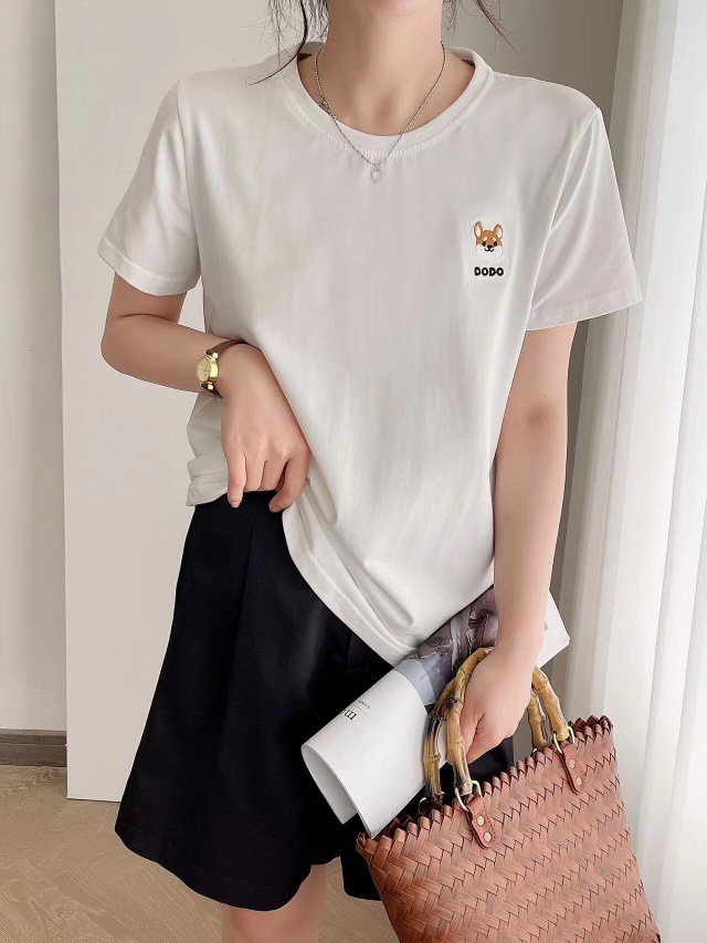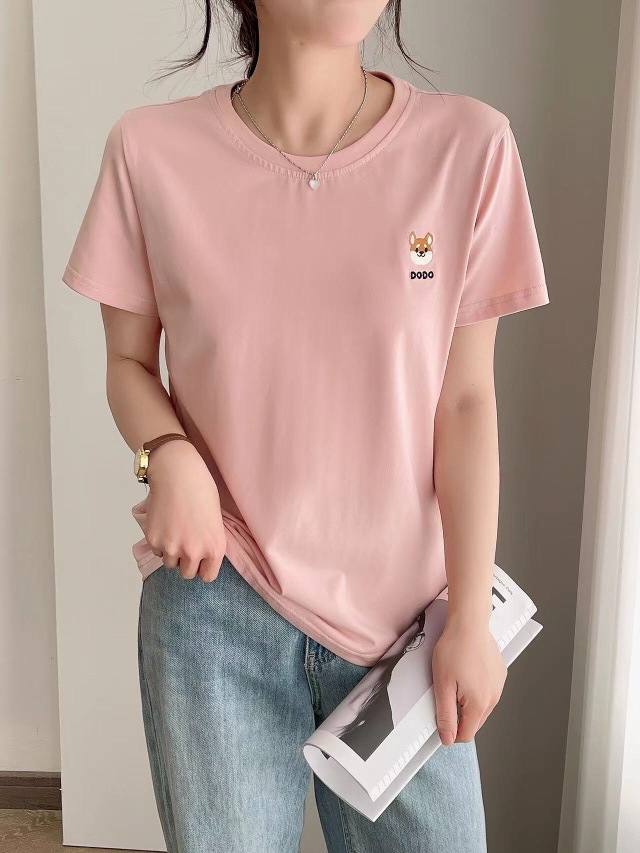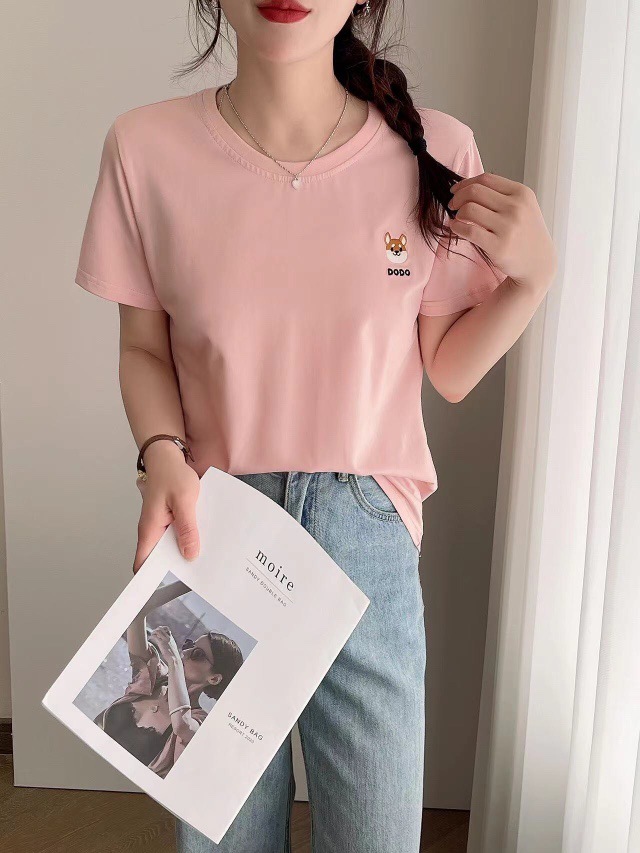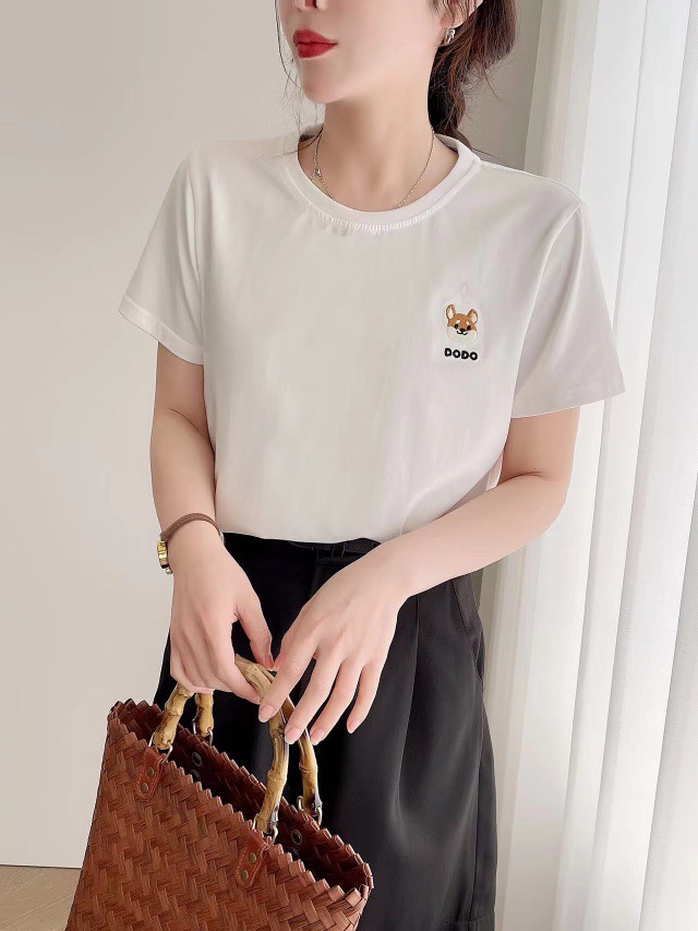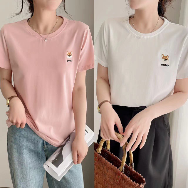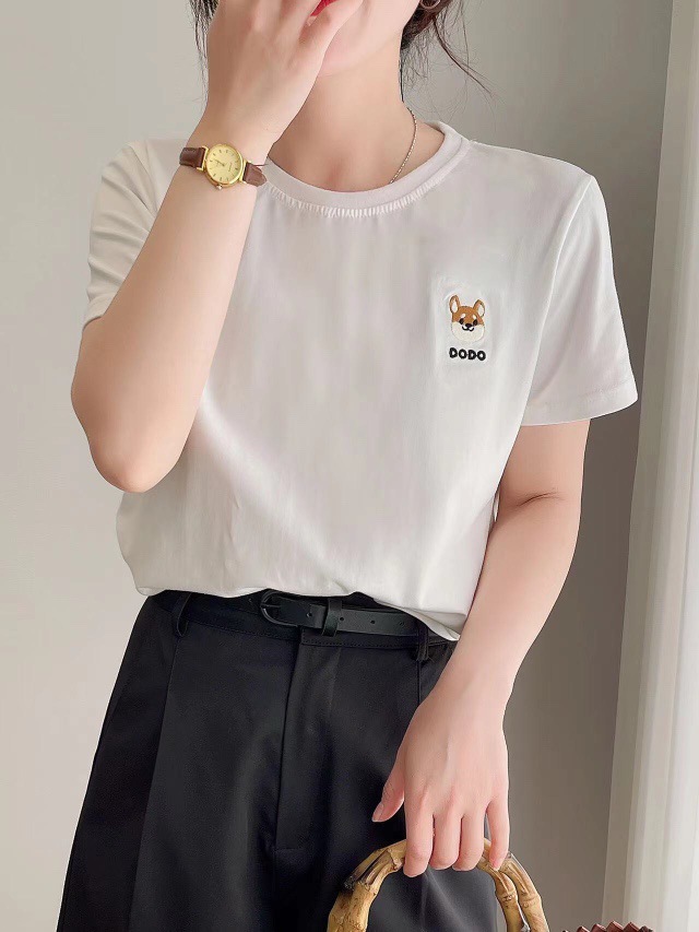 2025 새로운 도착 만화 자수 반팔 티셔츠 여성의 여름 느슨한 디자인 감각 작은 어깨 캐주얼 탑스토어 가기
